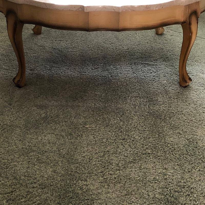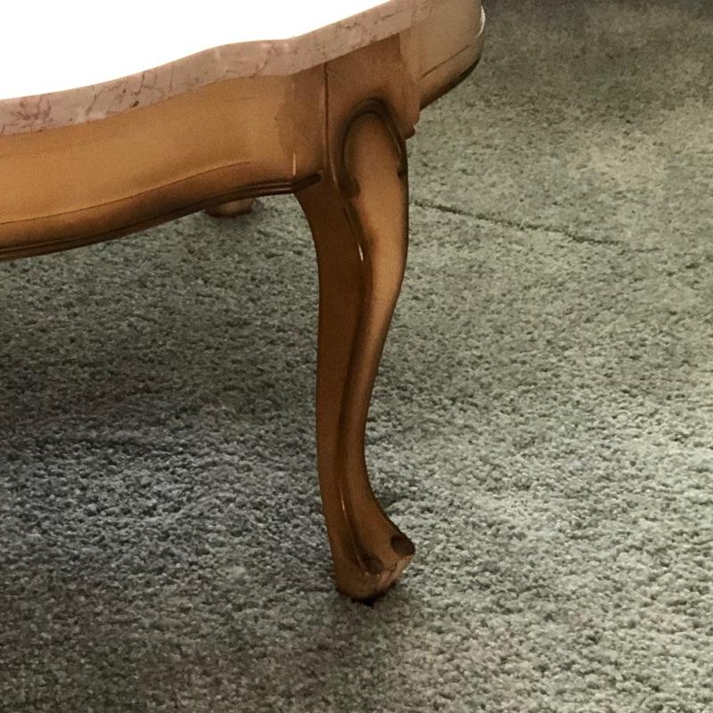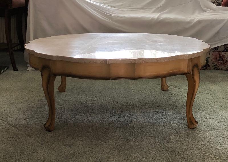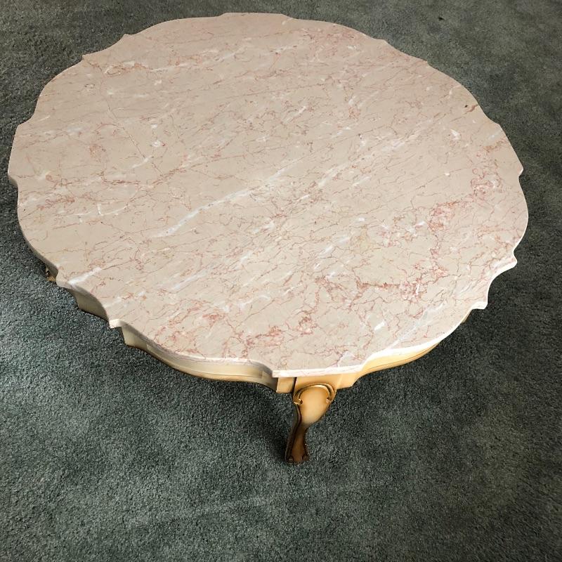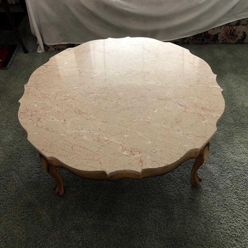 Unique and decorative wood table with a manufactured marble top that is not attached, measures 38” x 38” x 14”. Marble piece is weighty so you will need help for loading it.
