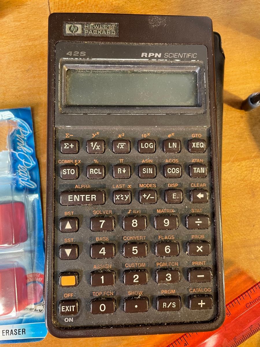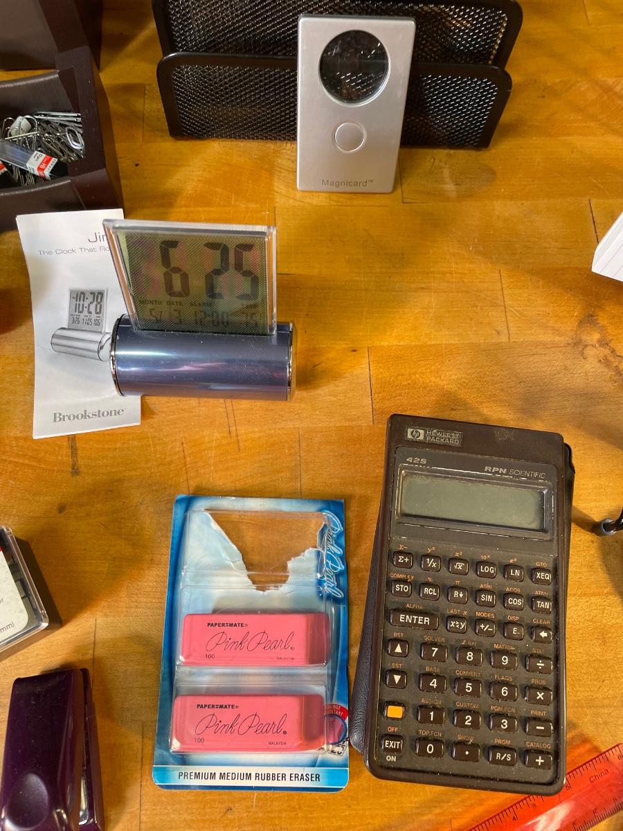 stapler and staples, mini stapler, staple-puller, 3-hole punch, pens, letter opener, comp. books, HP scientific calculator, magnifying glass, digital clock, scissors, Brown accessory set, heavy-duty flashlight