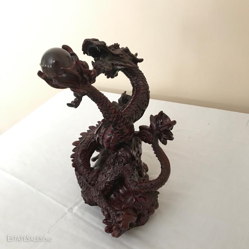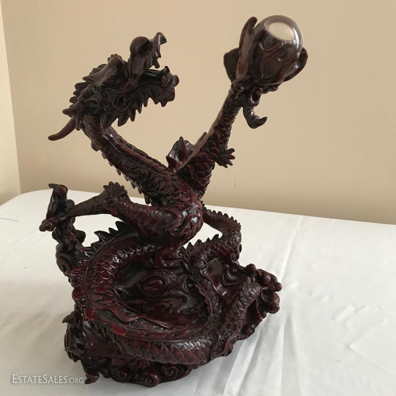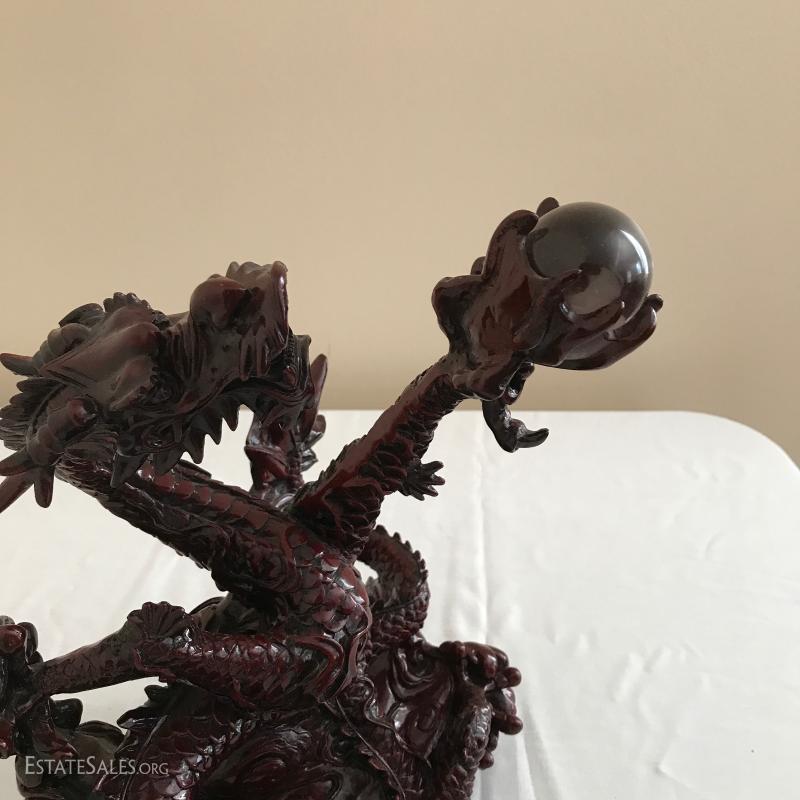 Black and maroon-colored dragon with removable crystal ball. This is a weighty piece but seems to be made of a resin. Statue measures approx. 10" x 6" x 13". This lot is available for shipping or local pick up in Mills River, NC.