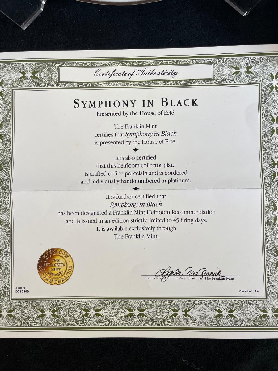 House of Erte "Symphony in Black" ltd. ed. plate w. COA