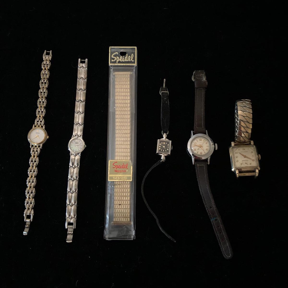 This lot includes five watches and a watch band. There is a Wittnauer, two Timex watches, one Citizen and one Seiko. The Wittnauer band seems stretched out a little. Shipping Available.