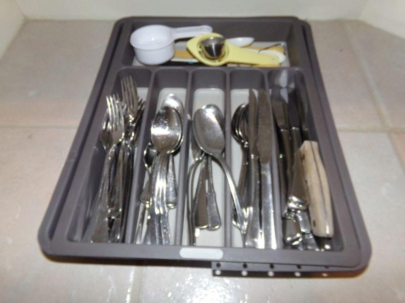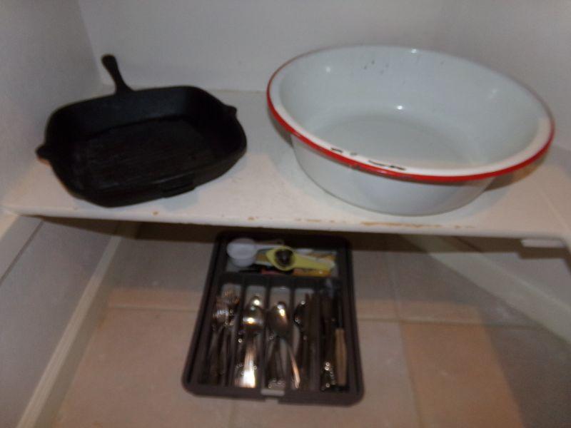 FLATWARE IN ORGANIZER, CAST IRON SKILLET AND LARGE ENAMELWARE BOWL