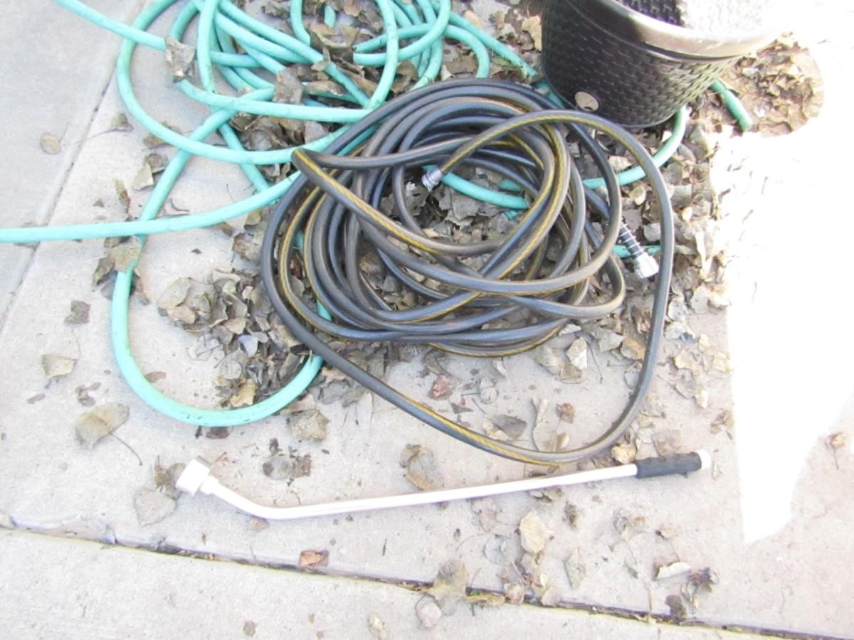 LOT 115, TWO GARDEN HOSES AND A PLASTIC HOSE HOLDER