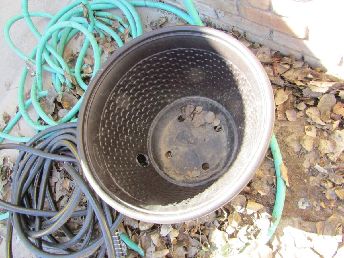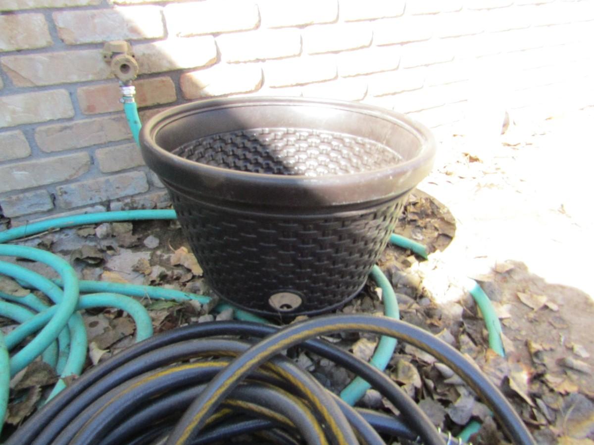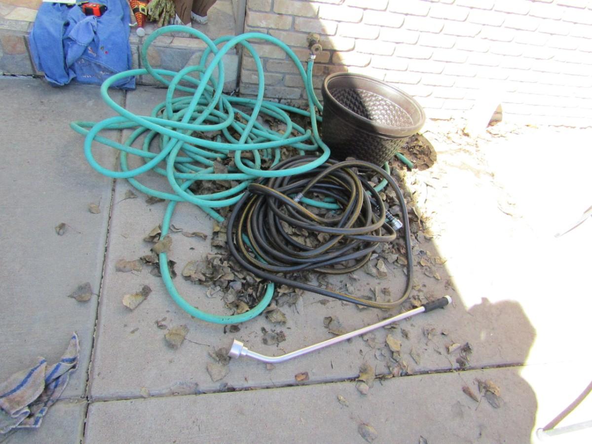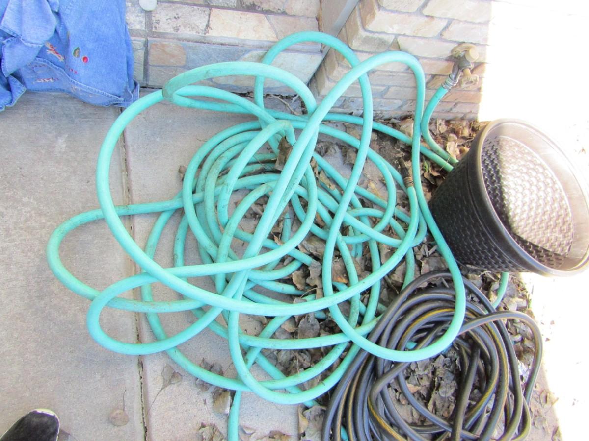2 NICE GARDEN HOSES, PLANTER, WATERING WAND AND PLASTIC HOSE HOLDER