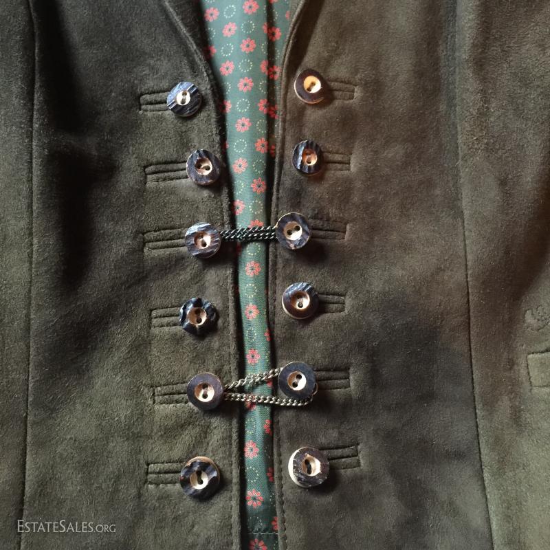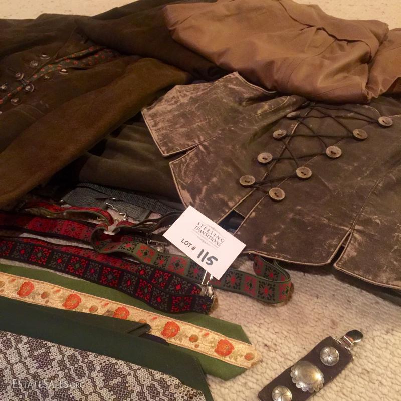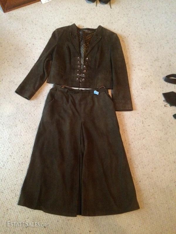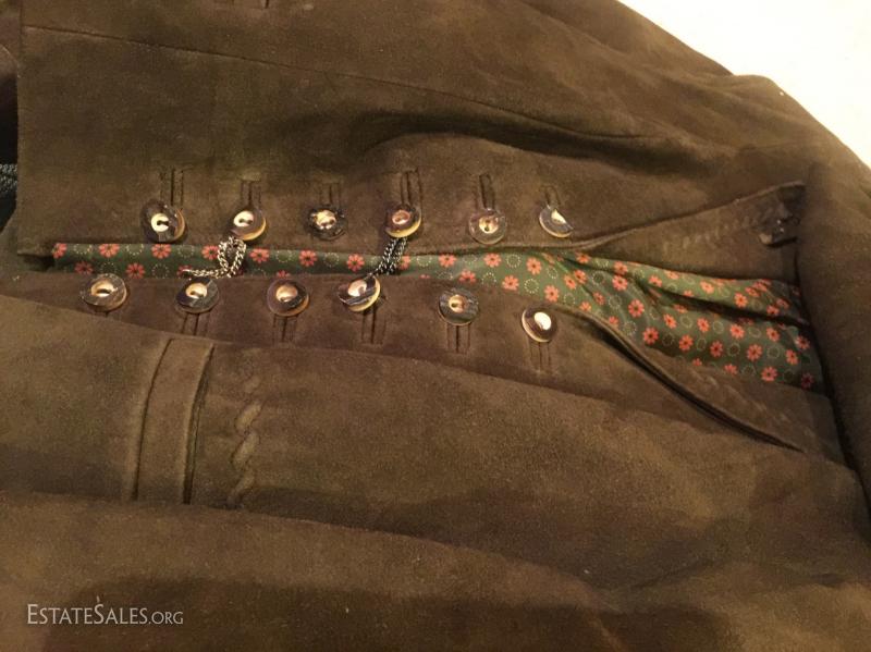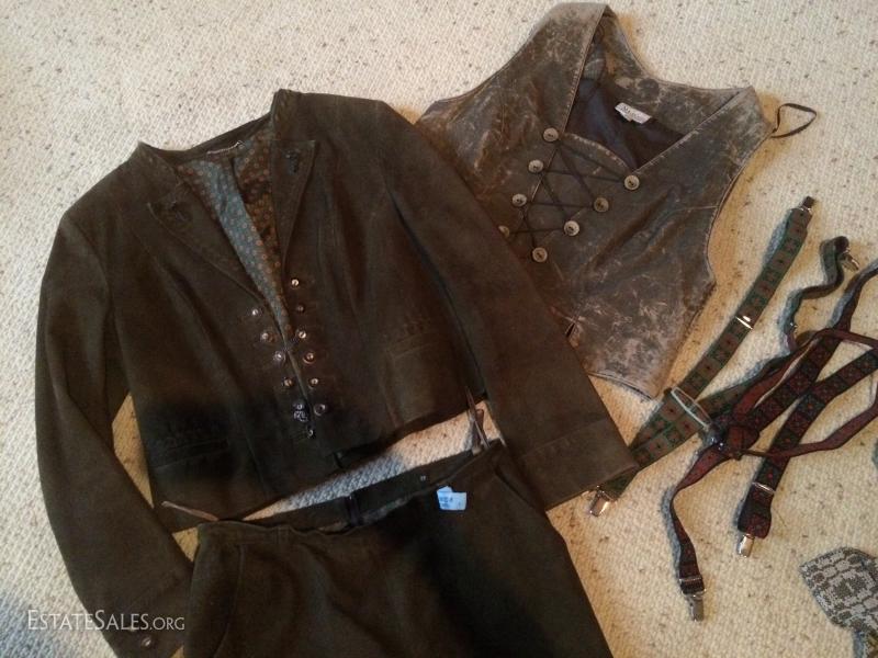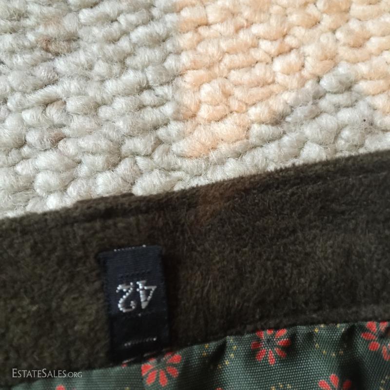 German style suede clothing and accessories. Suspenders, ties, skirts and vests. Mostly suede and leather. Non-US sizes includes 40, 42, 44.
