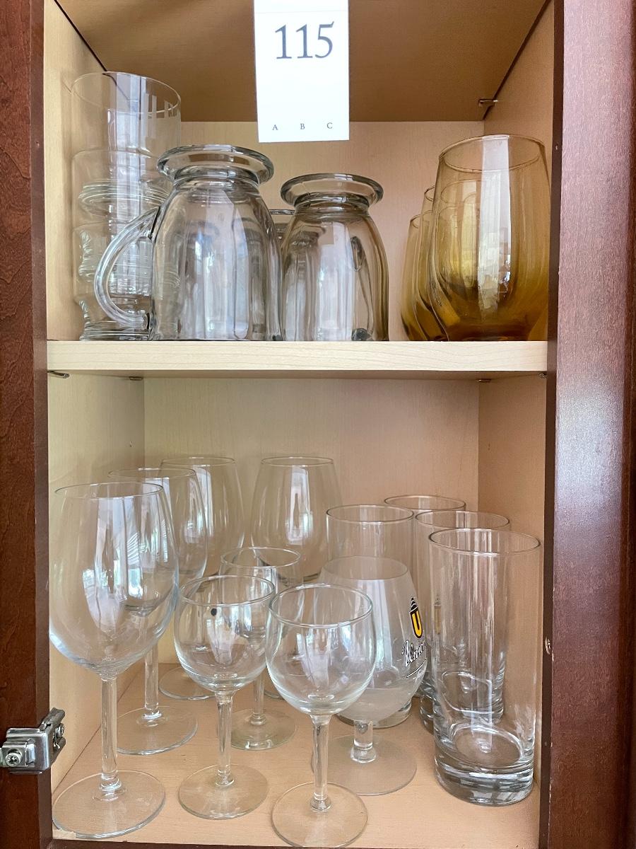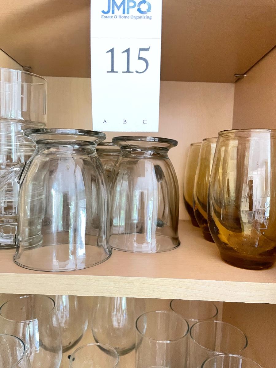 Amber glass drinking glasses. Glass handled mugs. Stemware.