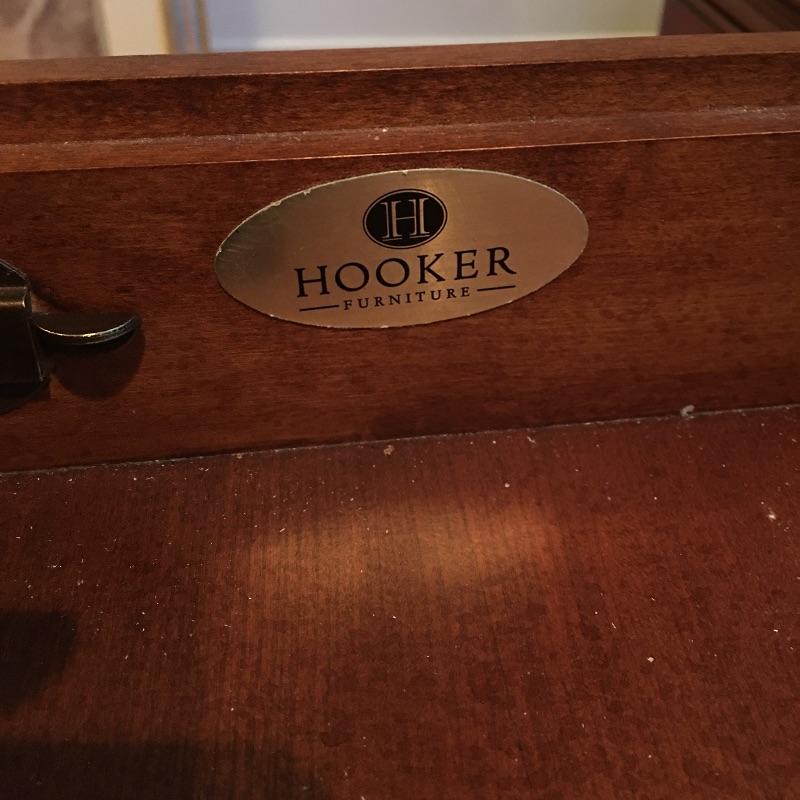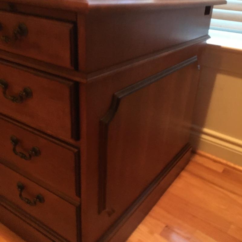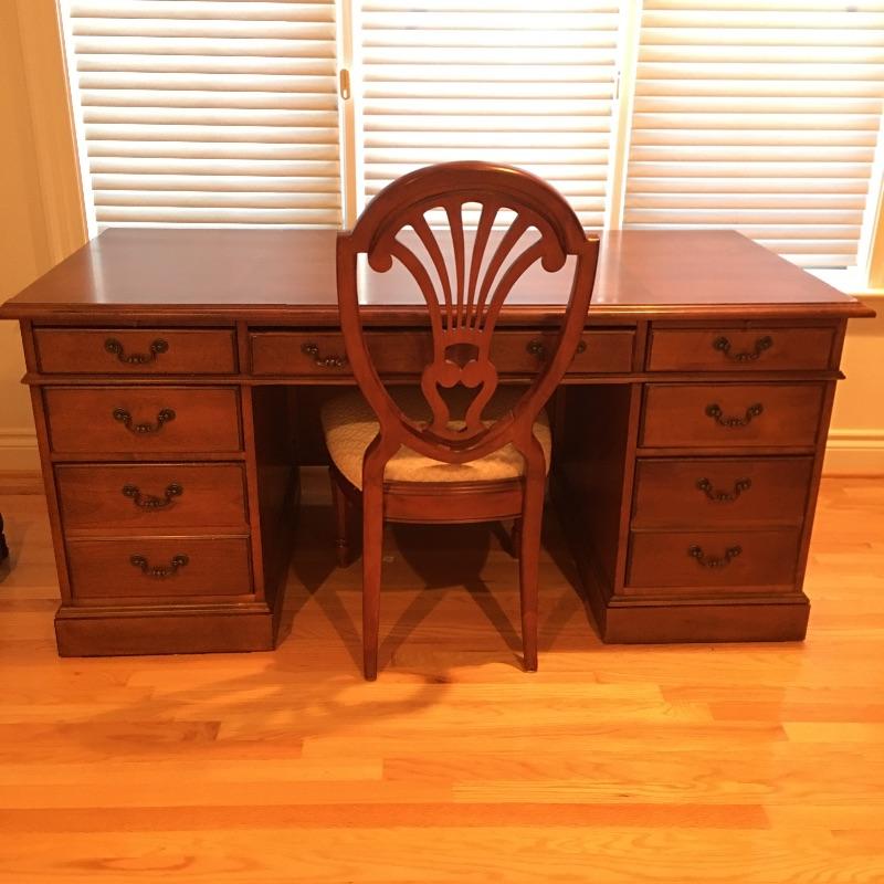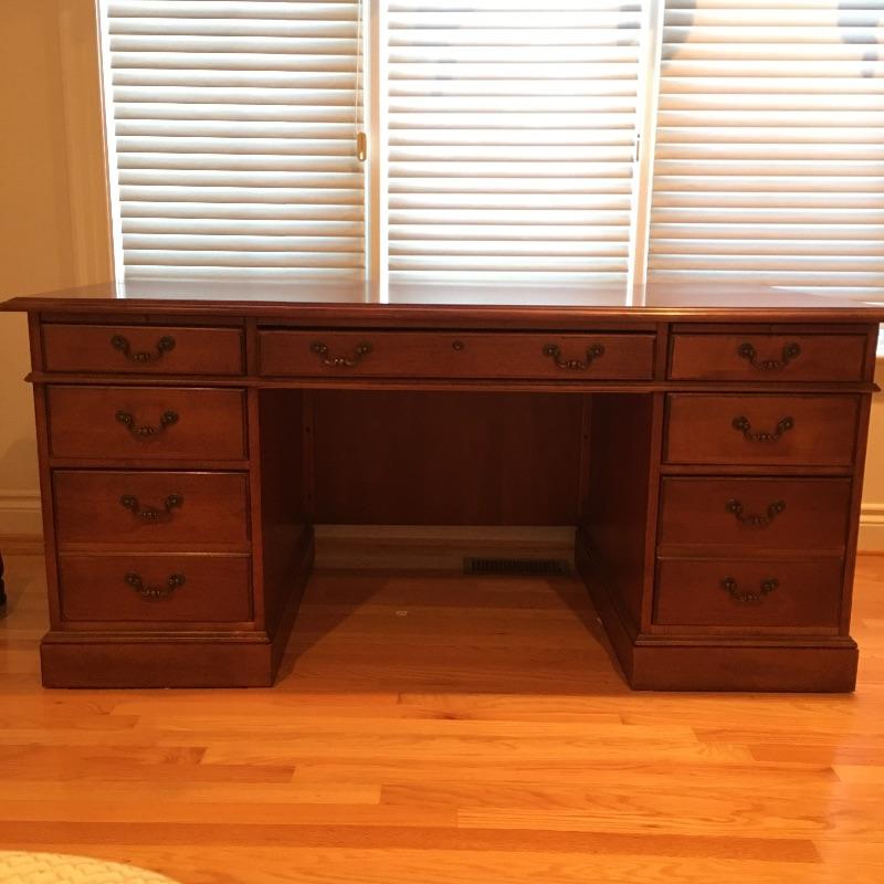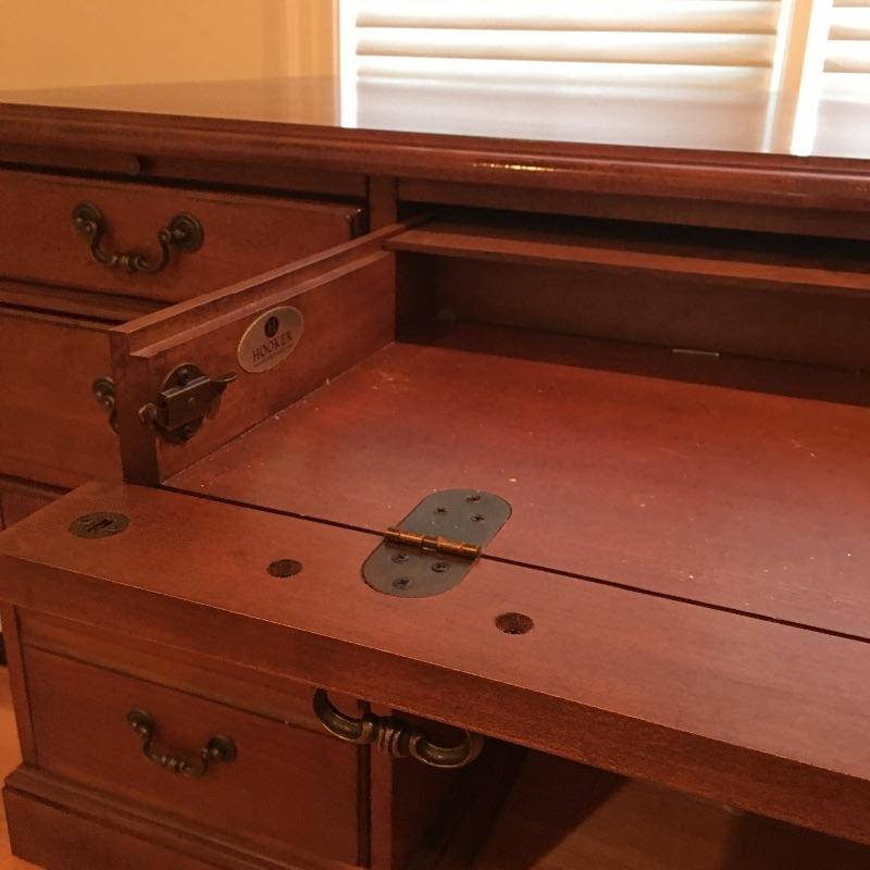 Hooker computer desk with keyboard drawer with lock and key and six dovetailed drawers with two being file drawers, and chair. Desktop has a unique design, see pictures. Don’t miss out on this handsome desk for your office or home office. Desk measures 32”x 66” x 31”. Bring help item is substantial.