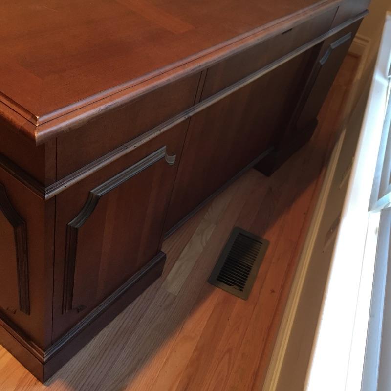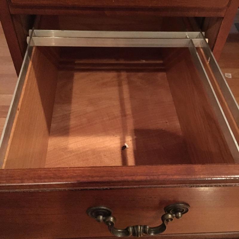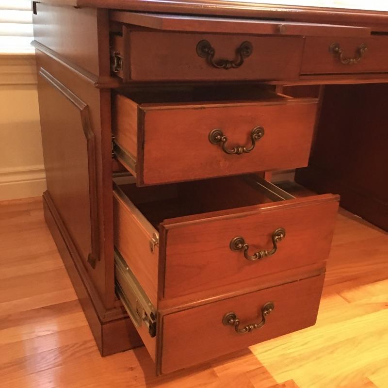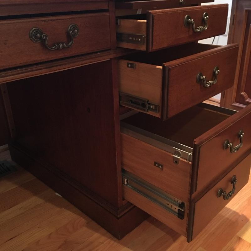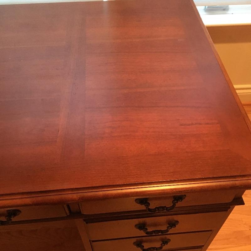 Hooker computer desk with keyboard drawer with lock and key and six dovetailed drawers with two being file drawers, and chair. Desktop has a unique design, see pictures. Don’t miss out on this handsome desk for your office or home office. Desk measures 32”x 66” x 31”. Bring help item is substantial.