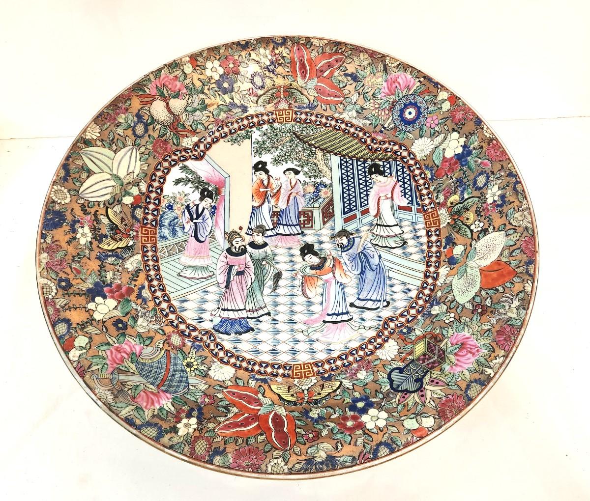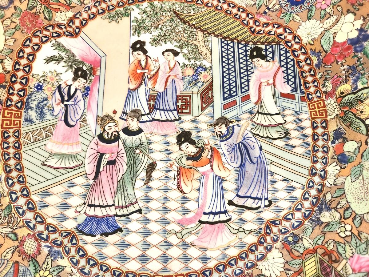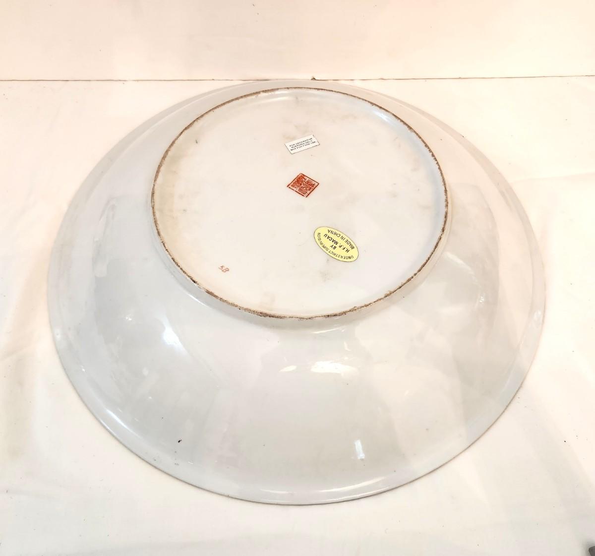 Beautiful decorative large Asian-style Center Bowl, traditional Court scene. Ceramic, good condition. 16" across, 3" tall.