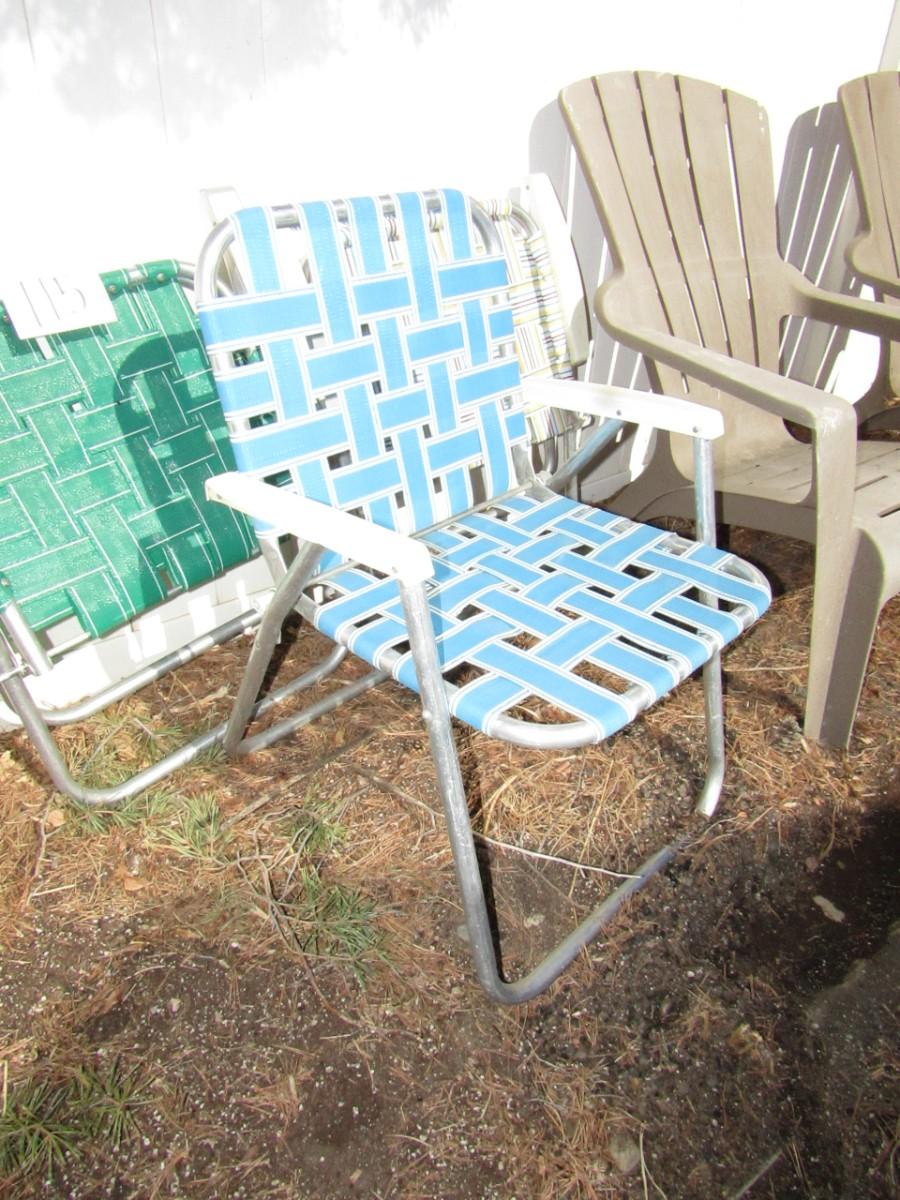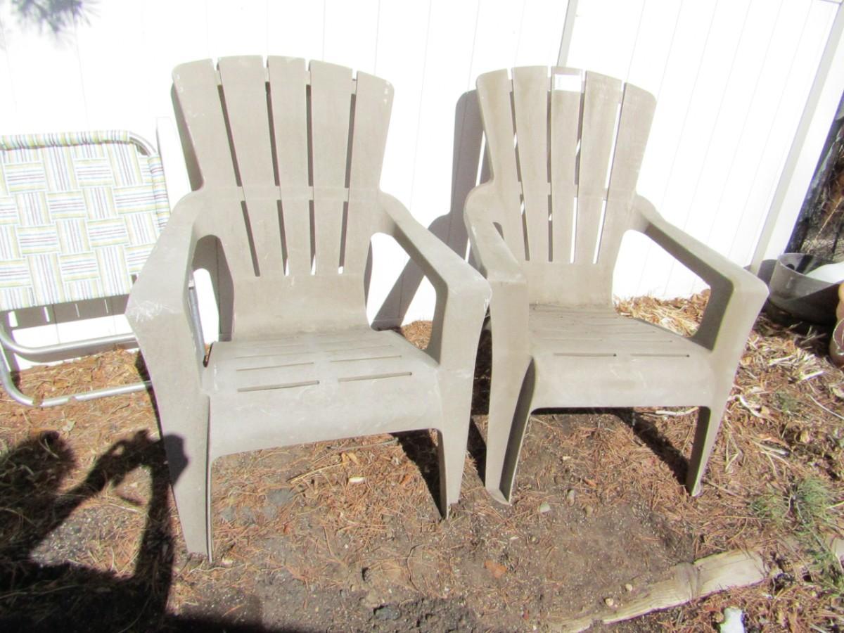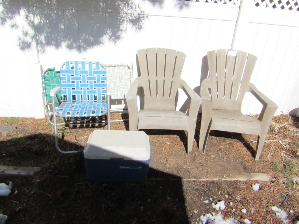 3 FOLDING LAWN CHAIRS, 2 PLASTIC PATIO CHAIRS, COLEMAN COOLER AND AN INFLATABLE A & W BALL