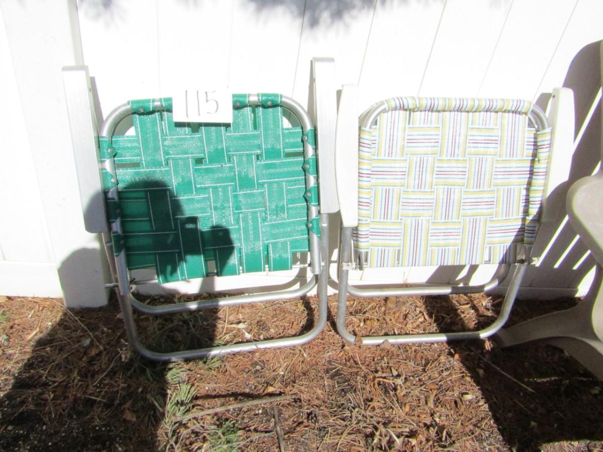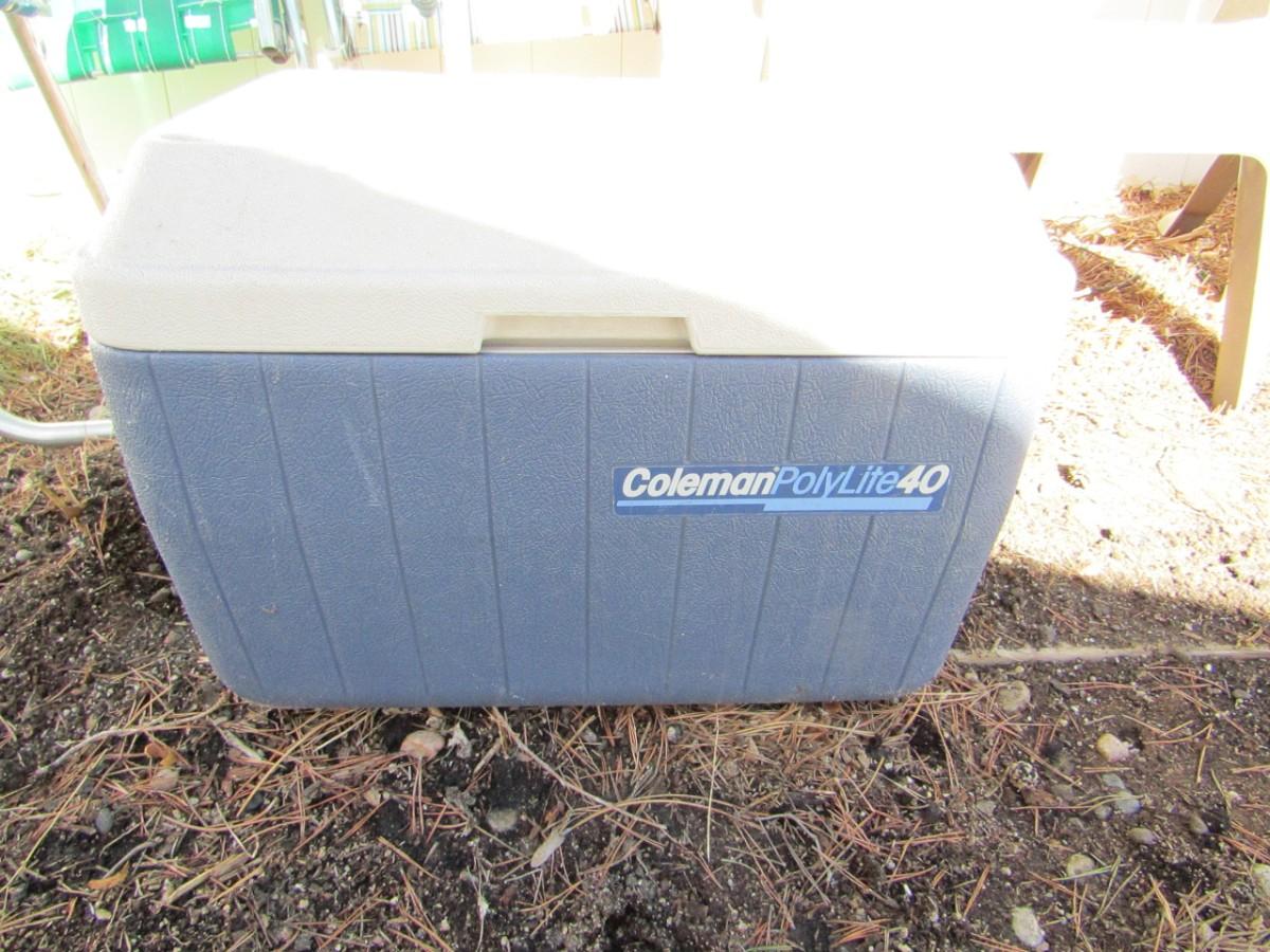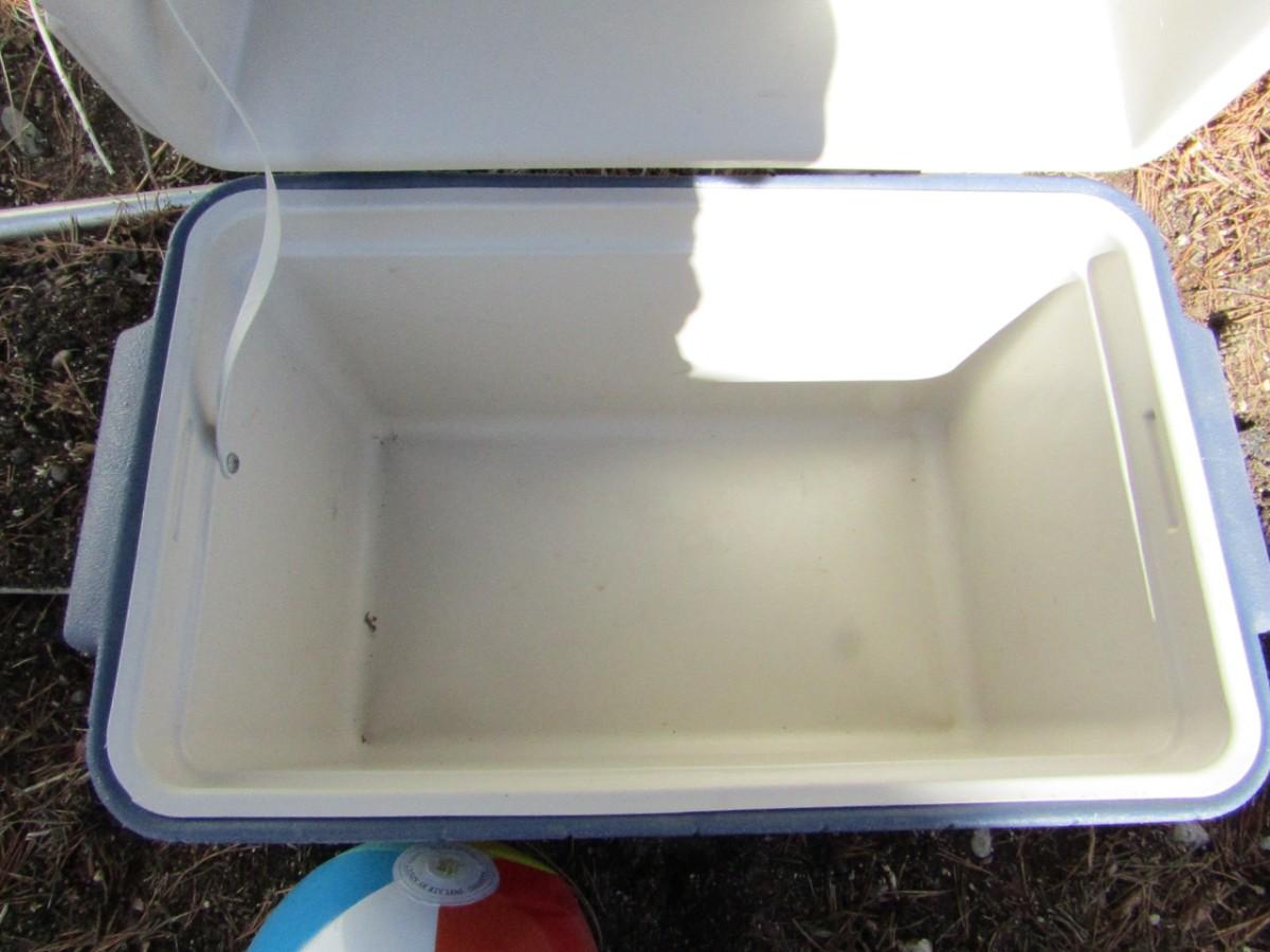 3 FOLDING LAWN CHAIRS, 2 PLASTIC PATIO CHAIRS, COLEMAN COOLER AND AN INFLATABLE A & W BALL