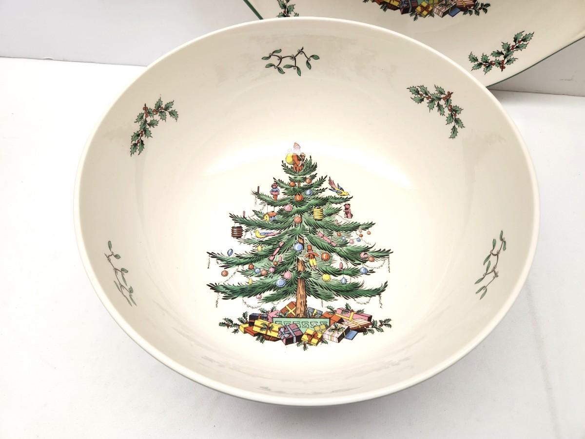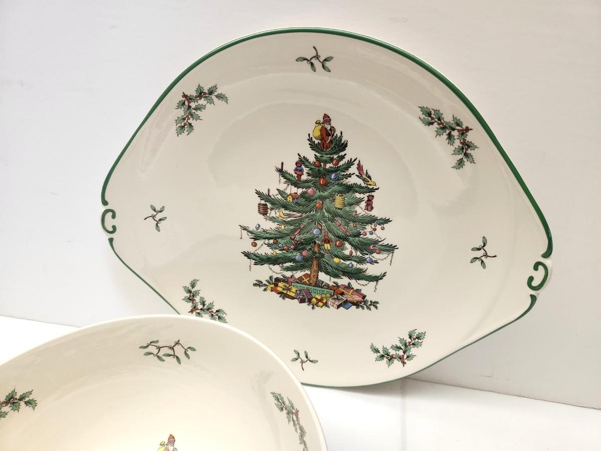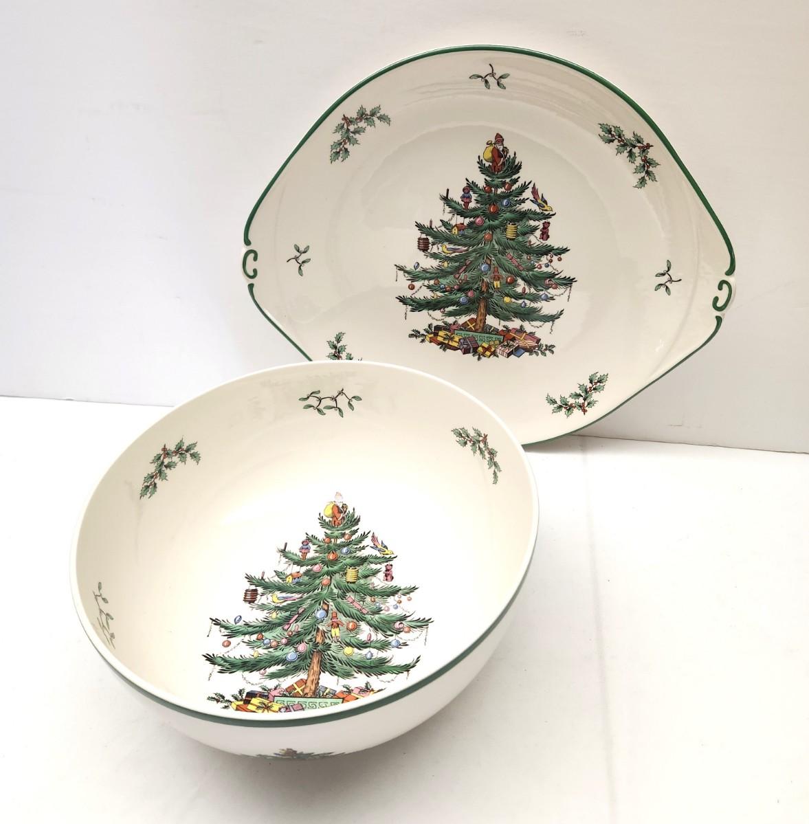 Lot of 2 Spode Christmas Tree Serving dishes - Center Bowl 9.5" across and Dessert Plate 13" across. Both in good condition. Add to your set in time for the holidays.