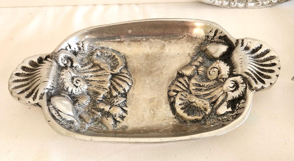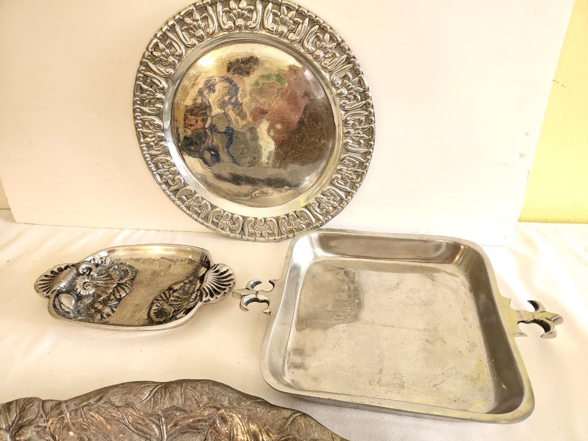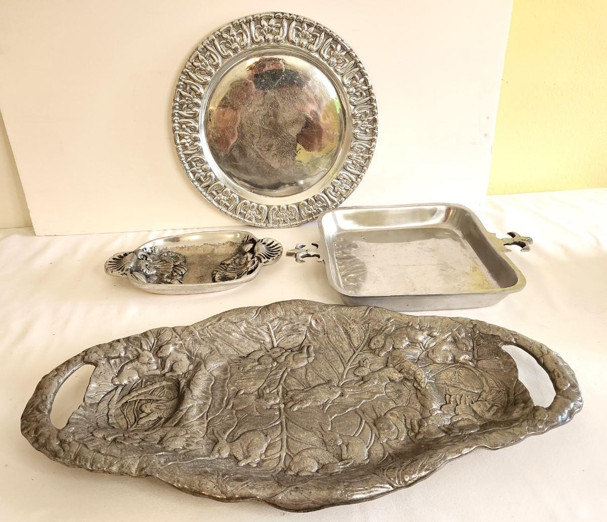 You get all you see here - 4 pieces pewter-look serving ware - all used - Largest is 21" handle to handle.