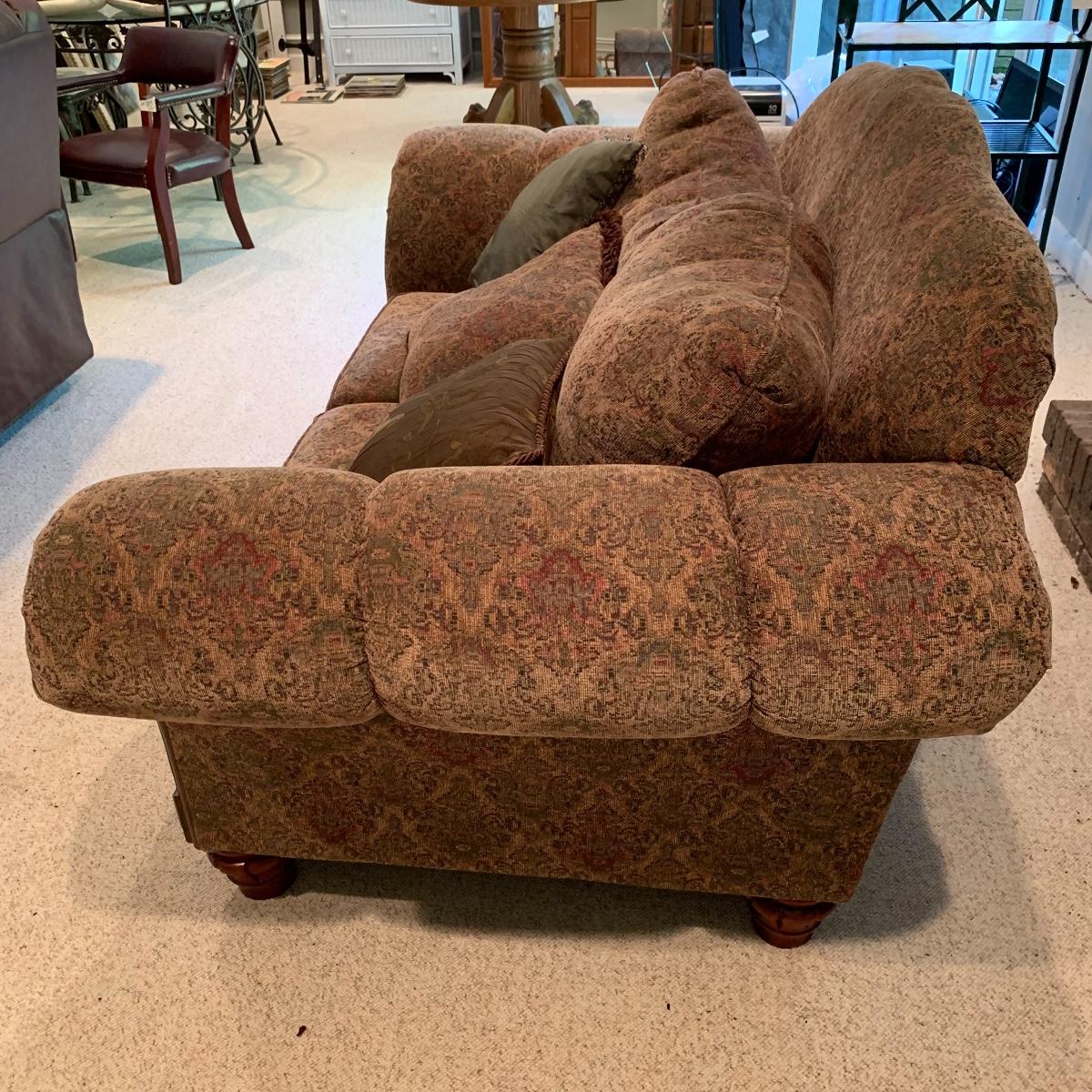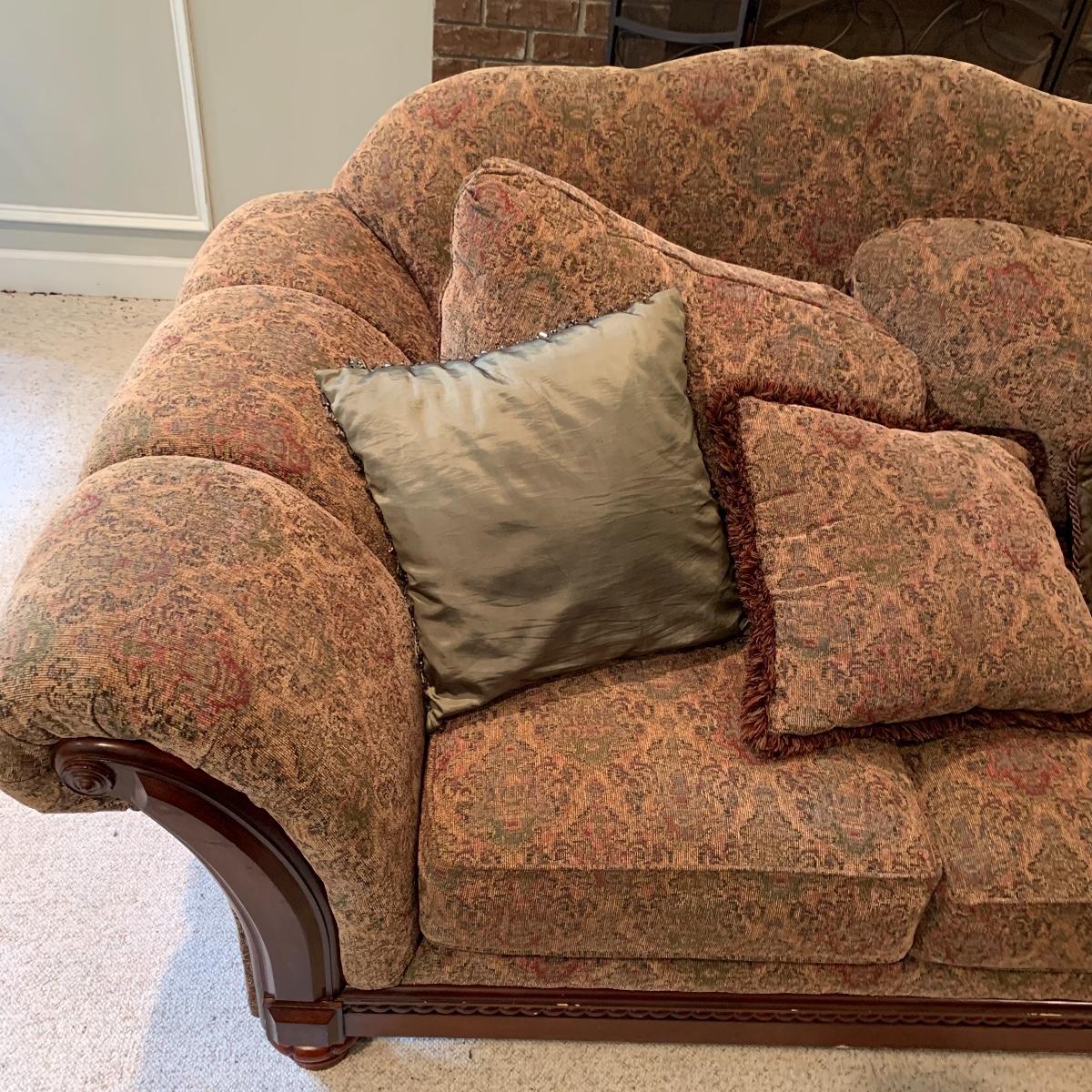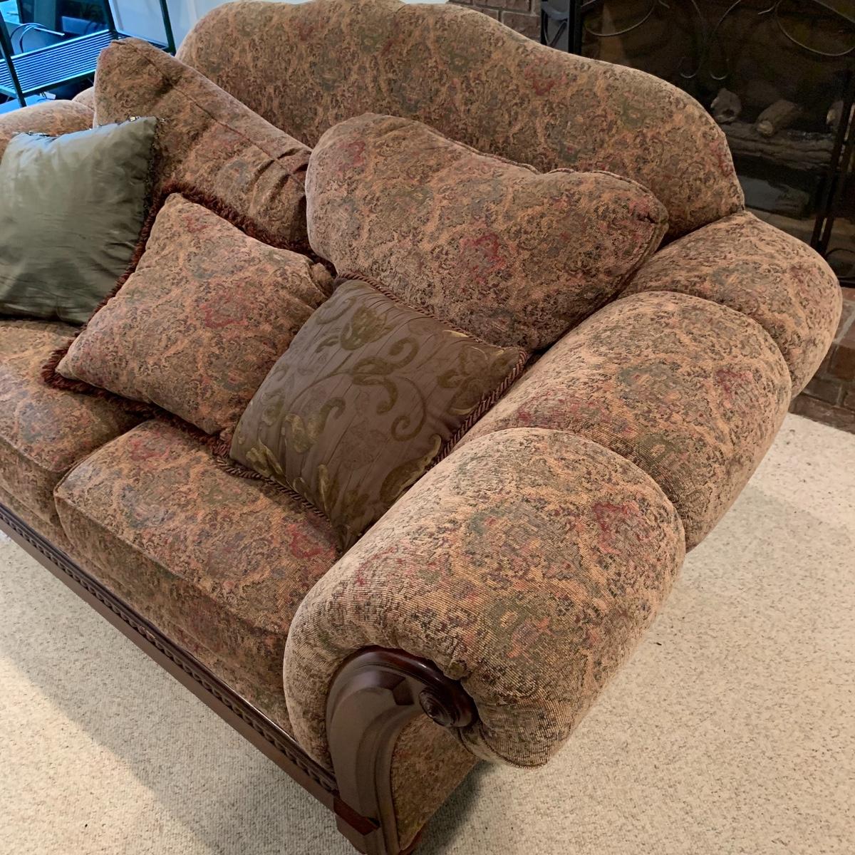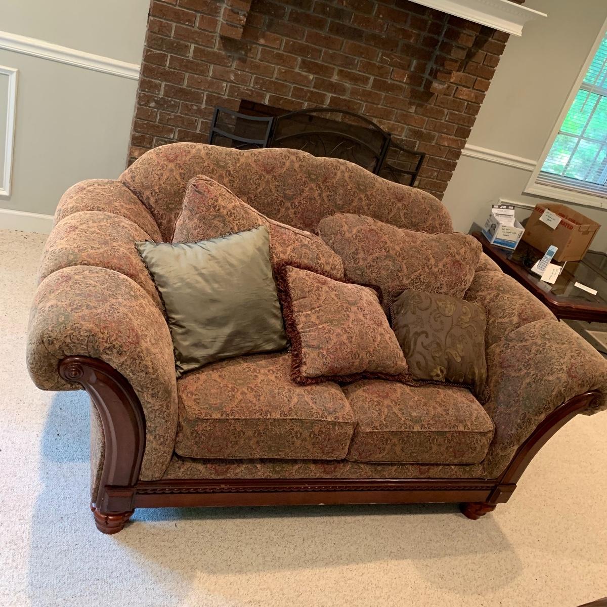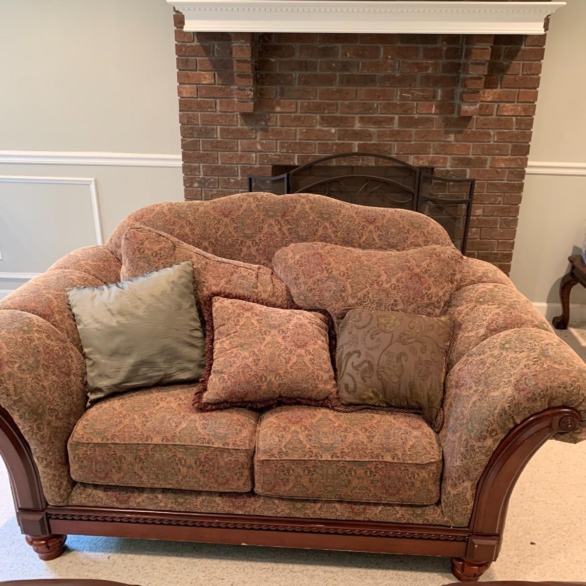 This lovely Ashley Furniture loveseat is really plush and comfortable. It is in excellent condition except for some minor scratches on the wood. It has two really fluffy back cushions and comes with three throw pillows. It measures approximately 76” x 39” x 39”. This loveseat matches the couch and chair found in lots 49 & 50. Bid on all three to get the matching set! Local pickup only. The winning bidder will need to move the loveseat from the basement of a house. Please bring assistance.