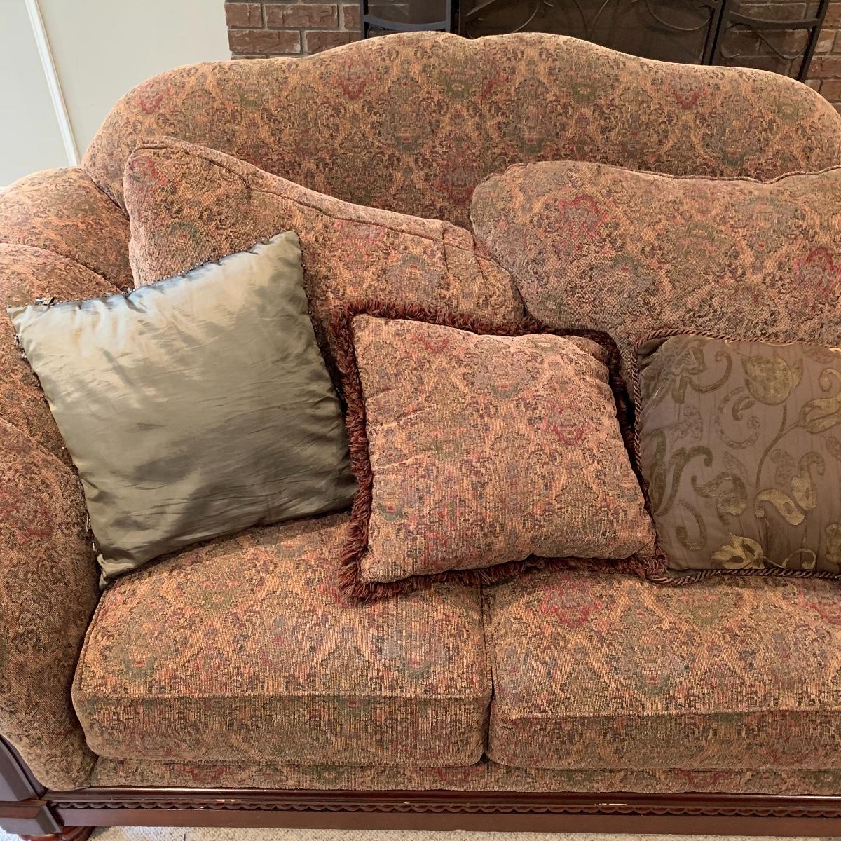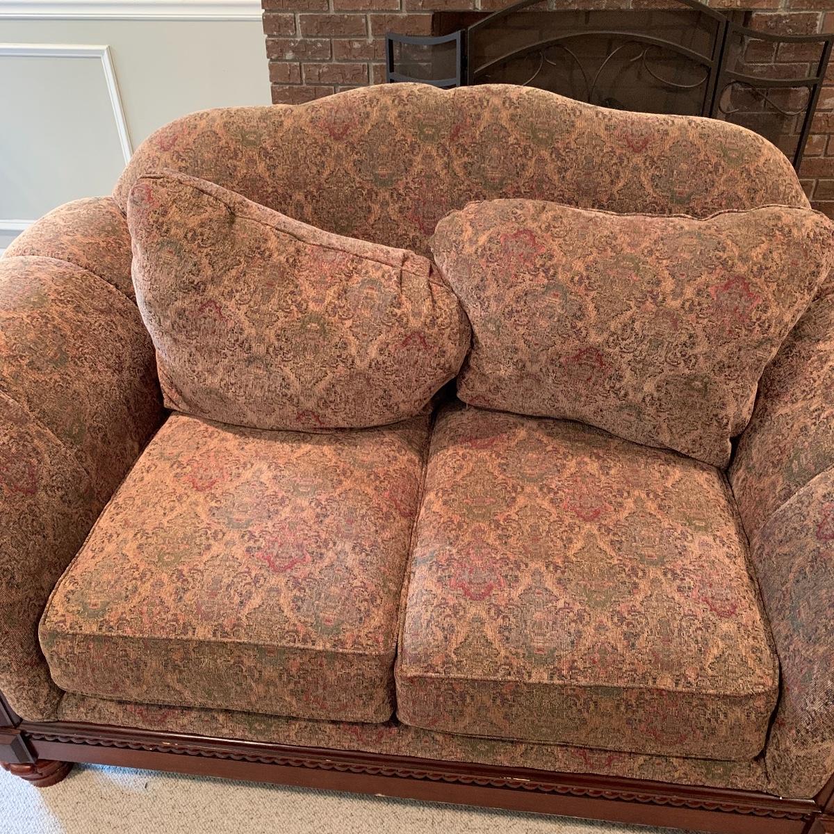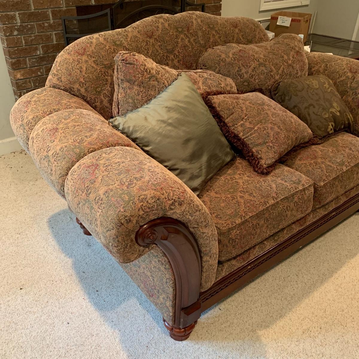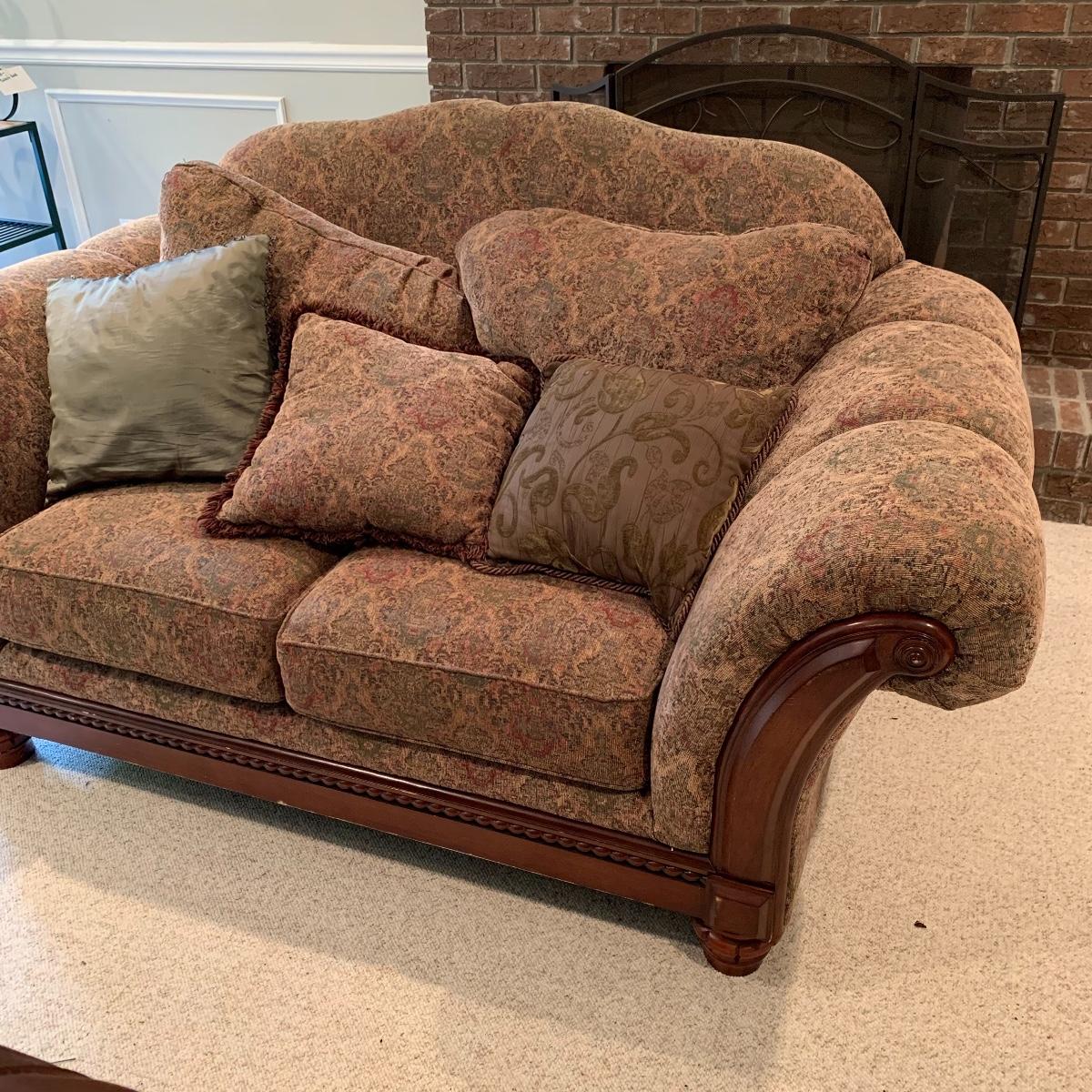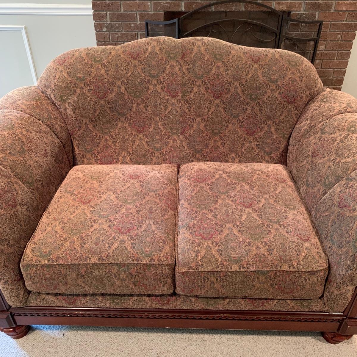 This lovely Ashley Furniture loveseat is really plush and comfortable. It is in excellent condition except for some minor scratches on the wood. It has two really fluffy back cushions and comes with three throw pillows. It measures approximately 76” x 39” x 39”. This loveseat matches the couch and chair found in lots 49 & 50. Bid on all three to get the matching set! Local pickup only. The winning bidder will need to move the loveseat from the basement of a house. Please bring assistance.