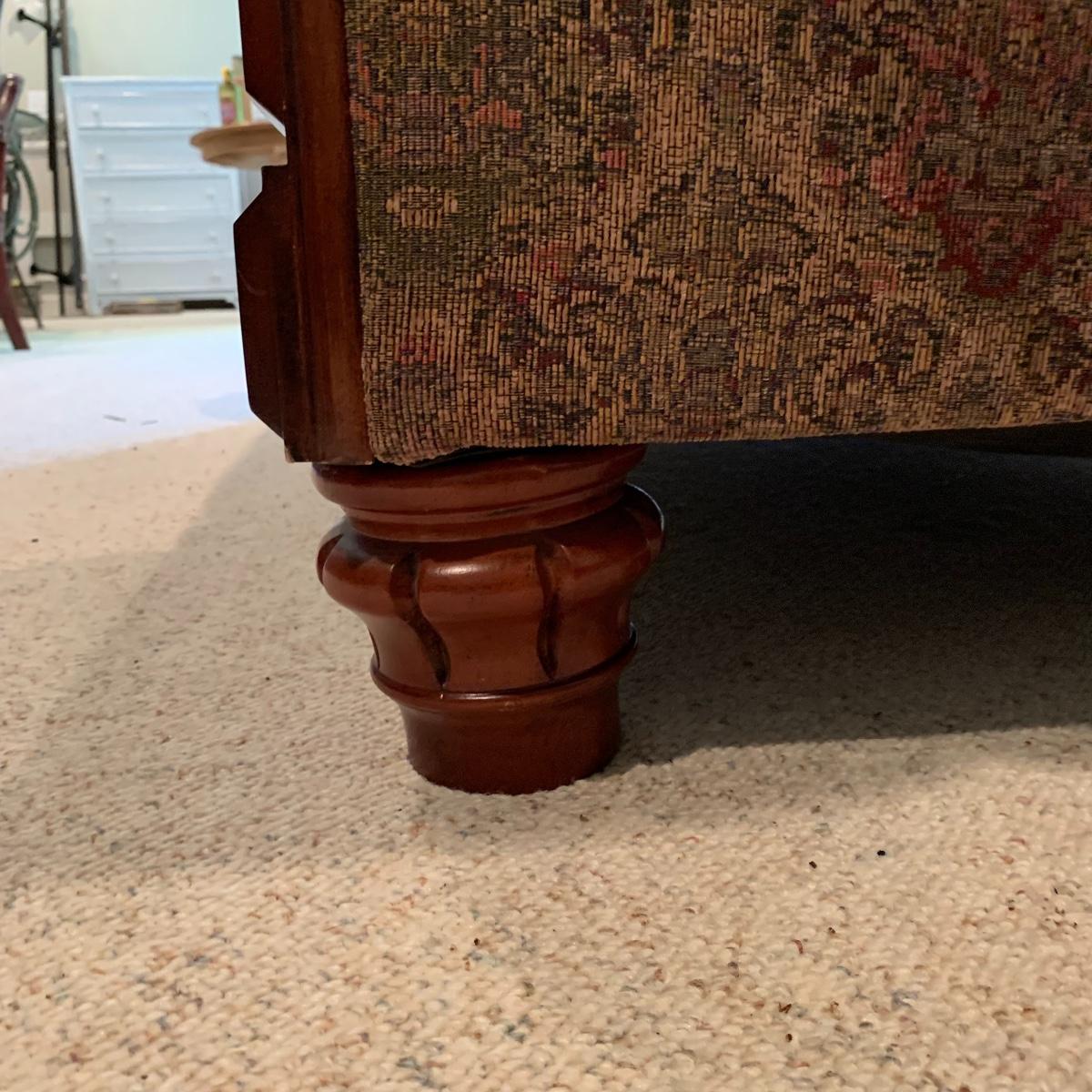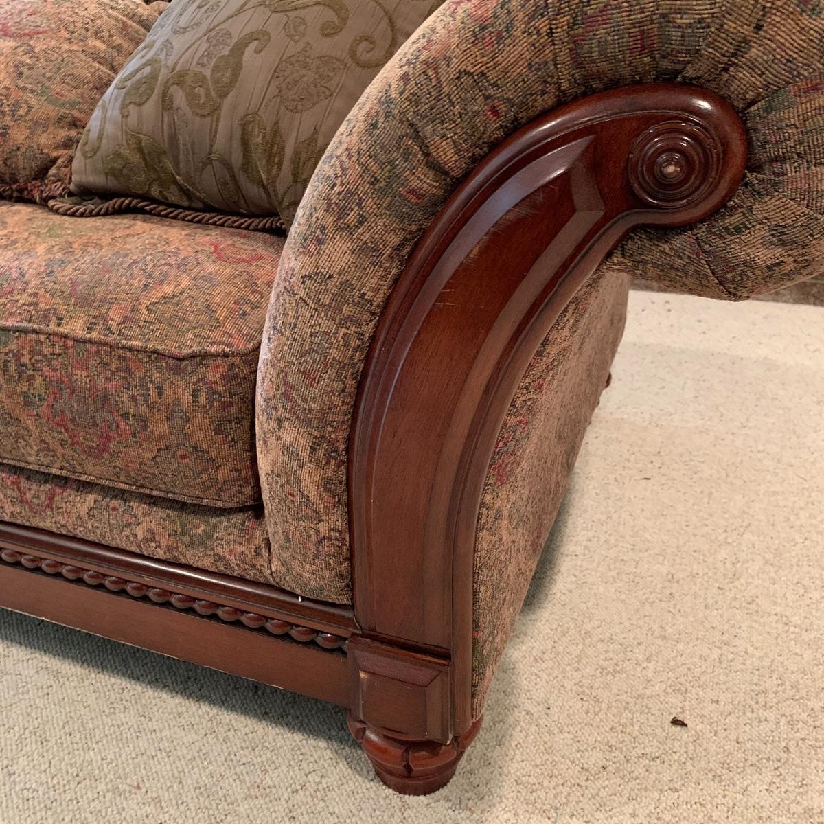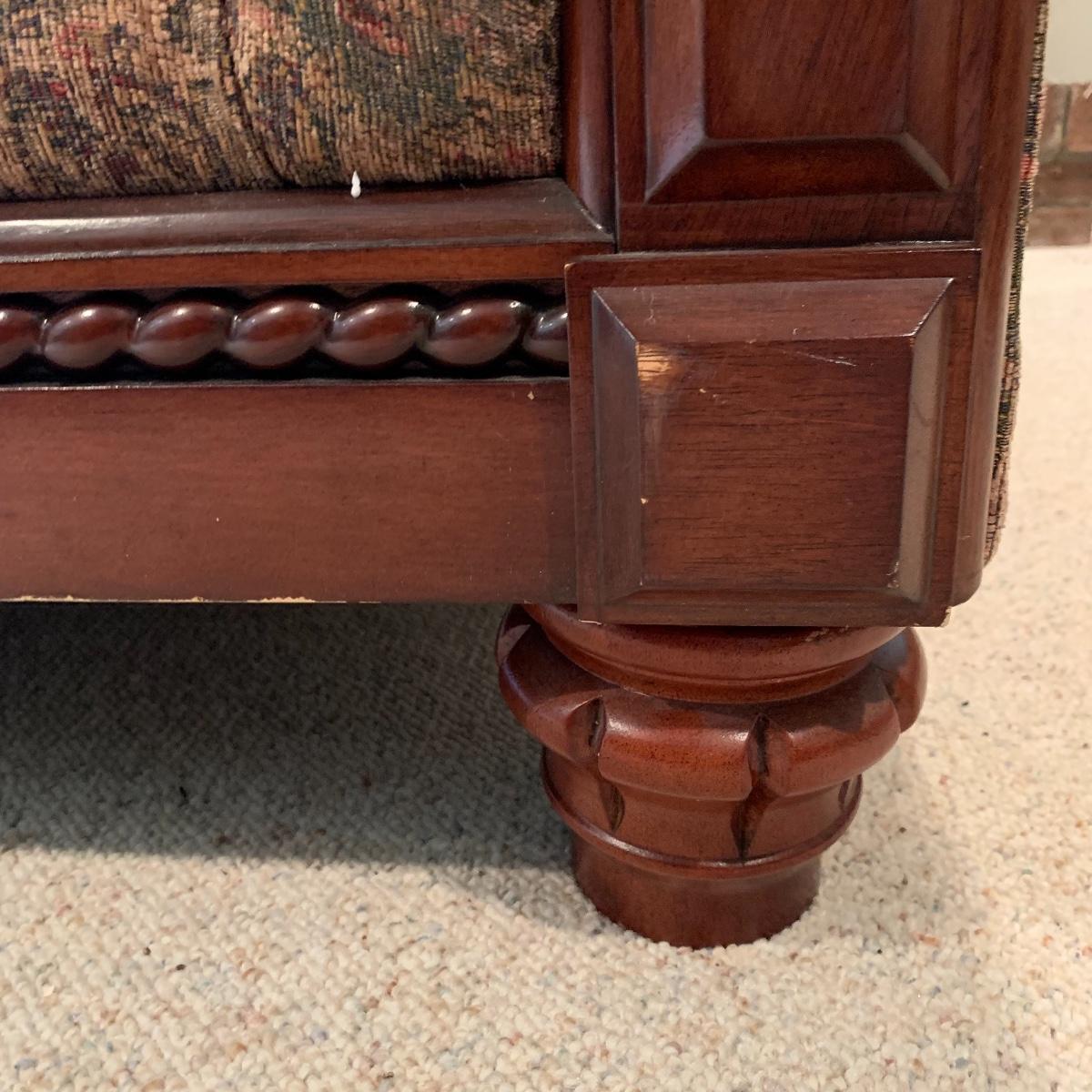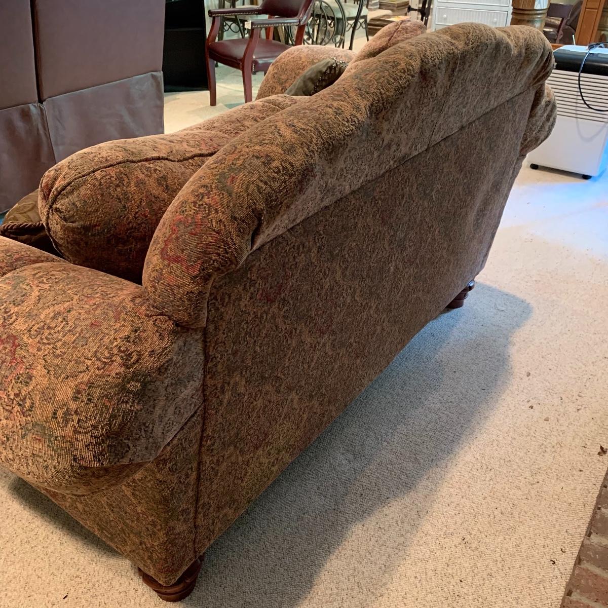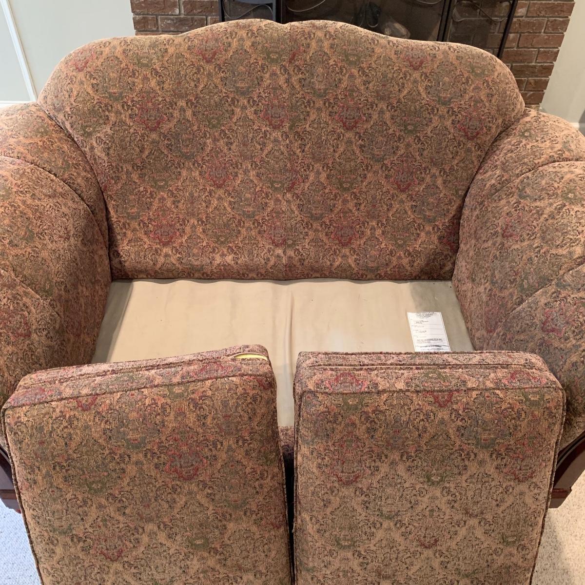 This lovely Ashley Furniture loveseat is really plush and comfortable. It is in excellent condition except for some minor scratches on the wood. It has two really fluffy back cushions and comes with three throw pillows. It measures approximately 76” x 39” x 39”. This loveseat matches the couch and chair found in lots 49 & 50. Bid on all three to get the matching set! Local pickup only. The winning bidder will need to move the loveseat from the basement of a house. Please bring assistance.