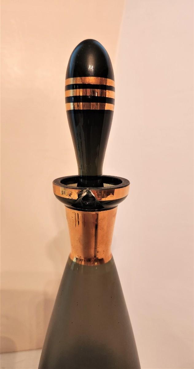 Cool Mid-Century decanter and glasses - NOTE: The decanter has a "v" shaped chip at the rim - does not show when displayed, but check the photos. Otherwise good condition. The 6 glasses are fine. Hated to just ditch the decanter so we're throwing it in. Stands 14.5" tall, glasses are 5" tall.