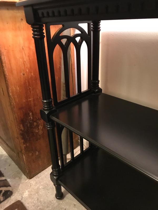 Very nice furniture store floor sample. Modern three shelf open bookcase. Black finish with gothic inspired fretwork on sides. 14" x 28" x 34" H