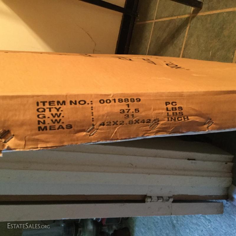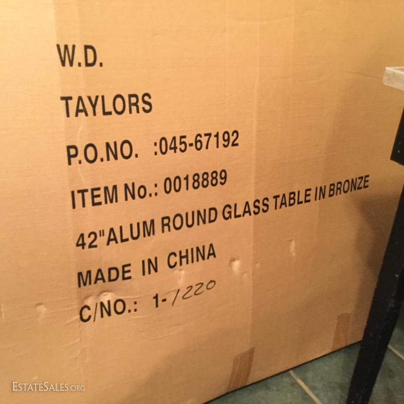 NIB 42" Alum round glass table. We did not want to unpack it but can verify its all there. This Lot is available for pick up only in Saluda, NC.