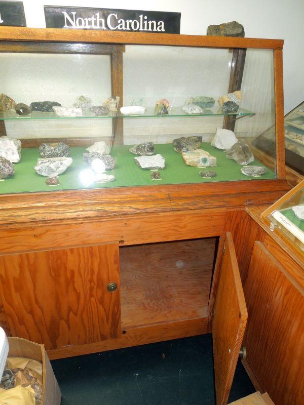 Very nice display case with a single pane 92" glass shelf running in middle and rear access. 92" L x 23" D x 54" H. Two sections with storage in base. Built in upper and lower section. Collection includes 65 total rough gem and mineral samples from NC, mostly WNC counties collected in the 60's and 70's from the collection of Claude Davis.