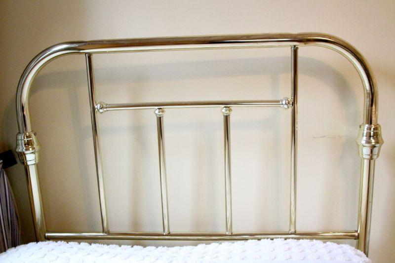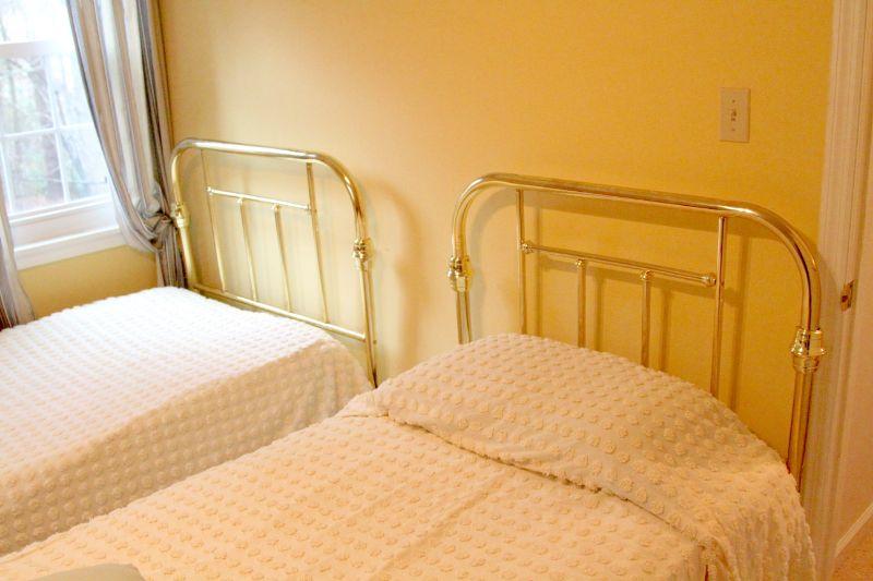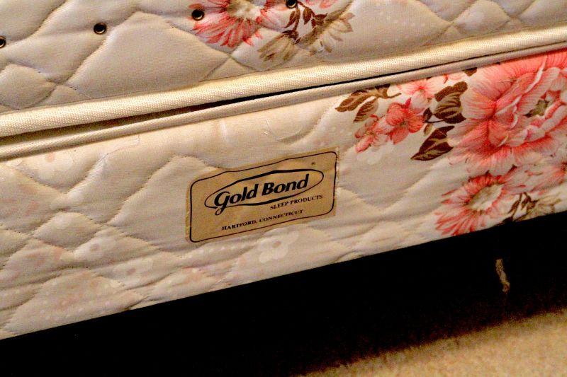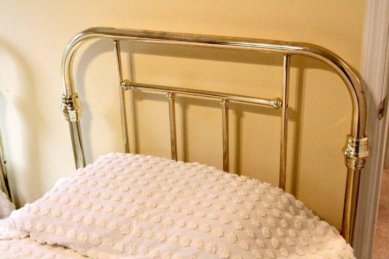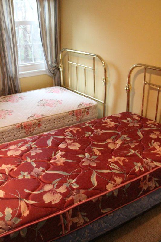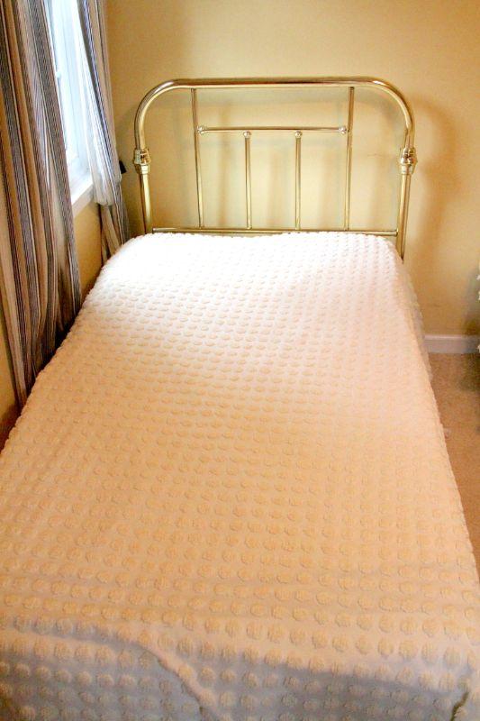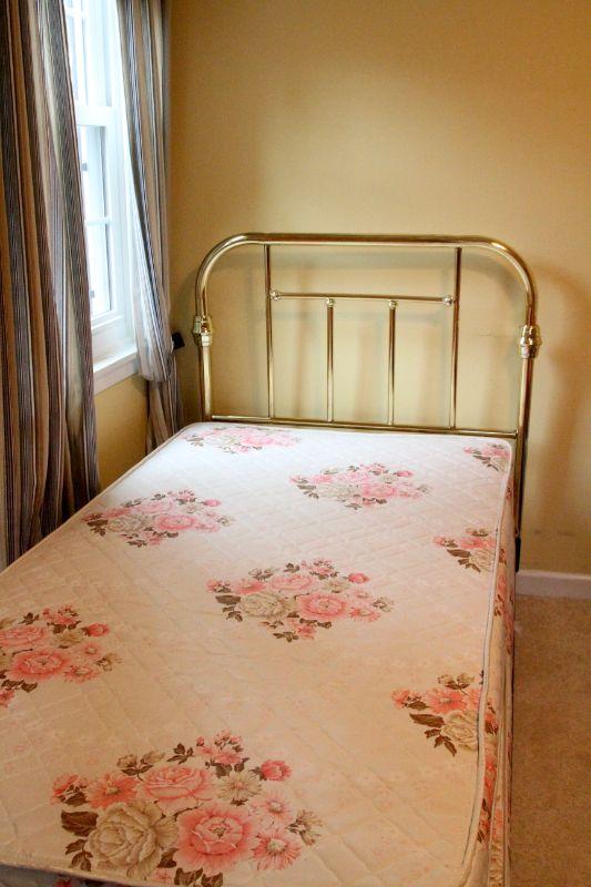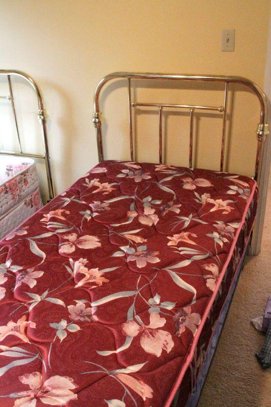 Lot 115: PAIR Brass Twin Size Beds w Vintage Spreads and Mattress Set