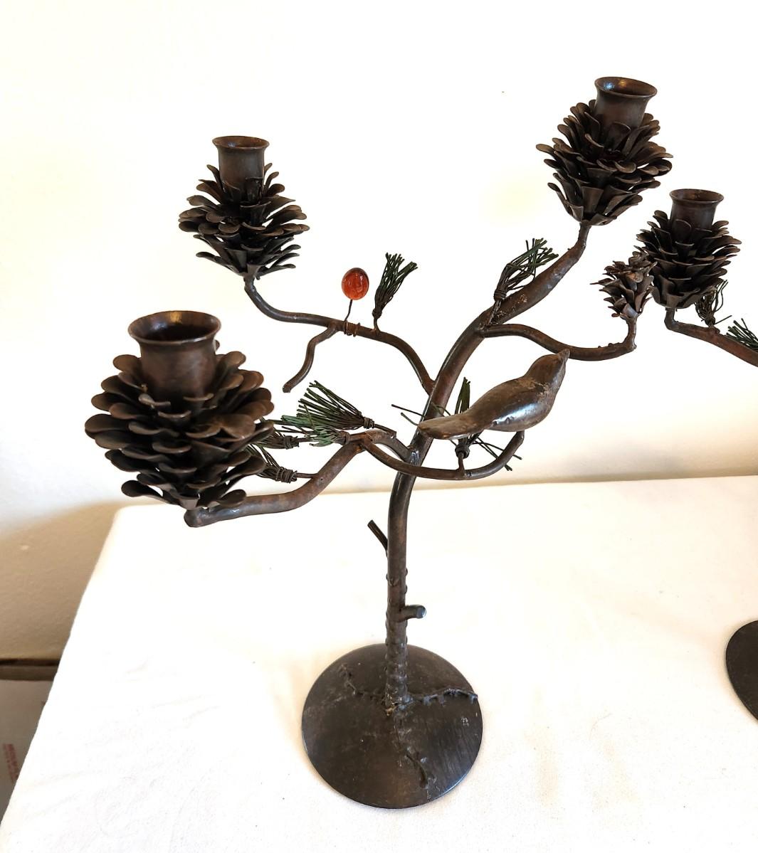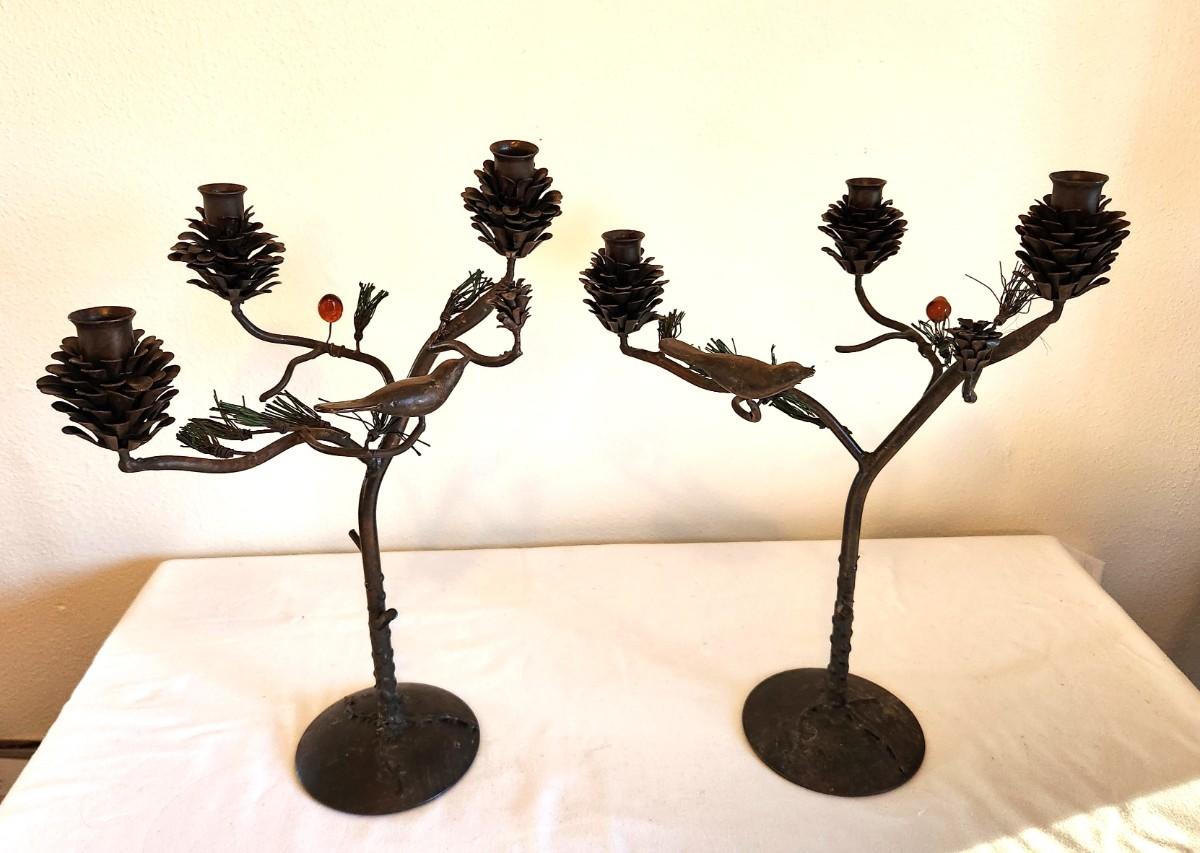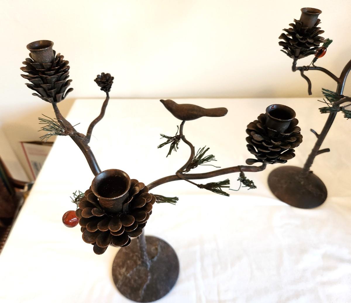 Perfect for Fall/Thanksgiving/Christmas - nice pair of heavy metal decorator candelabra - each sports a birtdand three pine cone taper candle holders, metal "pine needle" trim - stands 17.5" tall at tallest point. These have a lovely rustic "farmhouse" look. These would look great with red taper candles and sitting in a nest of real pinecones.
