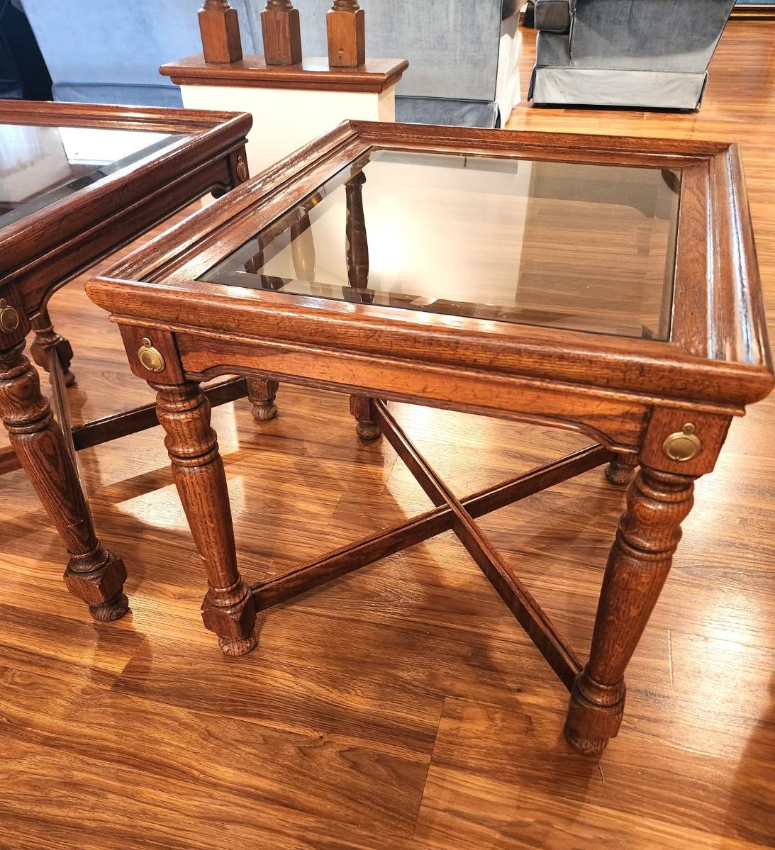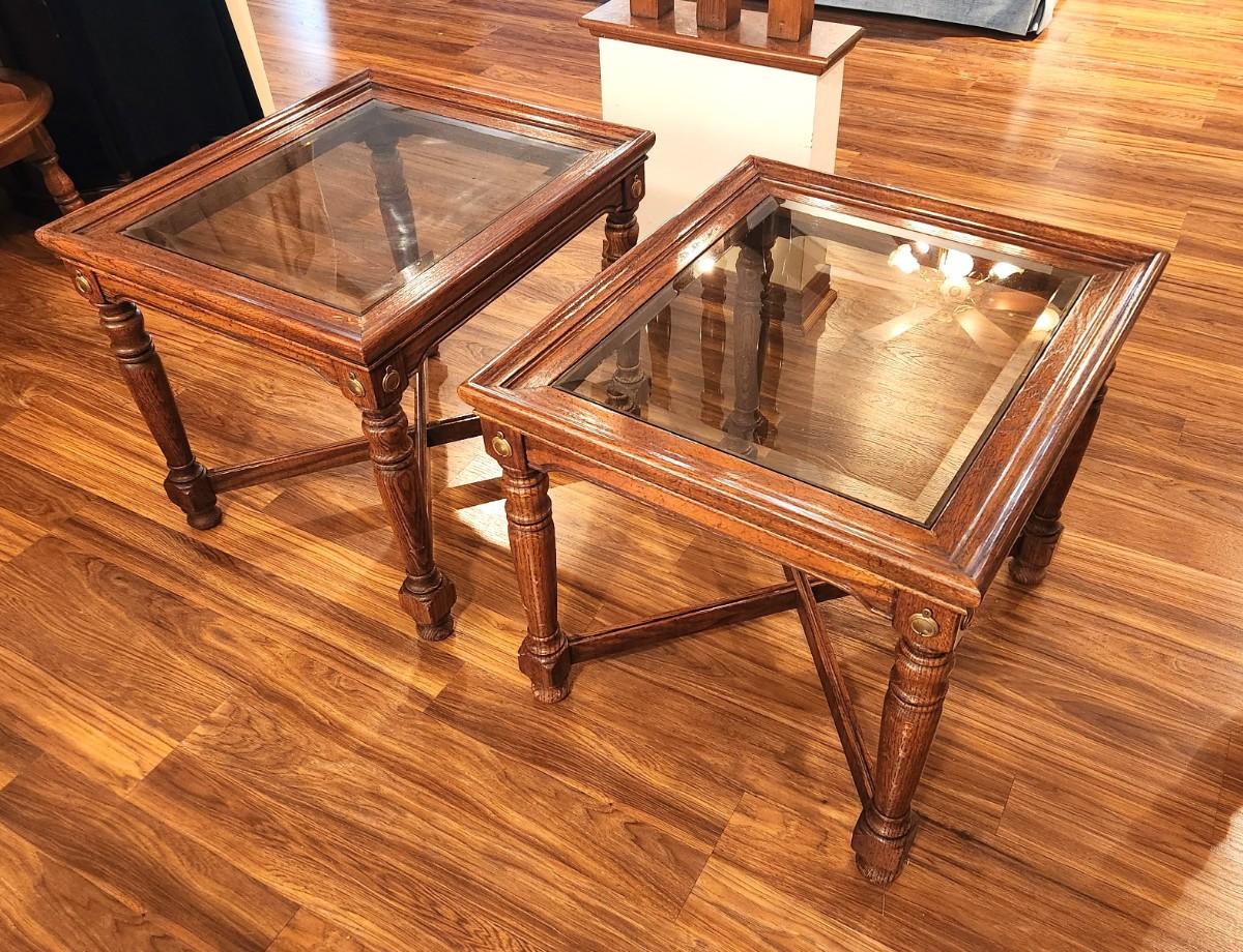 Nice pair of beveled glass map tables - each measures 22" x 25", 21" tall. These match the coffee table in Lot #107. Good conditions.