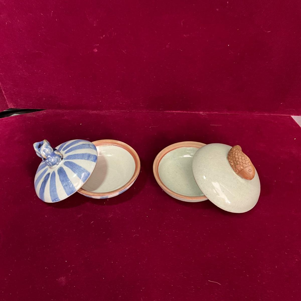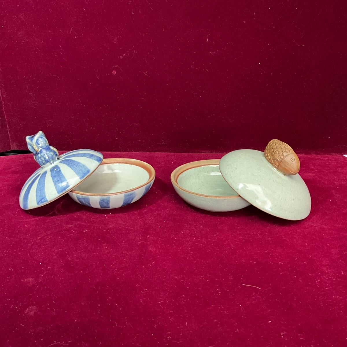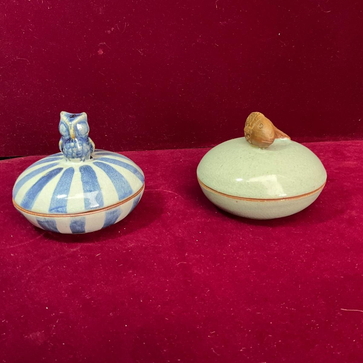 1) Topaz ceramic trinket box with blue glazed owl, and it’s striped 4 inches round