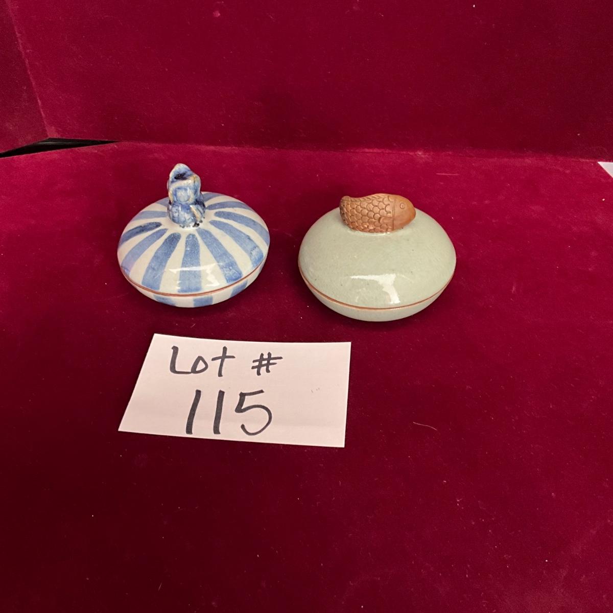 1) celadon ceramic jar with lid with a Koi fish 4 inches round