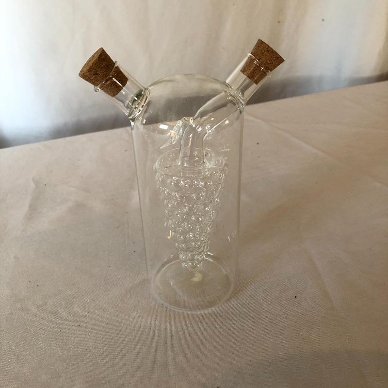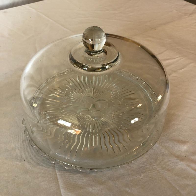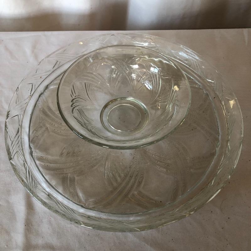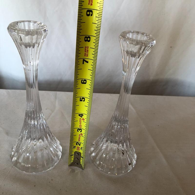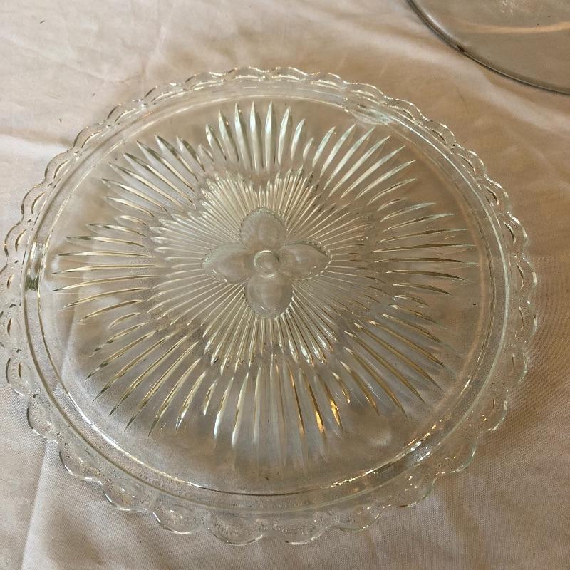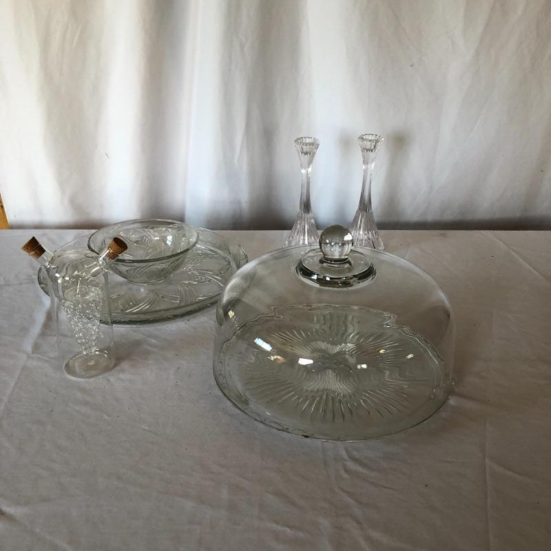 This lot includes crystal like candle stick holders, cake plate with cover, chip and salsa bowl/appetizer bowl and oil and vinegar cruet set. Shipping available.
