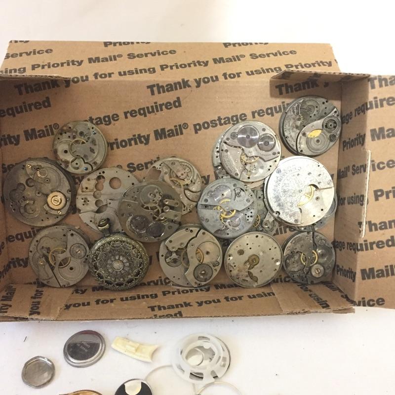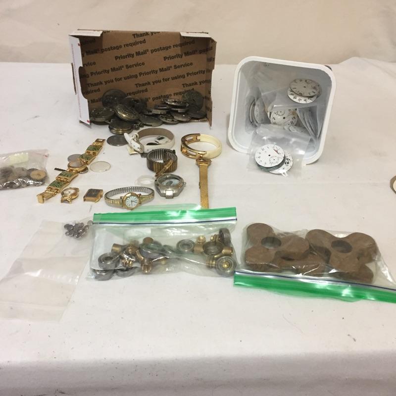 This lot includes Pocket watches, lots of watch parts including watch faces, bands, batteries and more. Also parts for Fidget spinners.