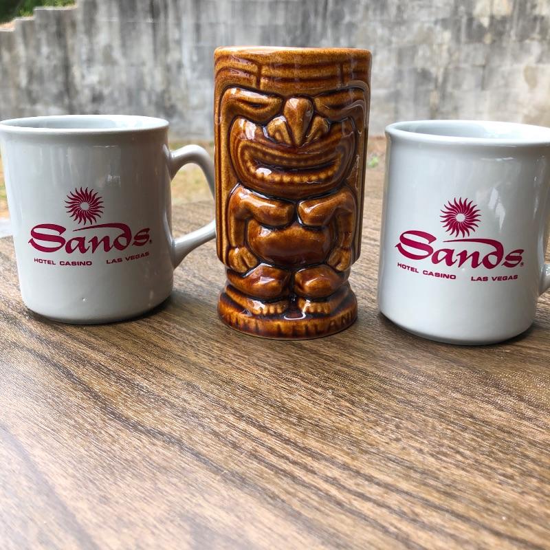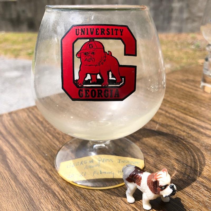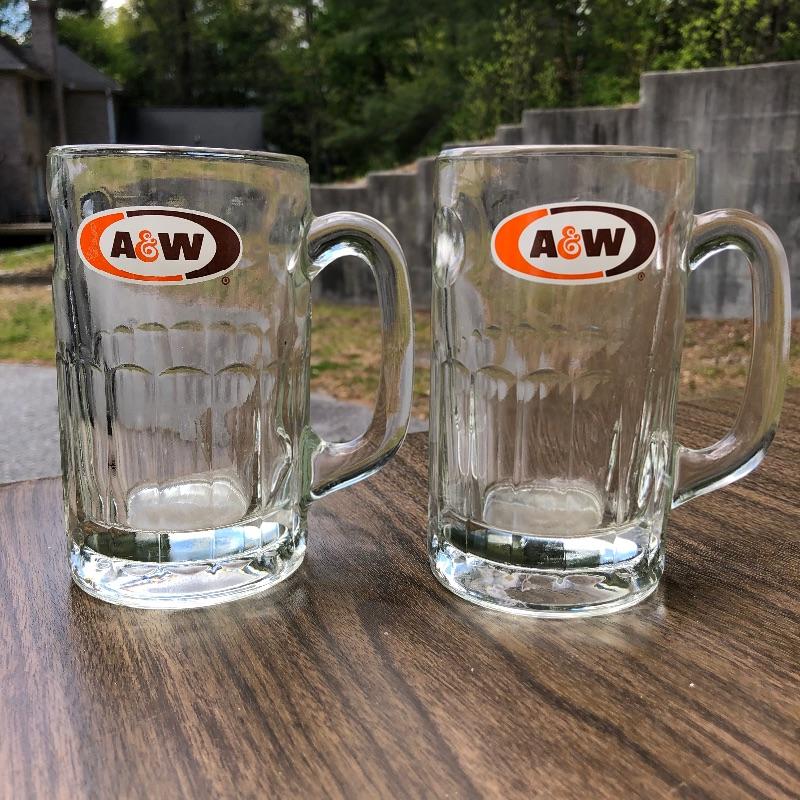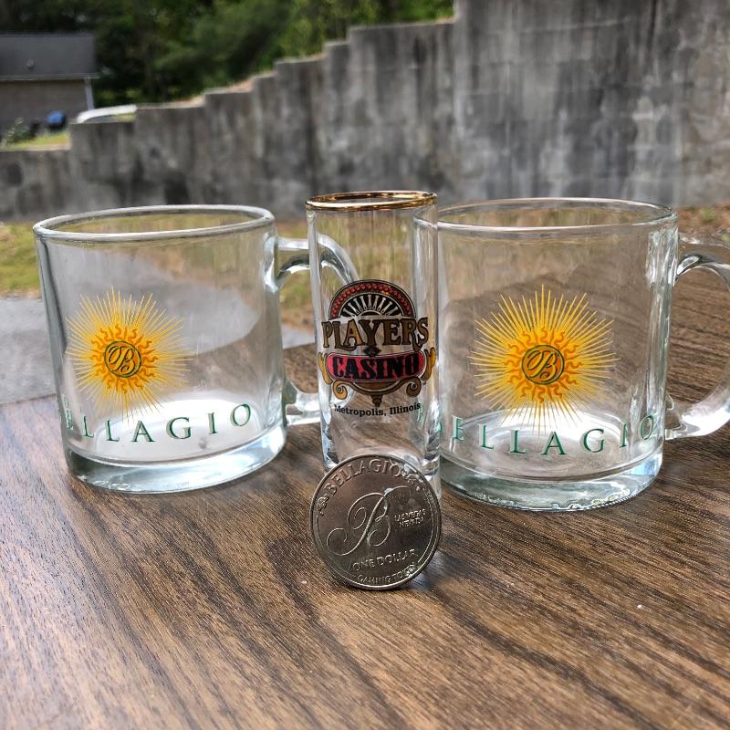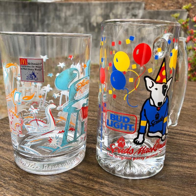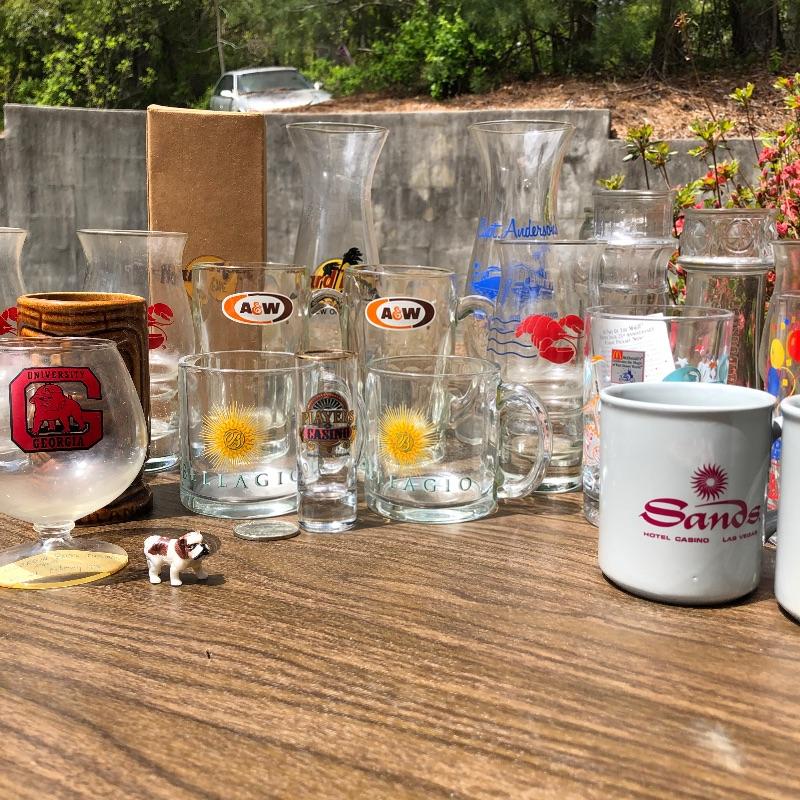 Large assortment of promo glasses and mugs. Georgia Bulldogs glass and dog, A & W glass tankards, Red Lobster tumblers, plus Bellagio, Hard Rock, Bud Light and more for a total of 20, see images.