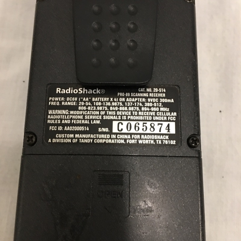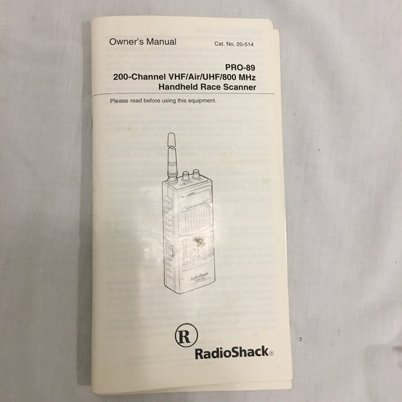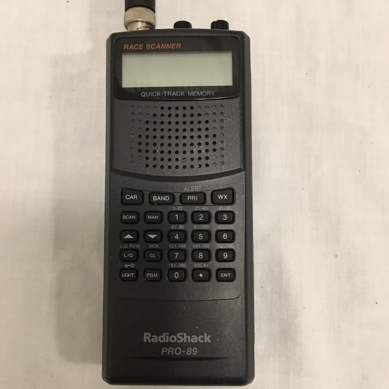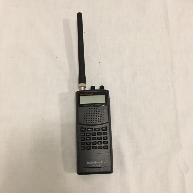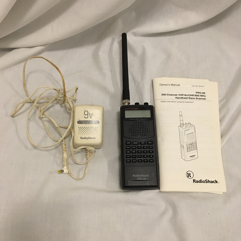 Radio Shack handheld race scanner model # PRO - 89. Scanner operates on batteries or on supplied adapter.