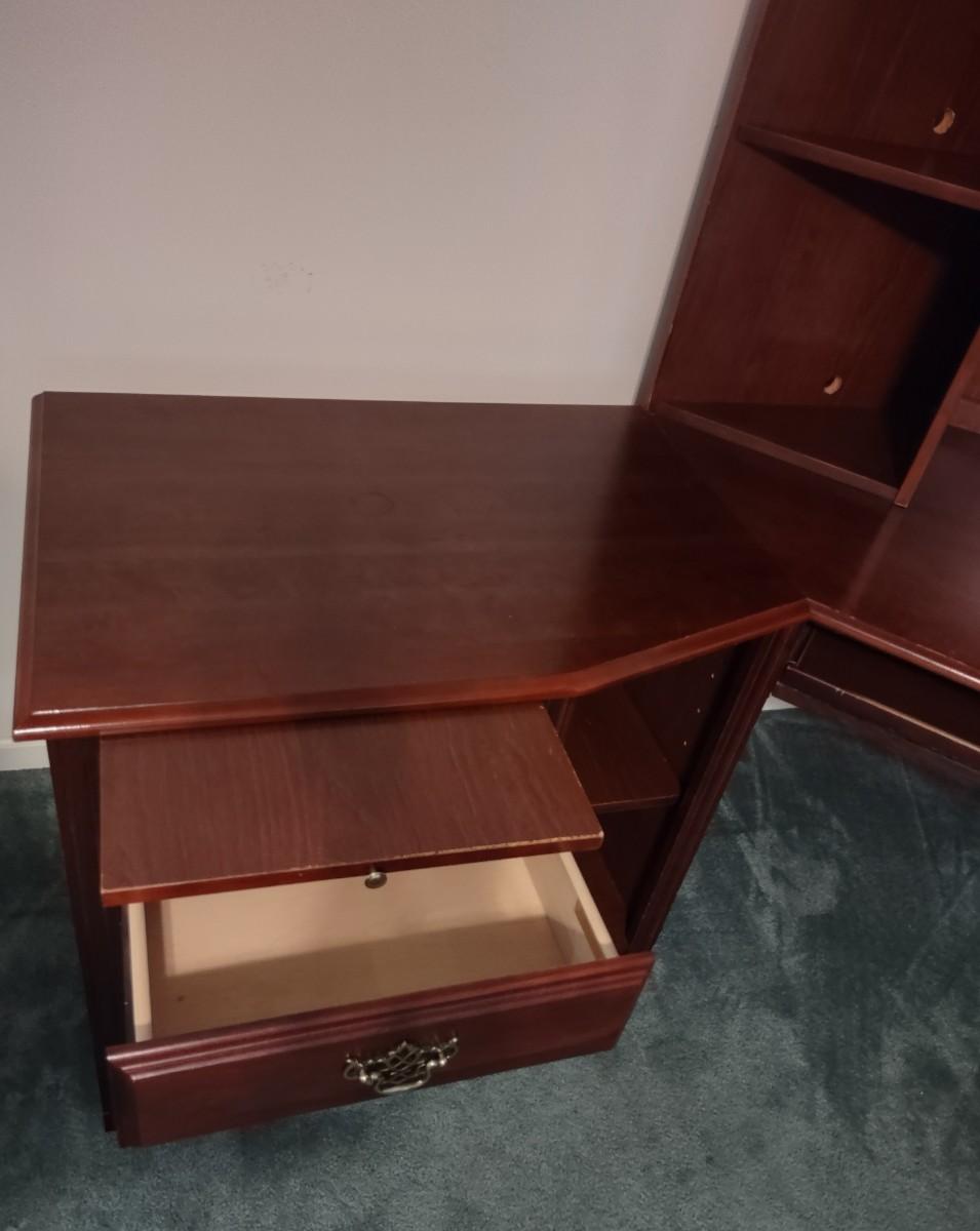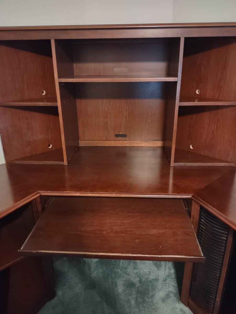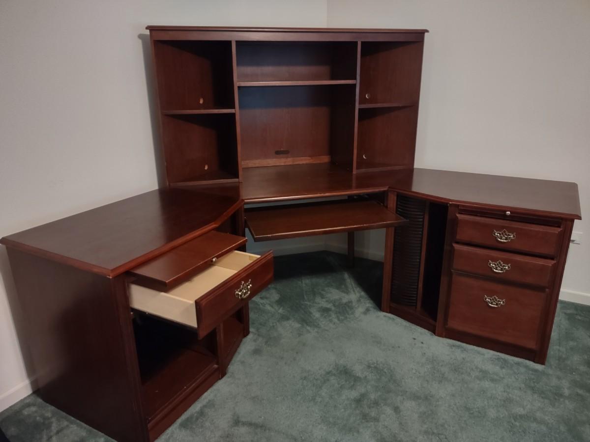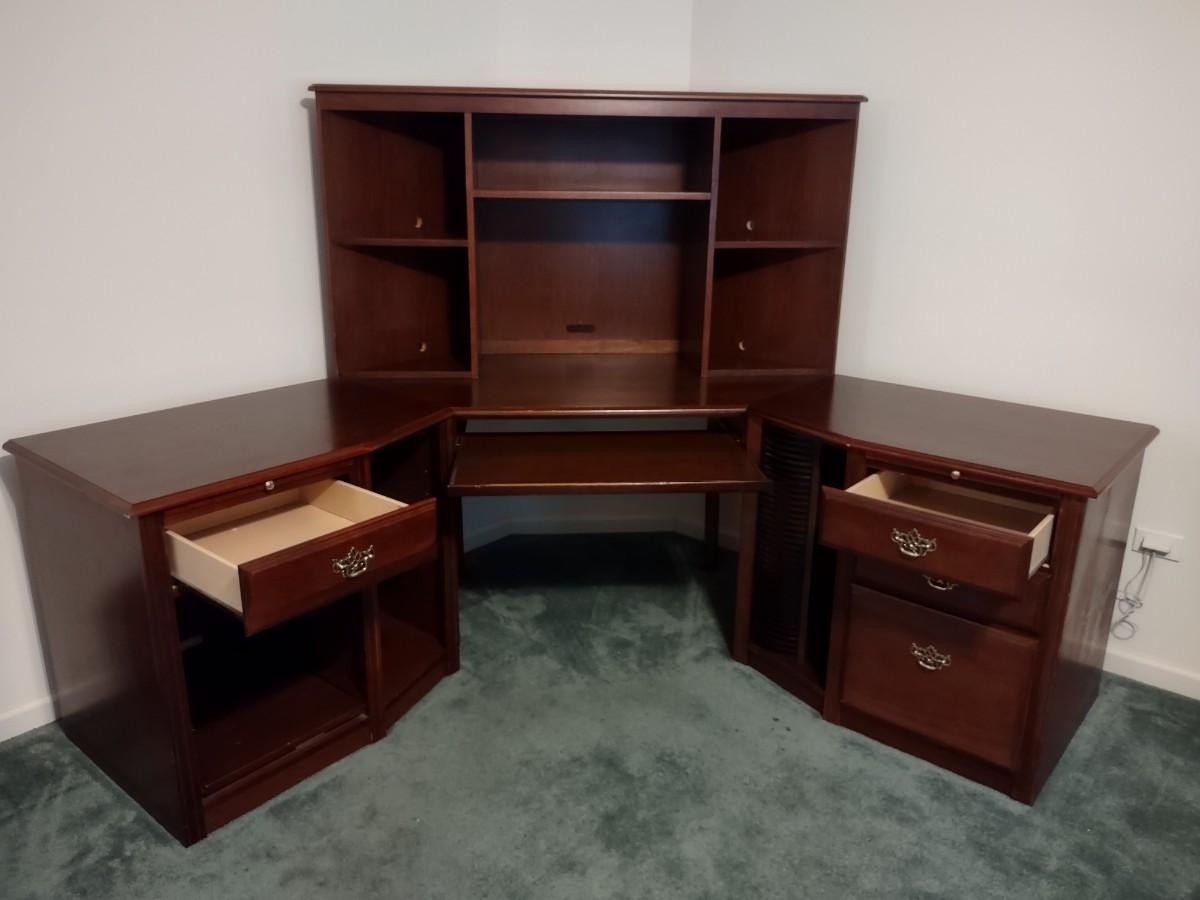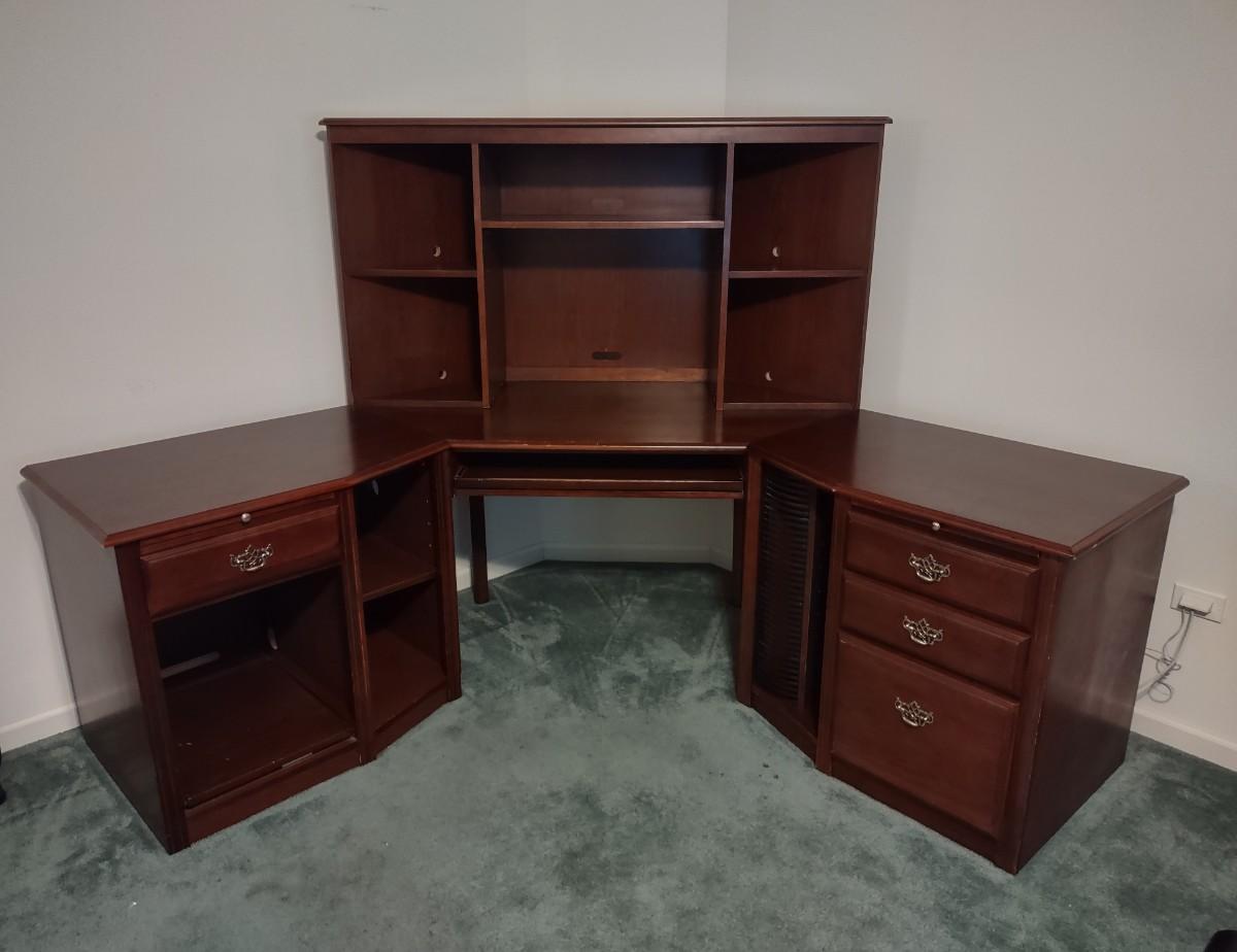 Riverside Cherry Color 4 Piece Corner Desk Very Solid, Must Bring Tools & Help For Pickup. This piece is made of particle pressed/board wood. Please see all pictures as they are the best representation of the items. The pictures show condition, measurements if taken, and what is included in the lot. Due to the large amount that we photograph and the time frame, we are not always able to take measurements. All items unless noted, are pre-owned and have been used. If you purchased furniture, you must bring help. We do not allow one person to carry large furniture out on their own. Bring help, tools and a truck for the safety of our client’s homes, and your personal safety. Company policy. Thank you.