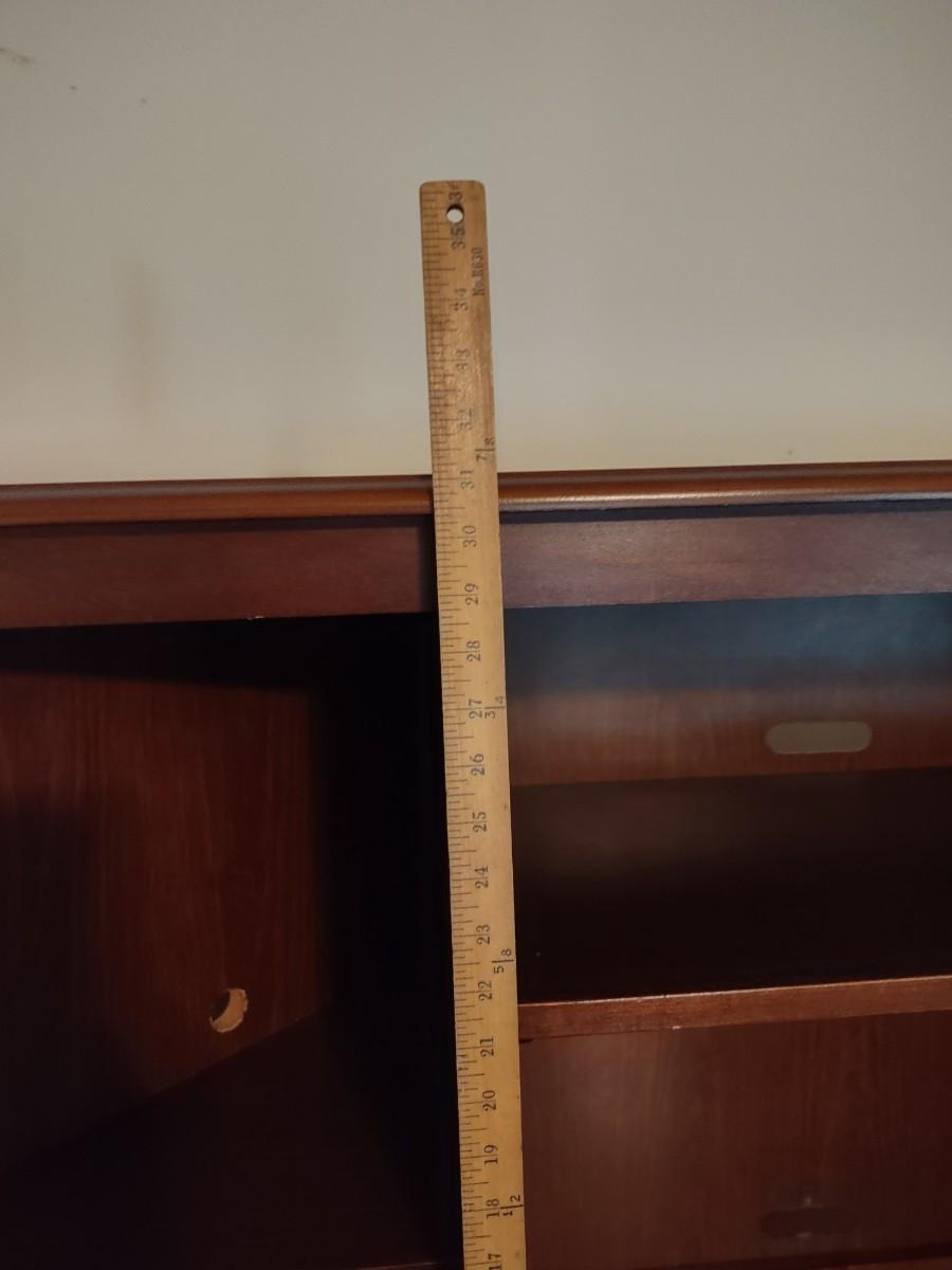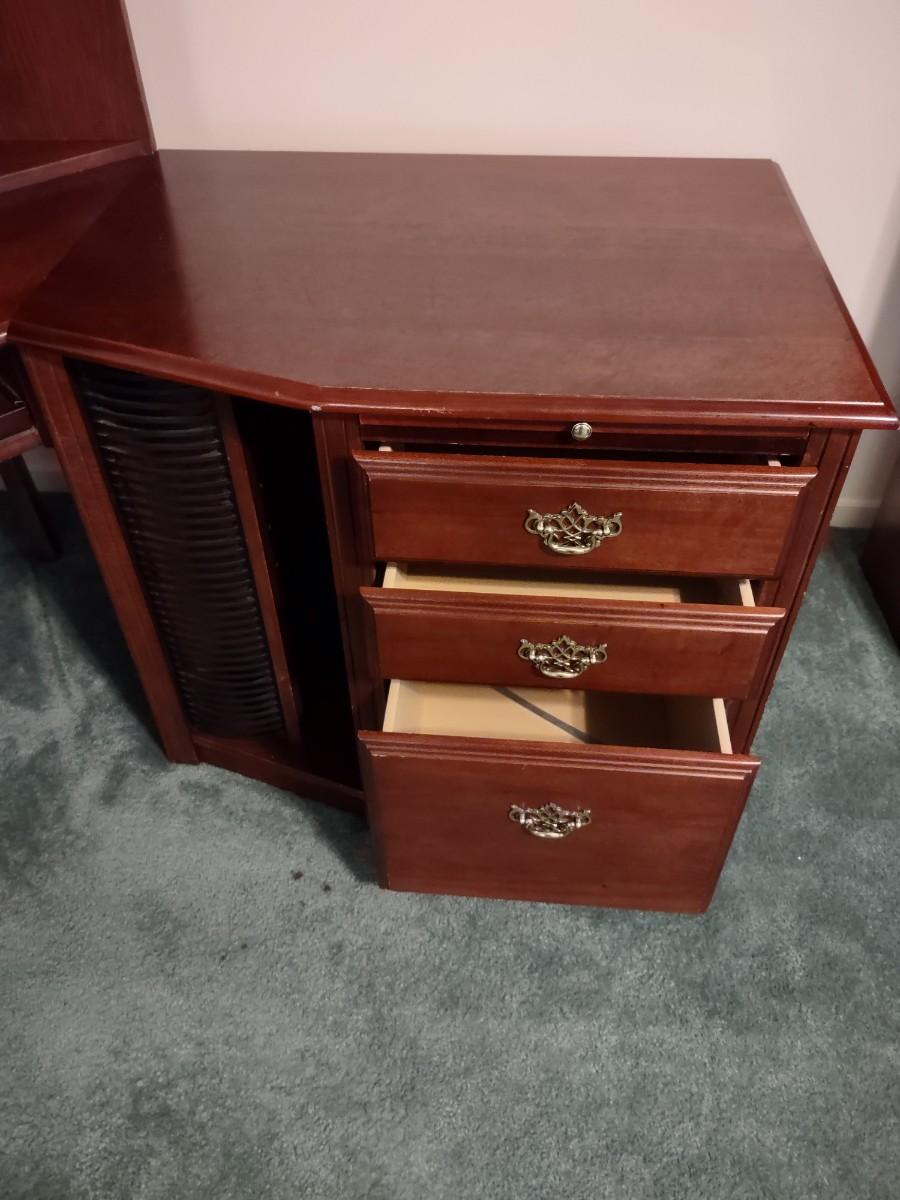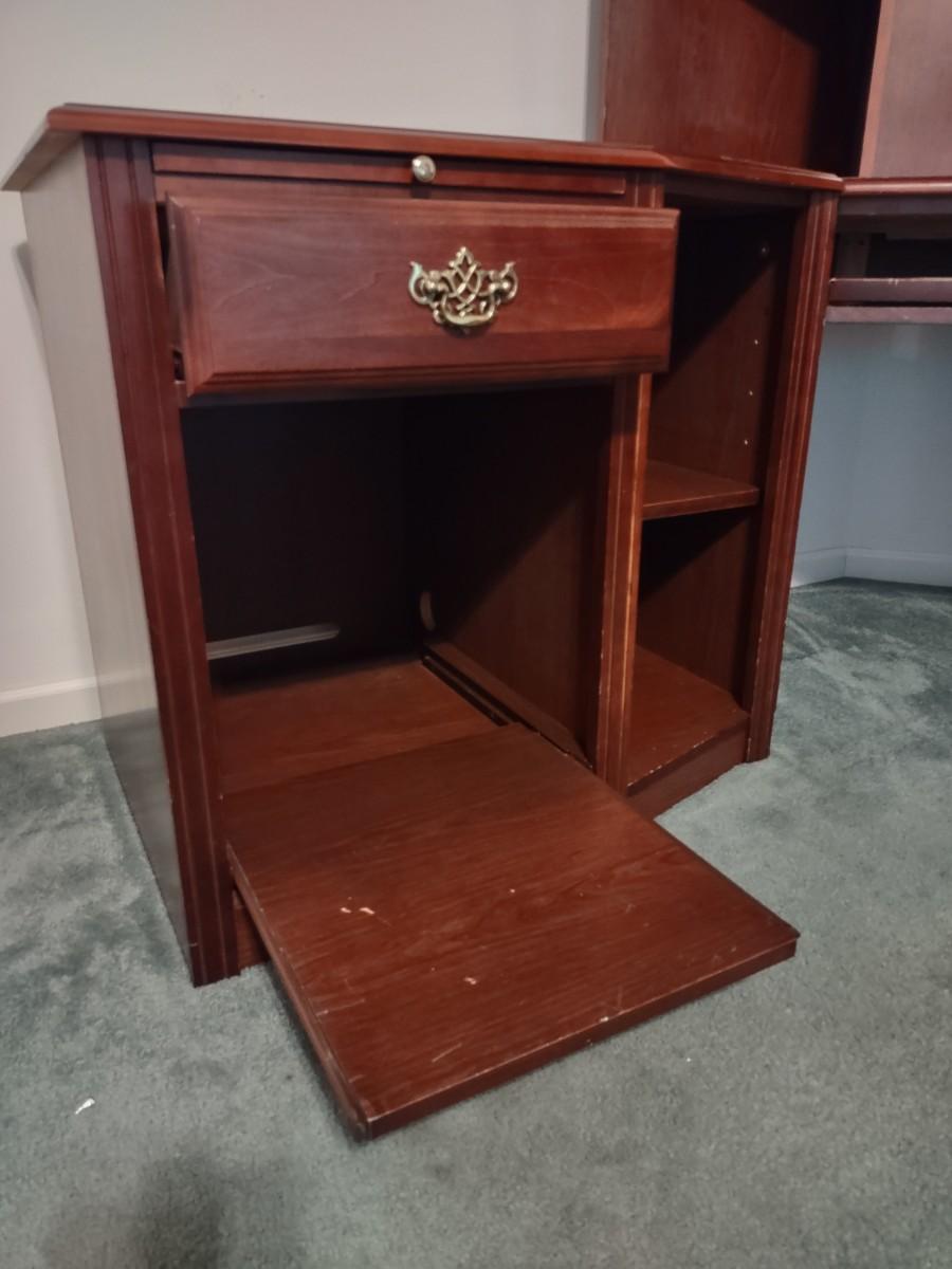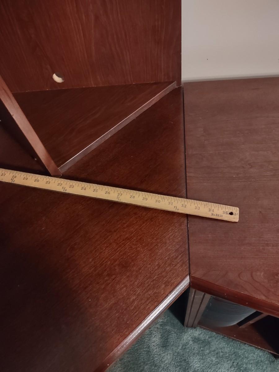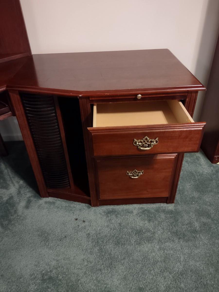 Riverside Cherry Color 4 Piece Corner Desk Very Solid, Must Bring Tools & Help For Pickup. This piece is made of particle pressed/board wood. Please see all pictures as they are the best representation of the items. The pictures show condition, measurements if taken, and what is included in the lot. Due to the large amount that we photograph and the time frame, we are not always able to take measurements. All items unless noted, are pre-owned and have been used. If you purchased furniture, you must bring help. We do not allow one person to carry large furniture out on their own. Bring help, tools and a truck for the safety of our client’s homes, and your personal safety. Company policy. Thank you.