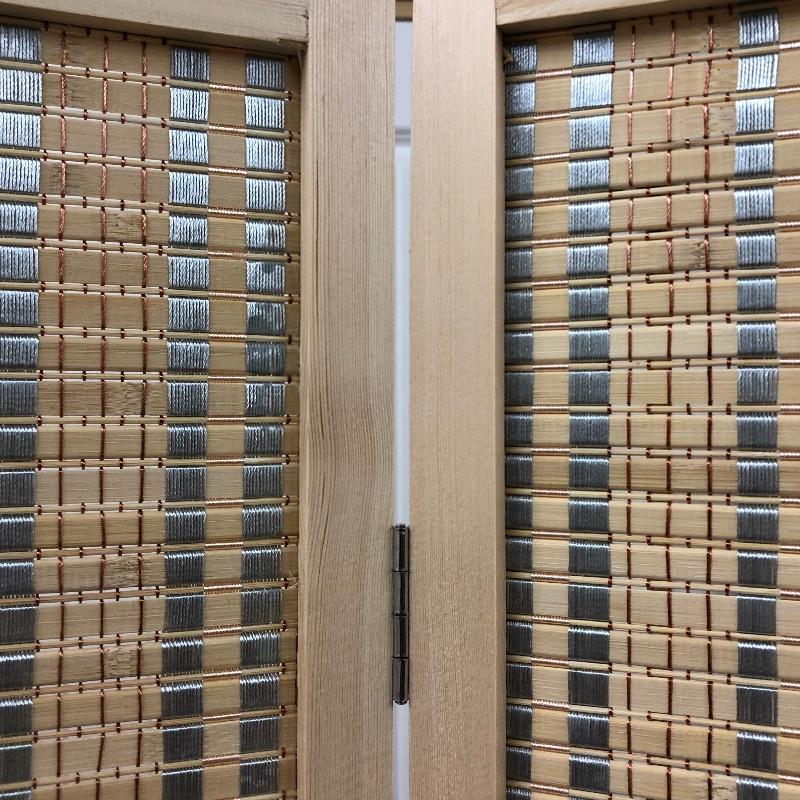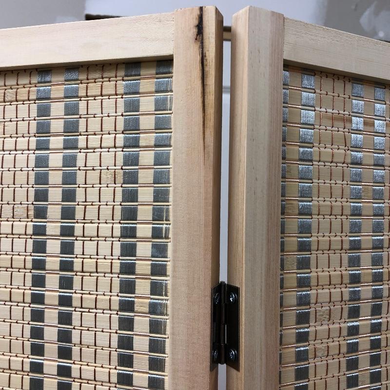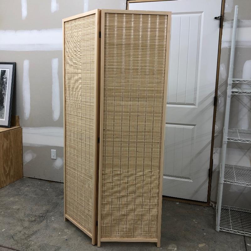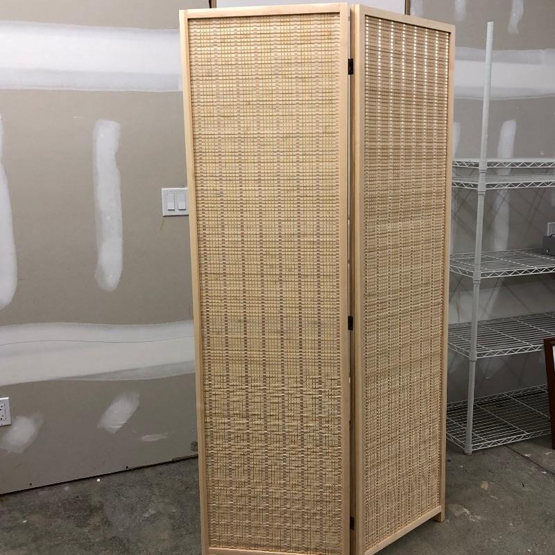 Beautiful and delicate this 4 paneled decorative screen/ room divider is well made and in good condition with only a couple of blemishes at very top of one side of the frame. It is very light and easy to handle and appears to be made from metals and possibly basswood or Reed. The colors are very neutral to match most any decor, with one side being light blue and the other a neutral pink.