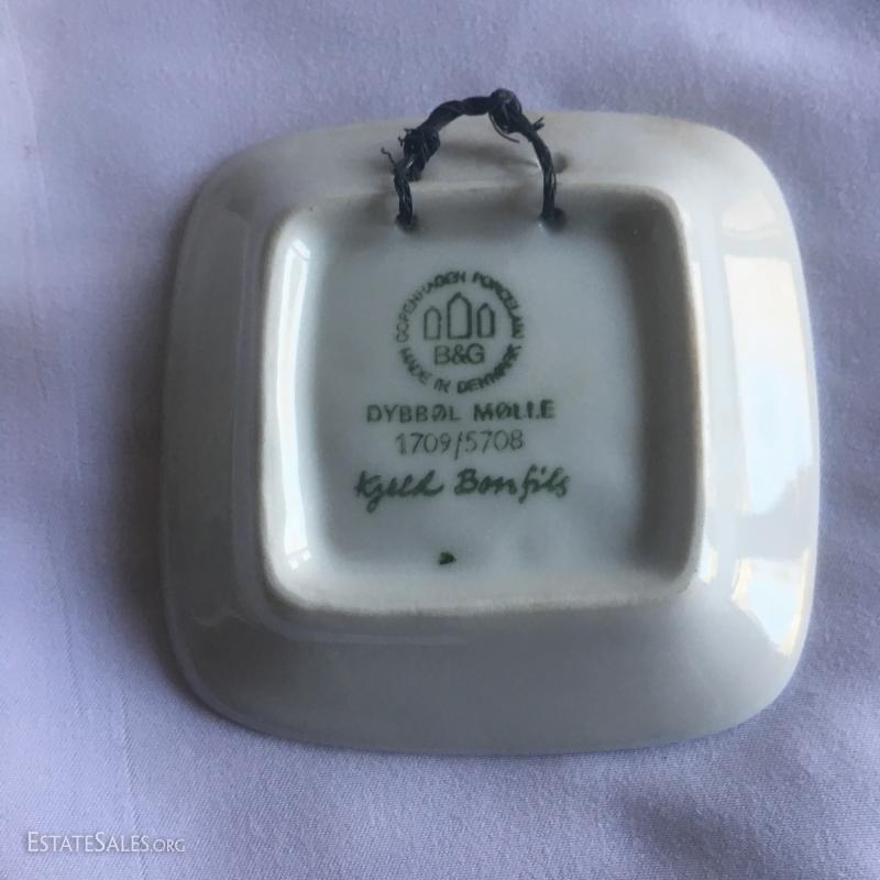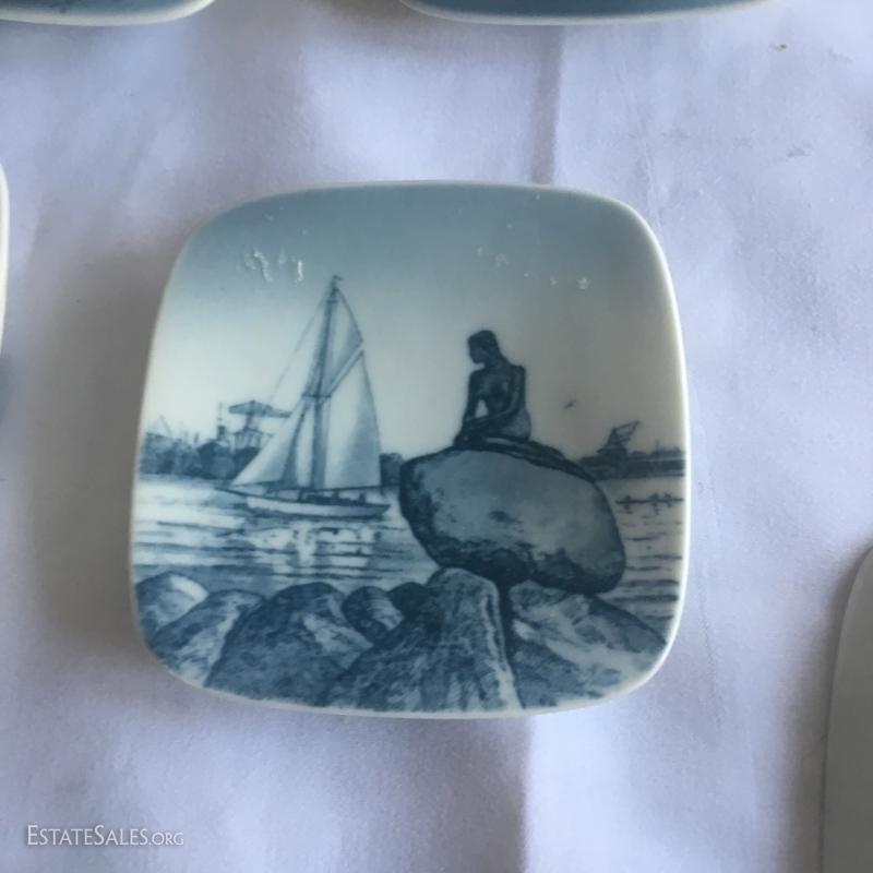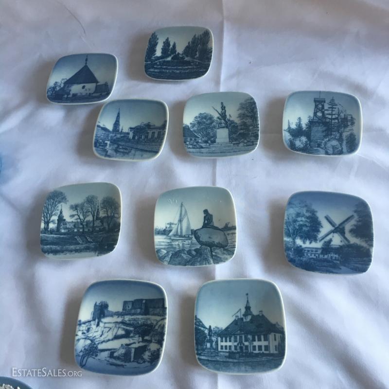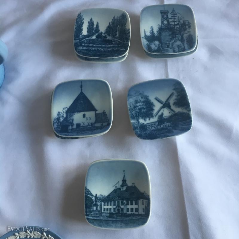 Two coffee cups and I small dish.. Set of 10 small square plates made in Denmark, Copenhagen Porcelain.