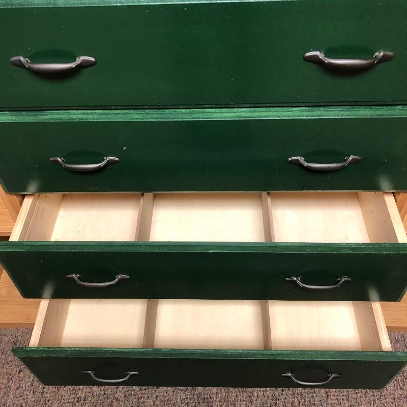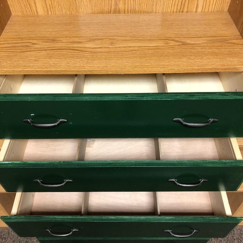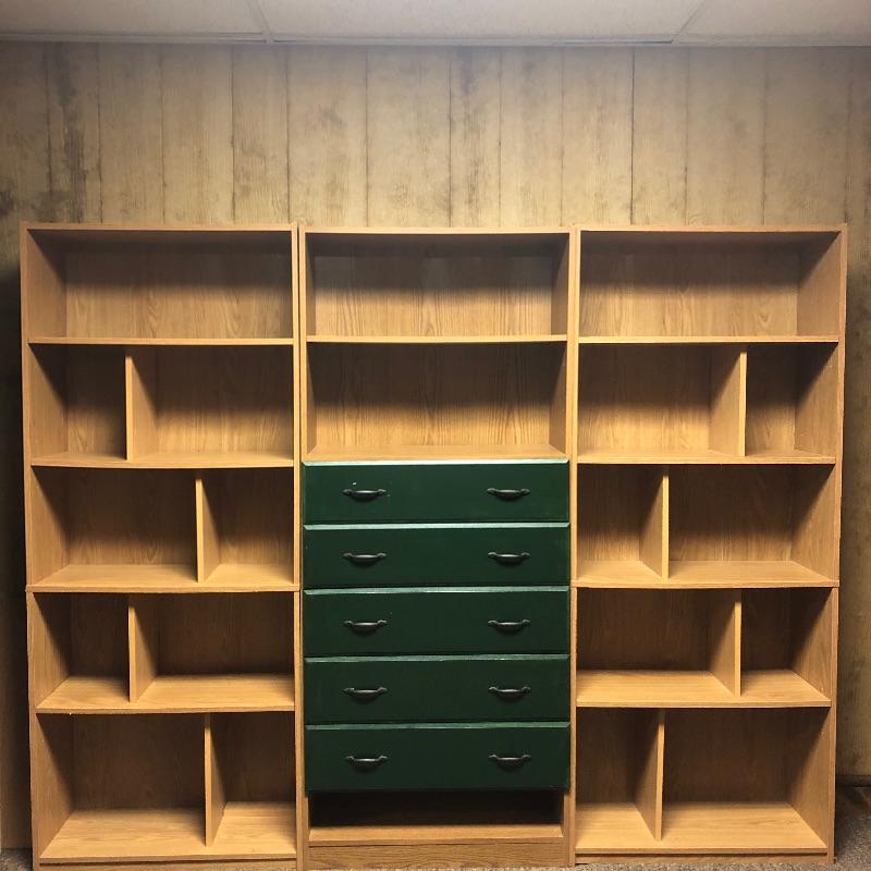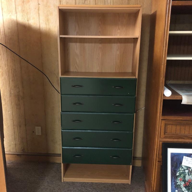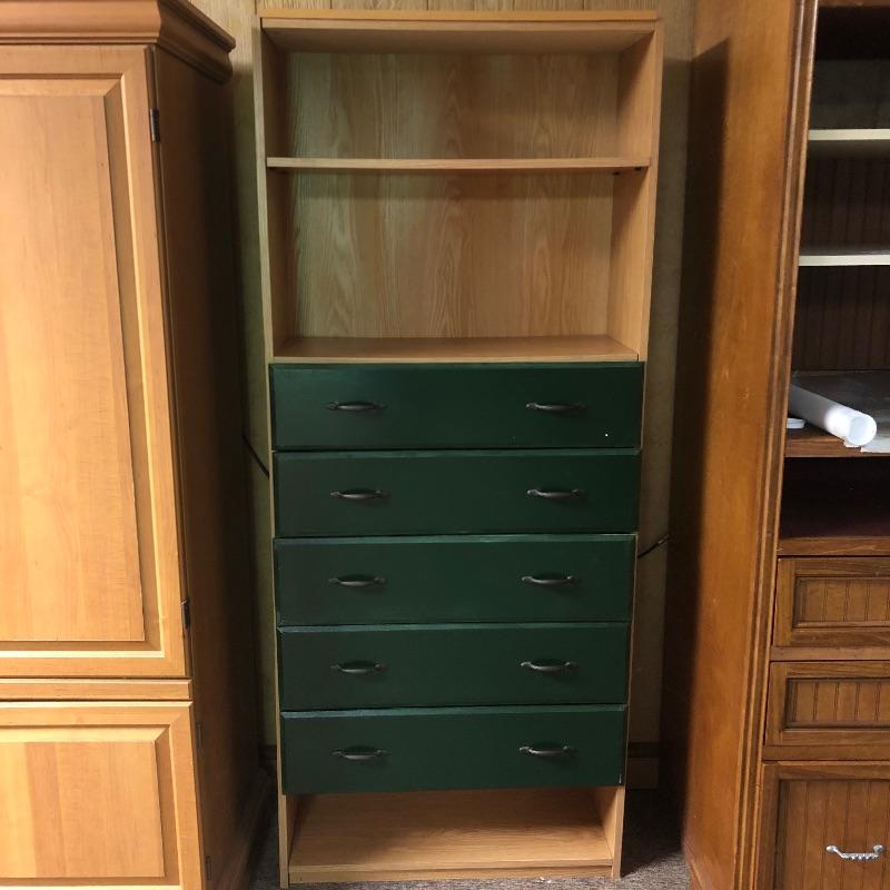 This lot is seven shelving units. Two have drawers. These pieces appear to be in good condition though made from