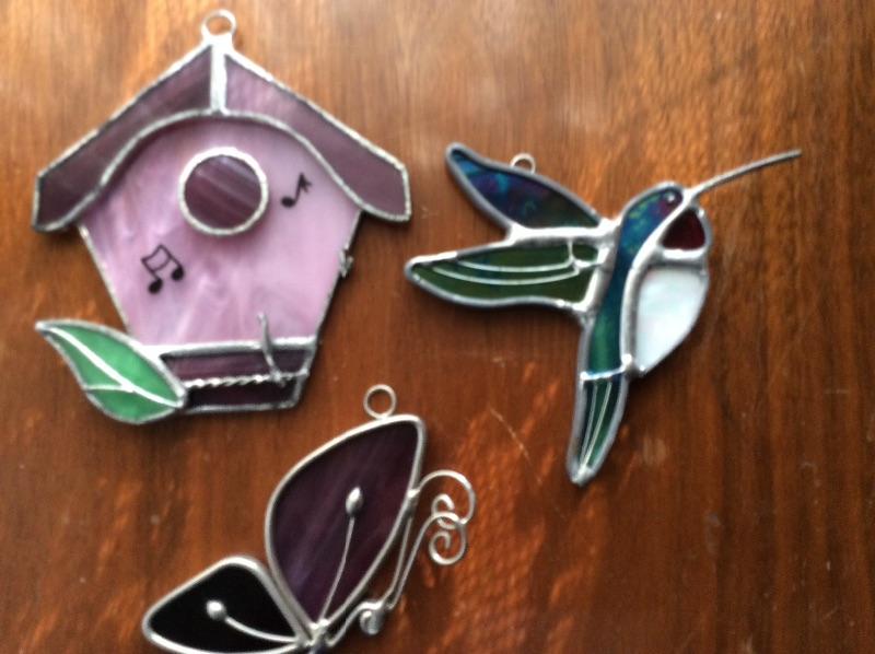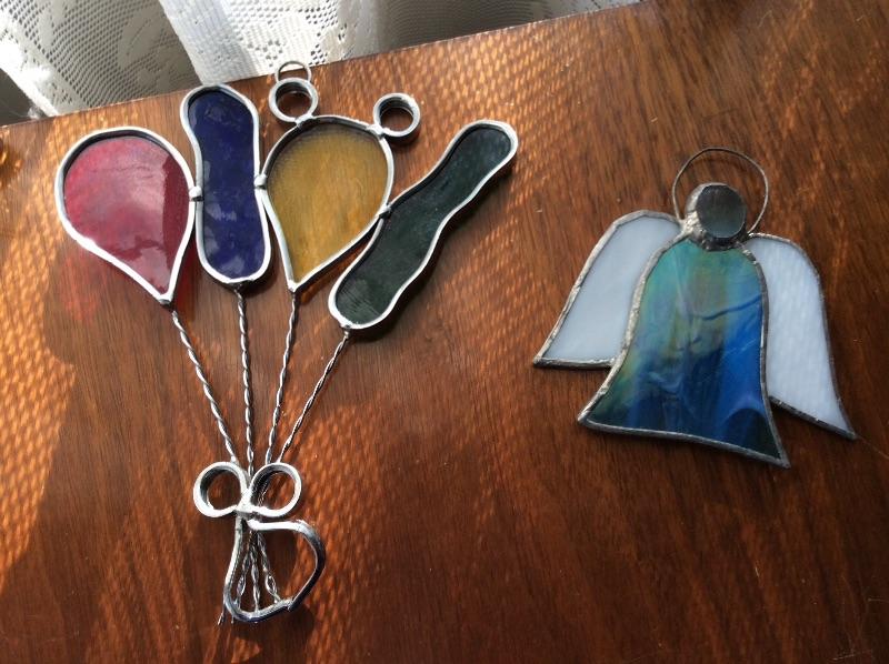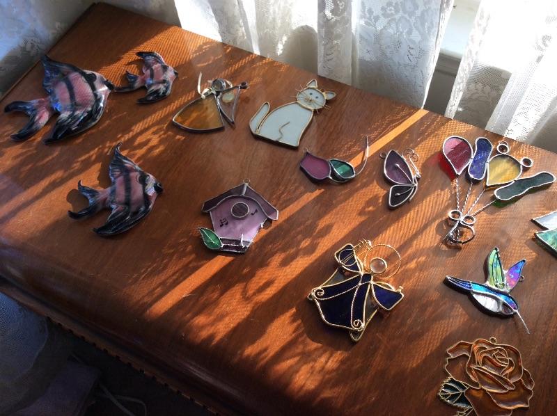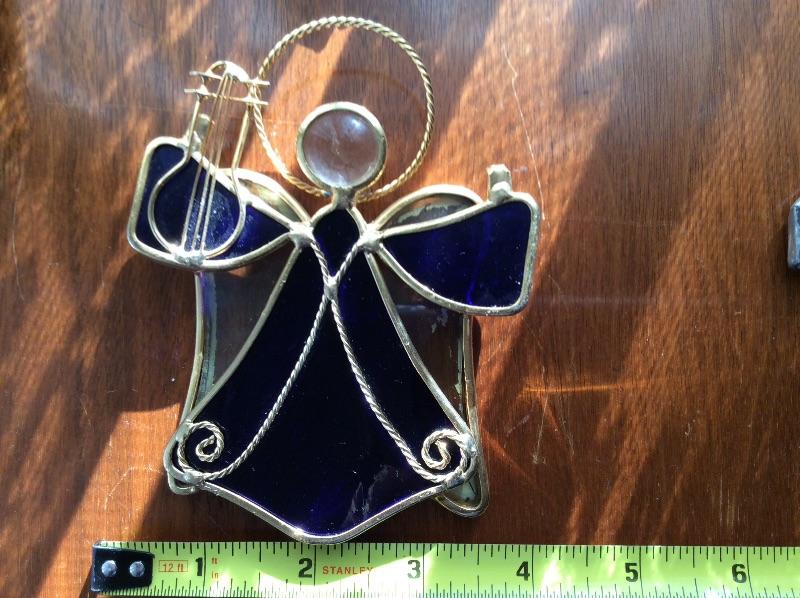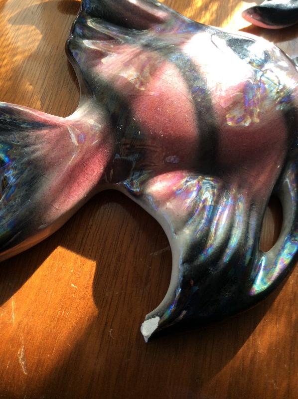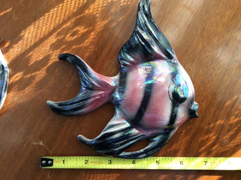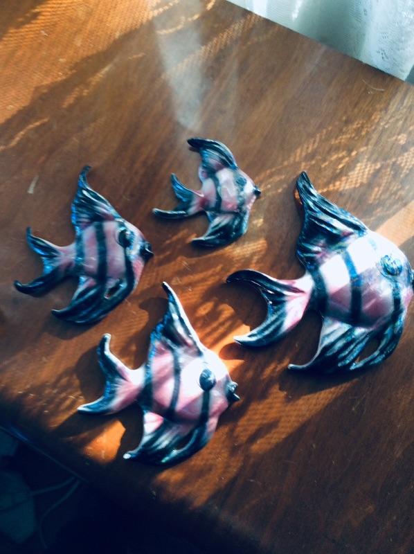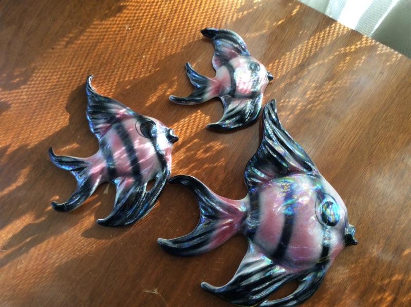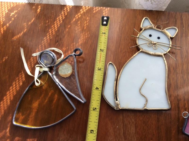 Four MCM fiah wall plaques. One has small chip. Also, stained glass cat, angel and more. Please bring packing material.