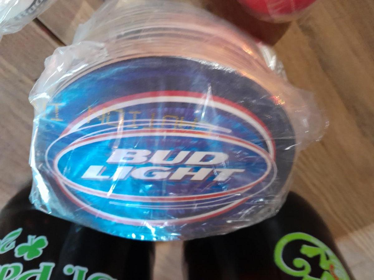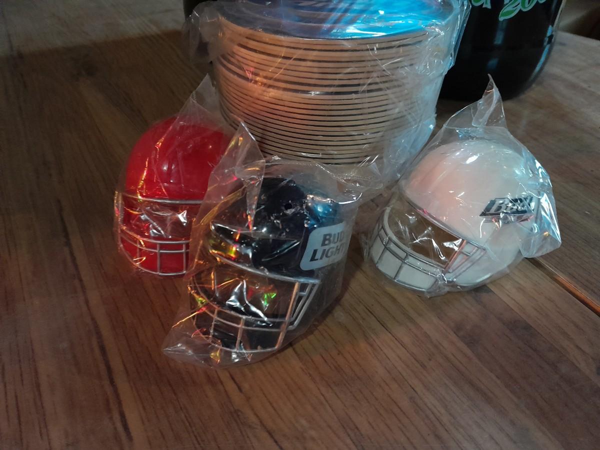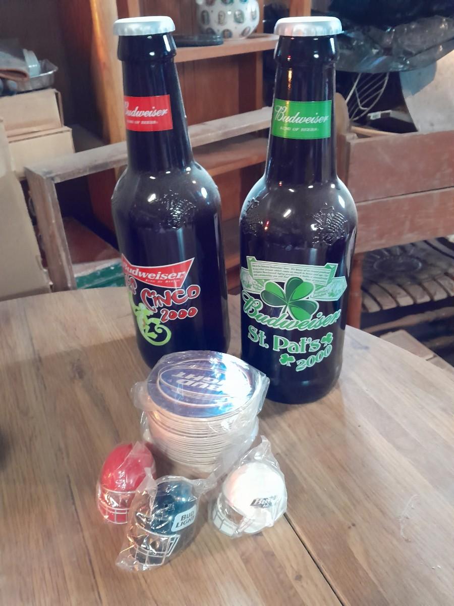 TWO EMPTY 15" COLLECTIBLE BUDWEISER BOTTLES, FOOTBALL HELMETS, AND COASTERS