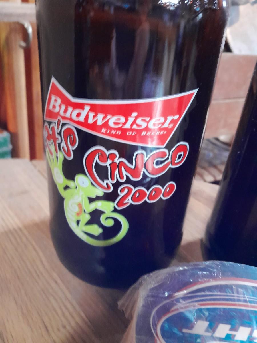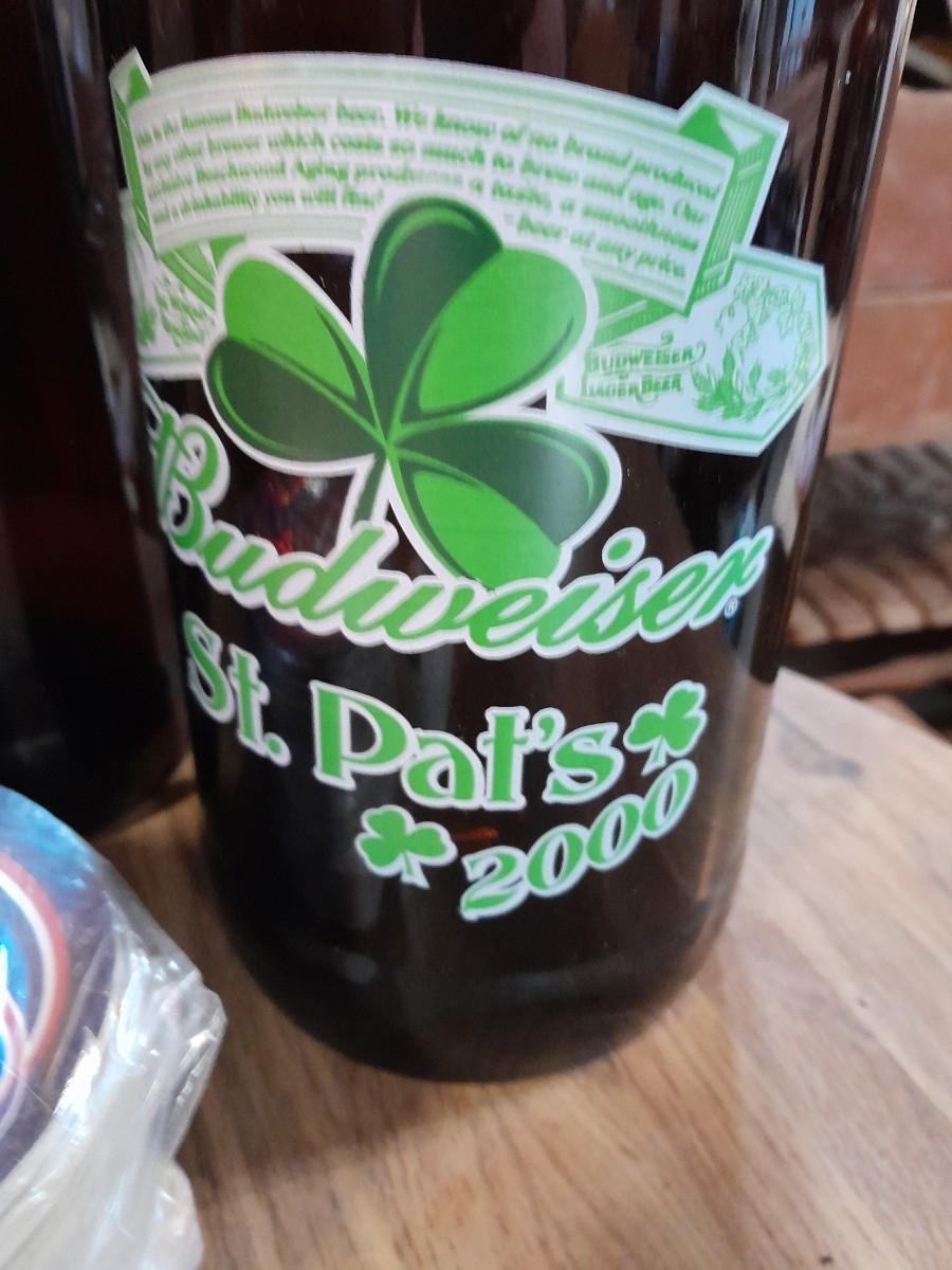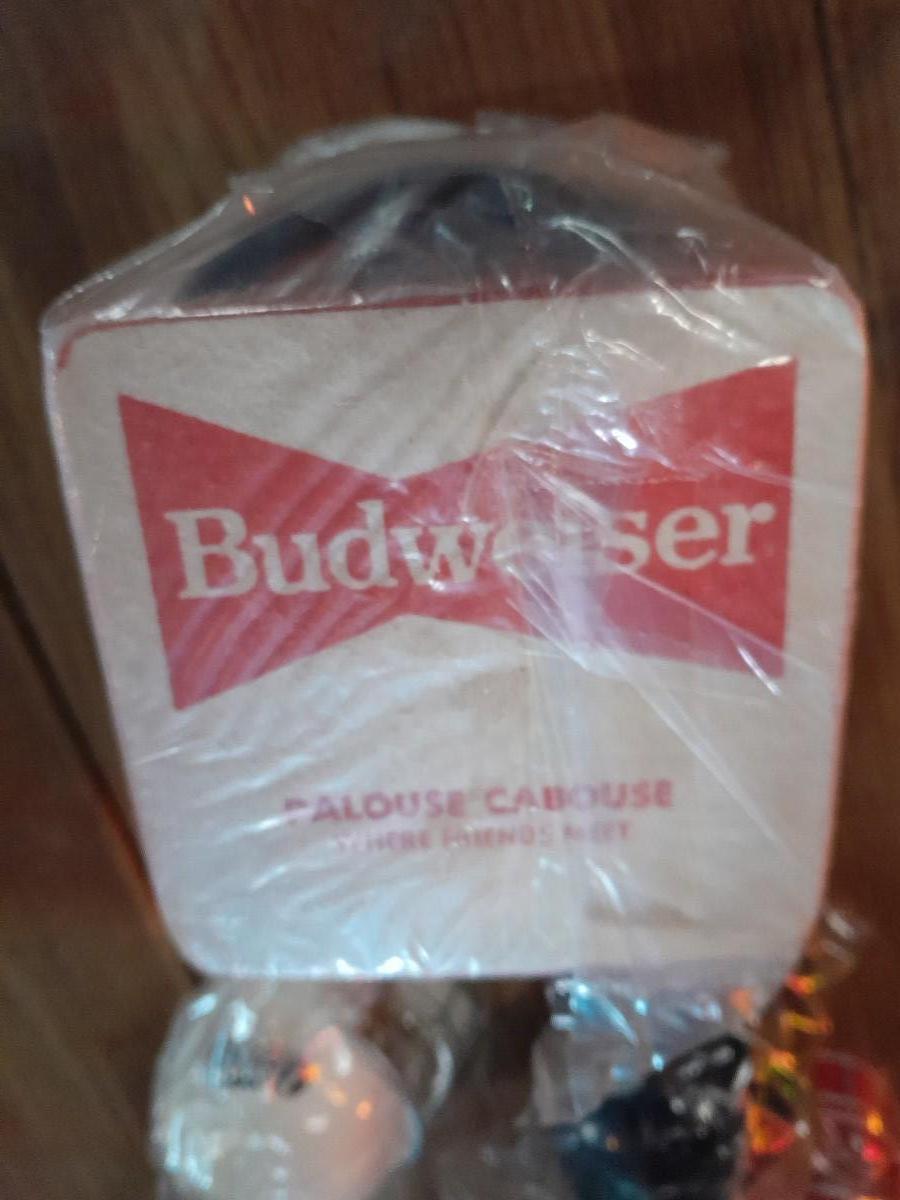 TWO EMPTY 15" COLLECTIBLE BUDWEISER BOTTLES, FOOTBALL HELMETS, AND COASTERS