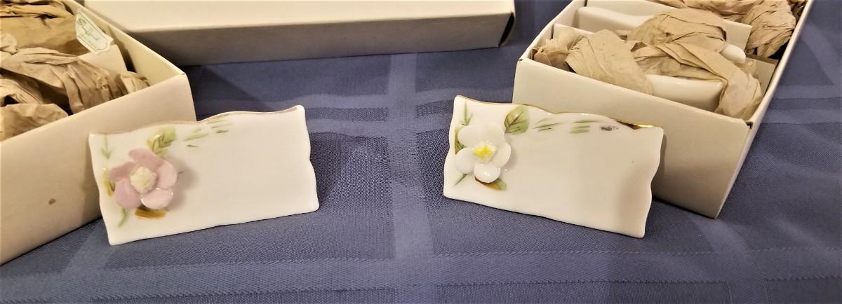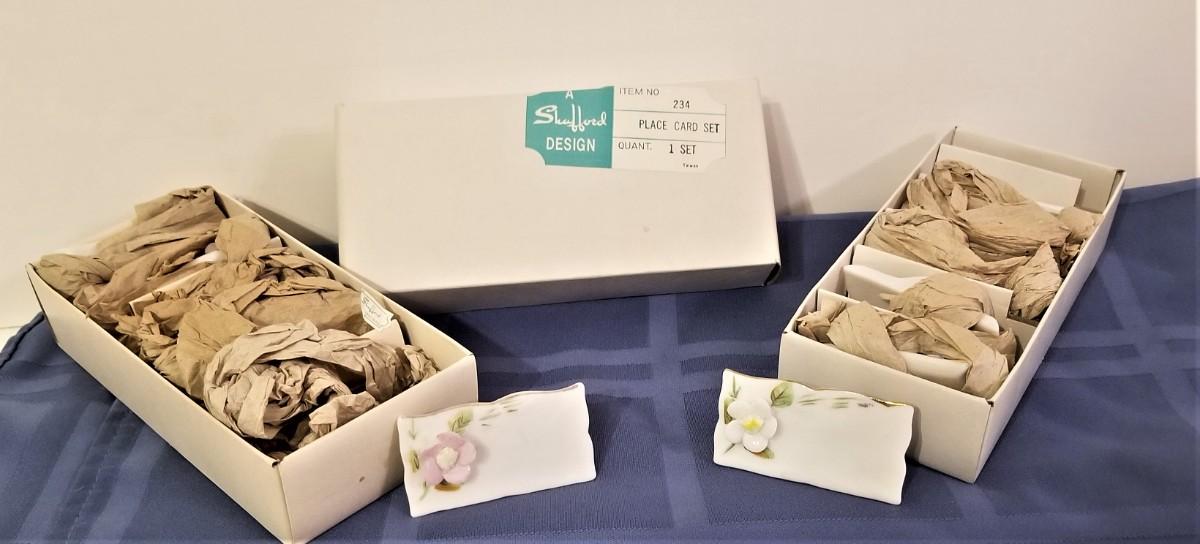 Two vintage sets - in original boxes - of Sheffield porcelain place cards - Mixed white, pink, and blue flowers. They look unused. Each is 2.5" x 1.5" tall.