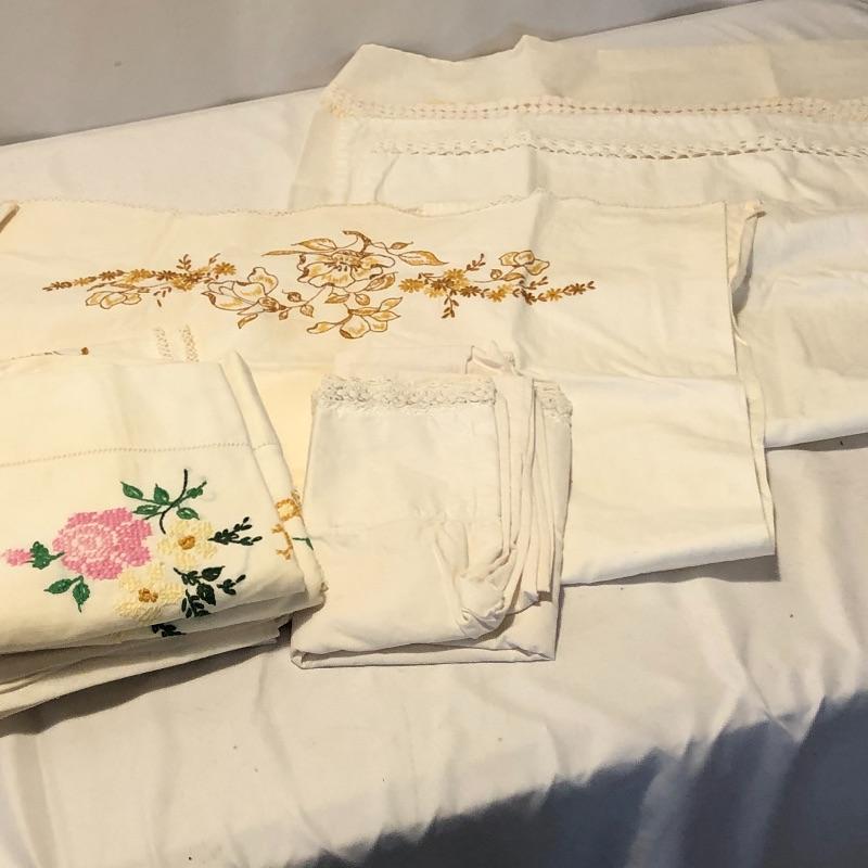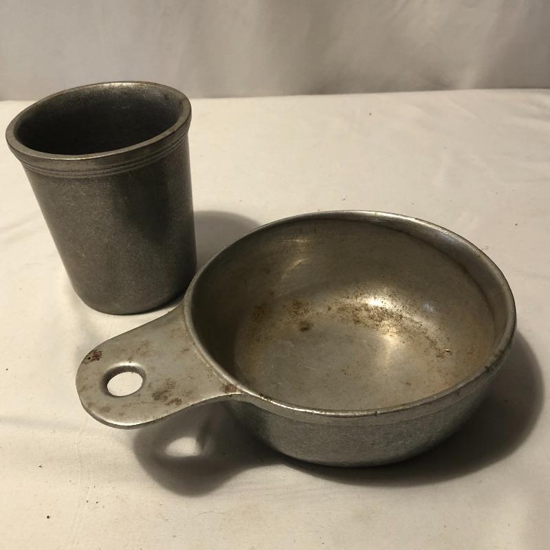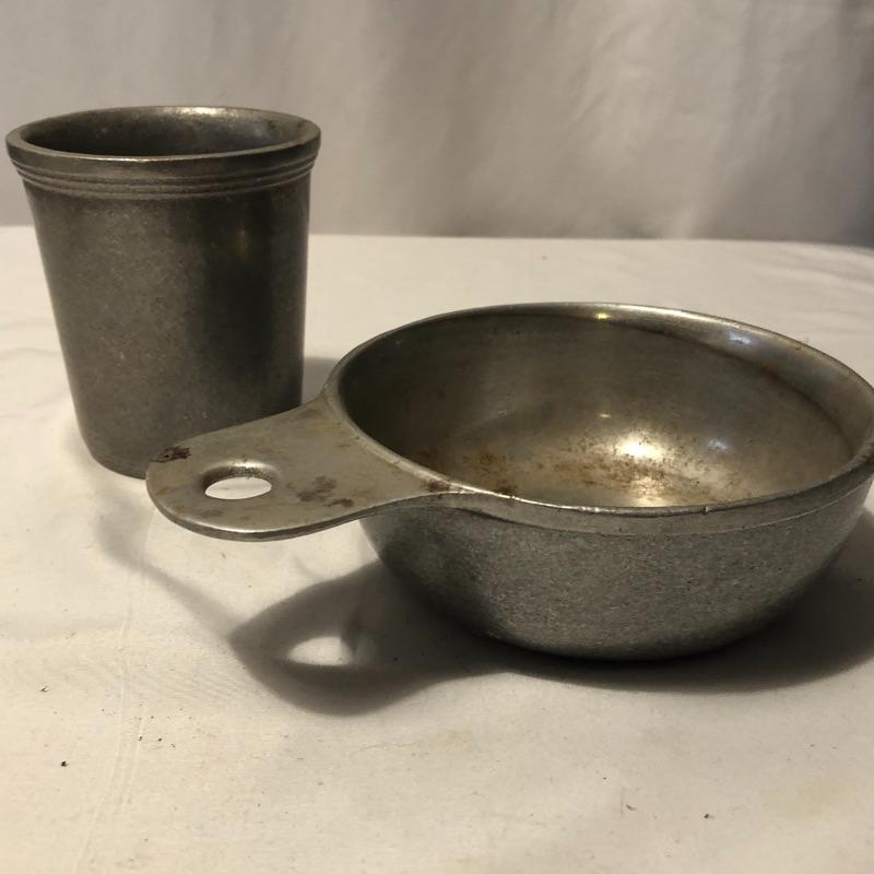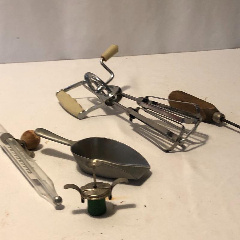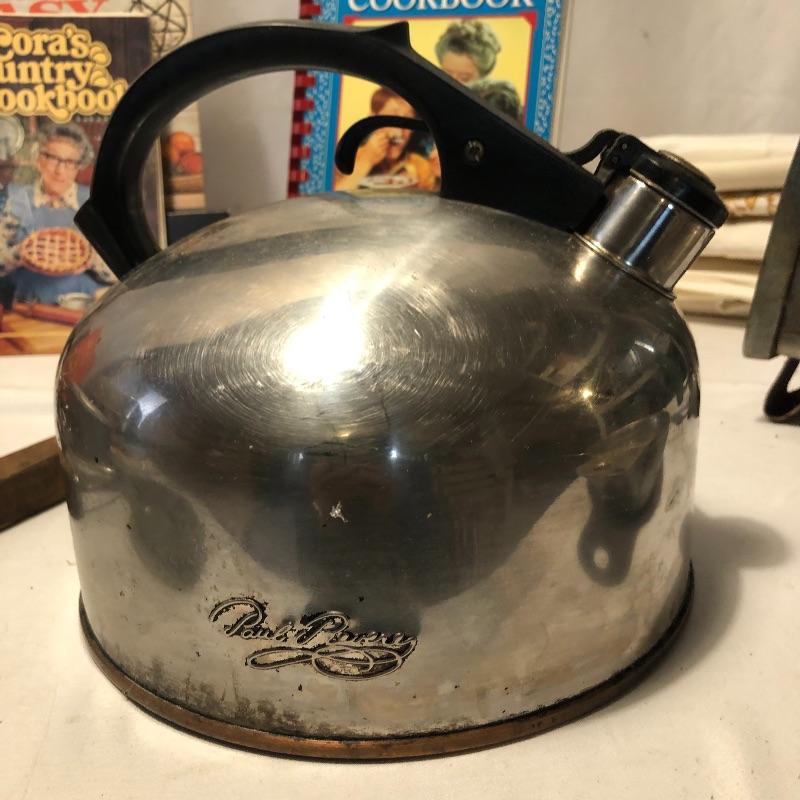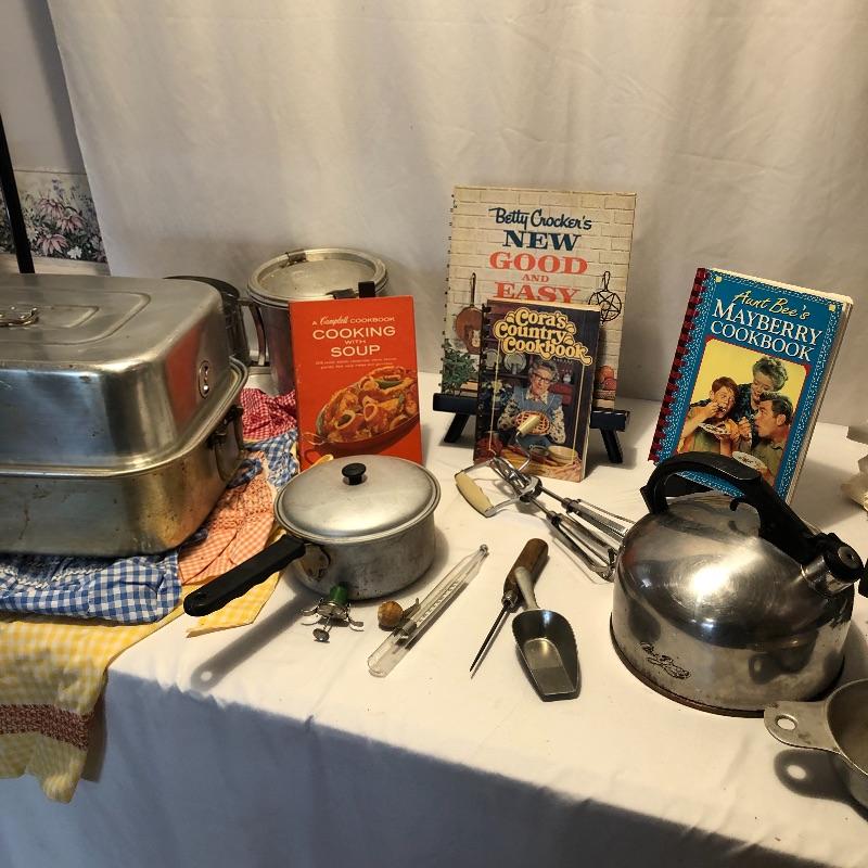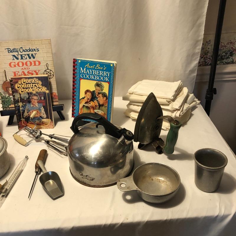 What a lot! Compliment your kitchen utensils with these vintage items! Items include a roasting pan, ten vintage aprons, vintage coffee storage container, flour sifter, four vintage cookbooks, hand mixer, tea kettle, vintage iron, bedroom linens and more! Also, included is what appears to be a pewter set. Local pick up only.