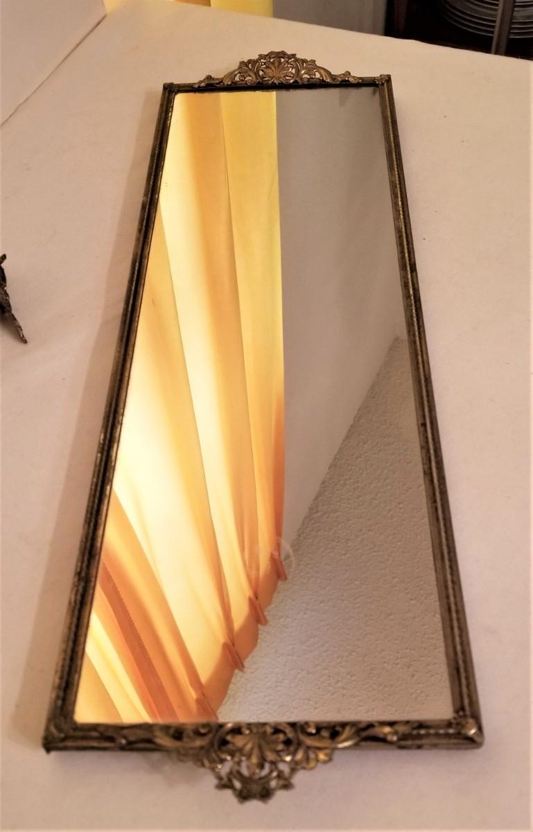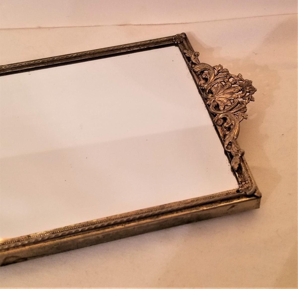 Two vintage vanity pieces here - oblong rectangular mirrored dresser tray - metal mounts - with a letter holder in the same style. Tray is 20" x 6", letter holder is 2" long. Good vintage condition.