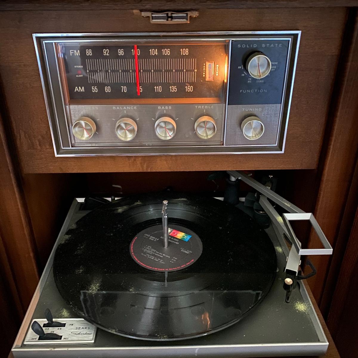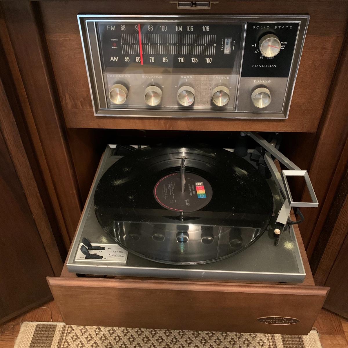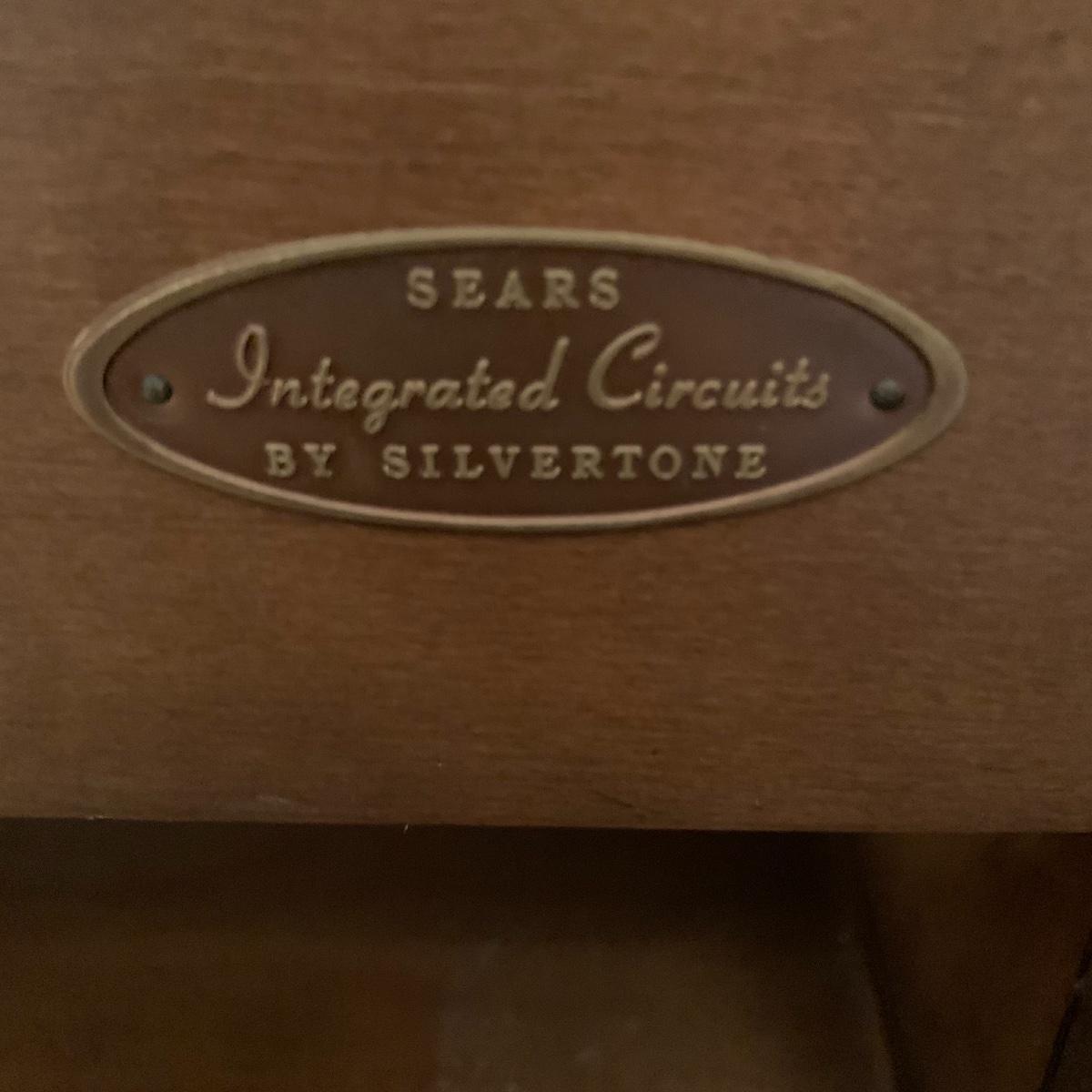 Break out those old records! This lot features a vintage Sears Integrated Circuit Silvertone record player that appears to be in excellent working condition. Radio Turns on and record player spins when on. Can not guarantee that all work correctly. This model features AM/FM radio as well as a turntable. The cabinet this unit is housed in measures 36” wide X 28” tall X 16” deep. Also included in this lot are several vinyl records. See pics for titles. Local pickup only.