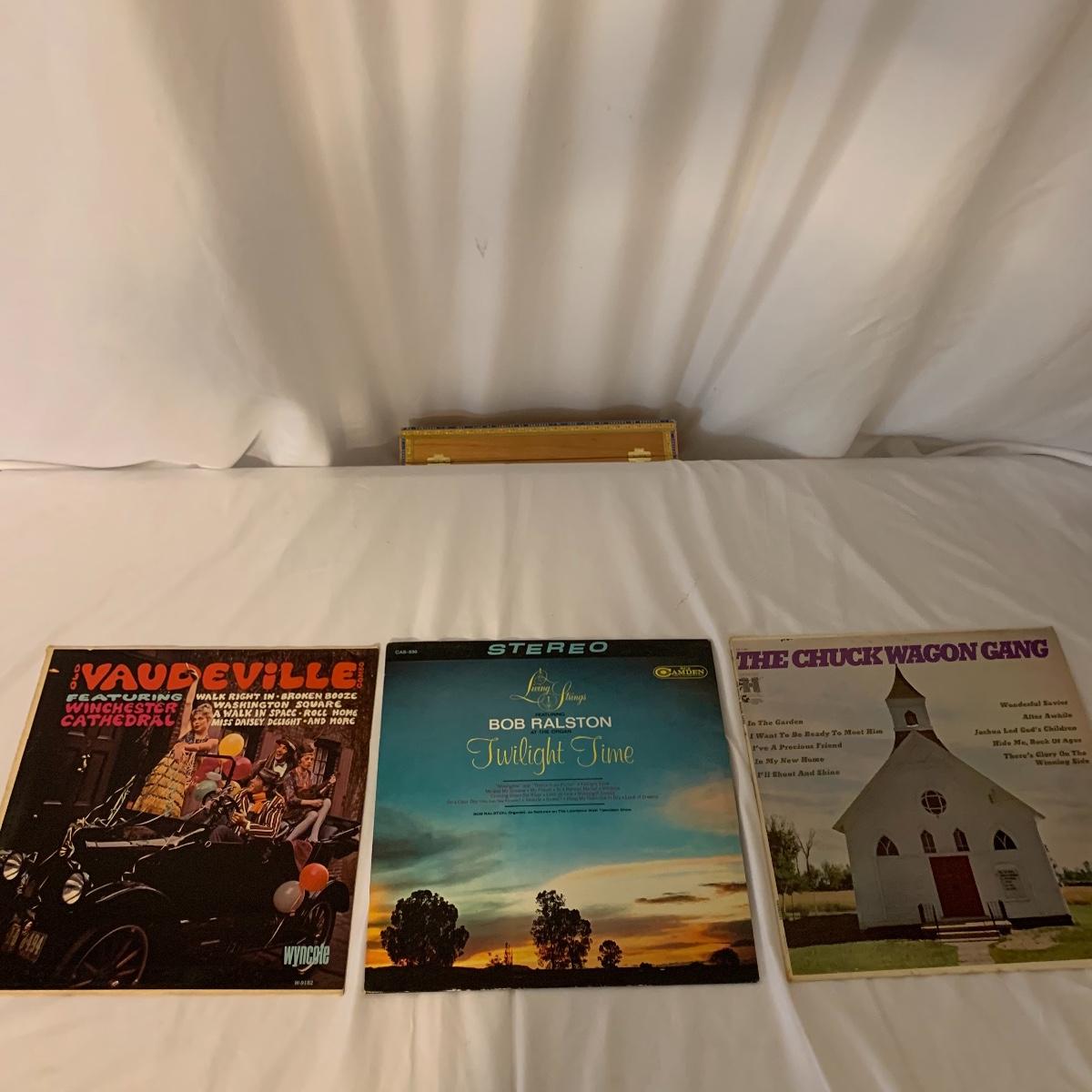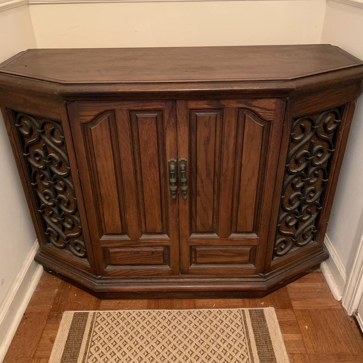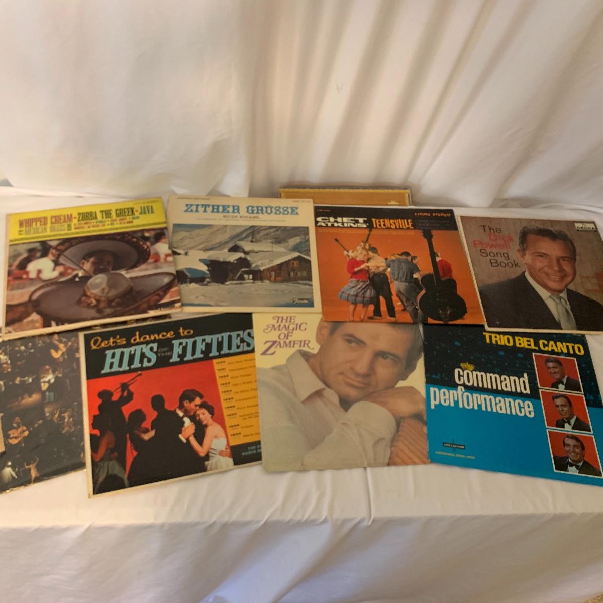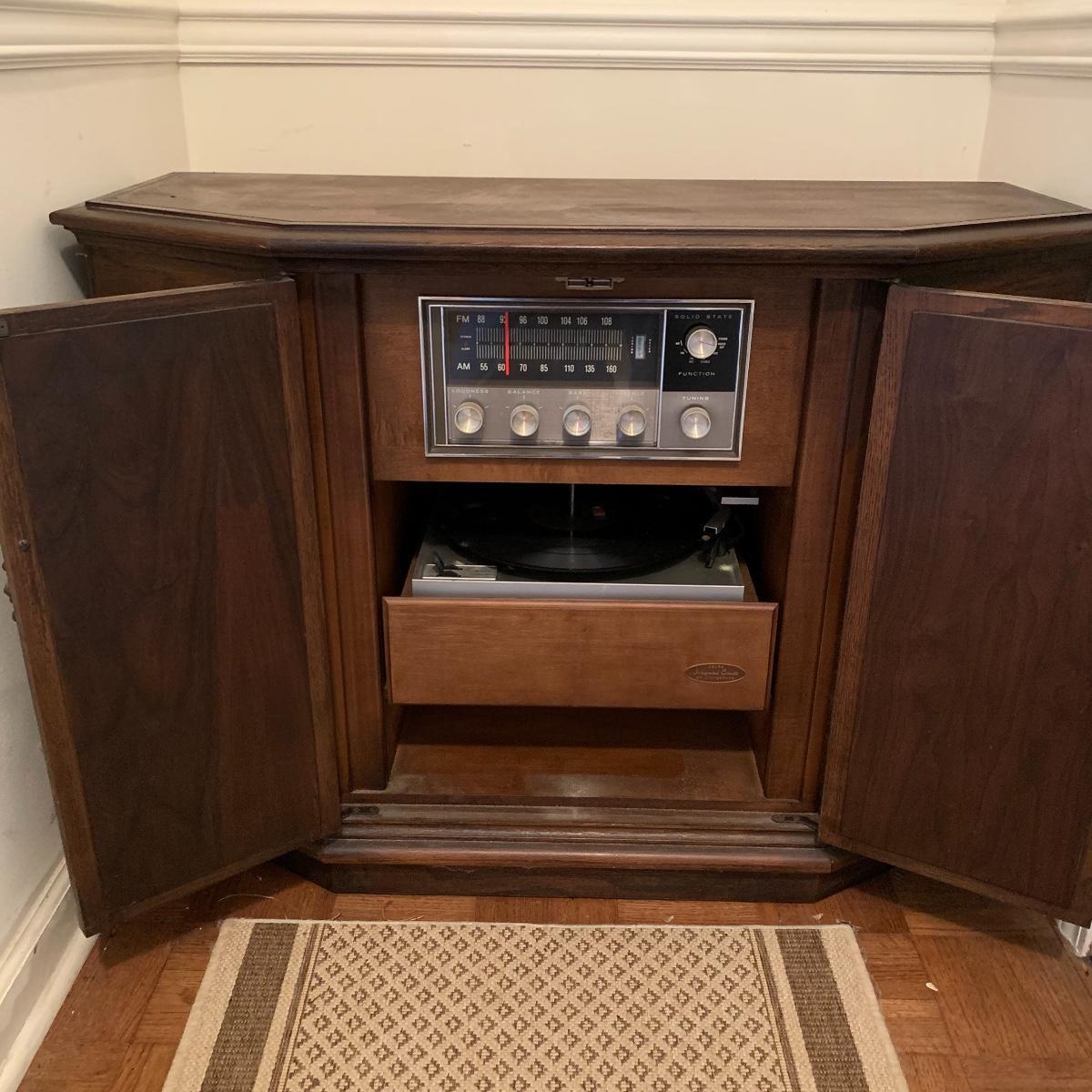 Break out those old records! This lot features a vintage Sears Integrated Circuit Silvertone record player that appears to be in excellent working condition. Radio Turns on and record player spins when on. Can not guarantee that all work correctly. This model features AM/FM radio as well as a turntable. The cabinet this unit is housed in measures 36” wide X 28” tall X 16” deep. Also included in this lot are several vinyl records. See pics for titles. Local pickup only.