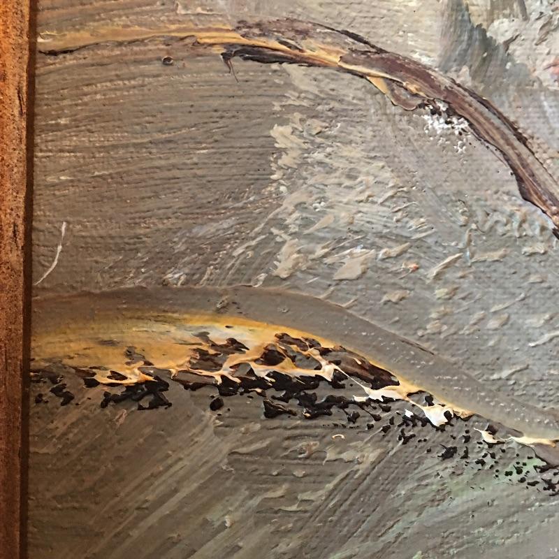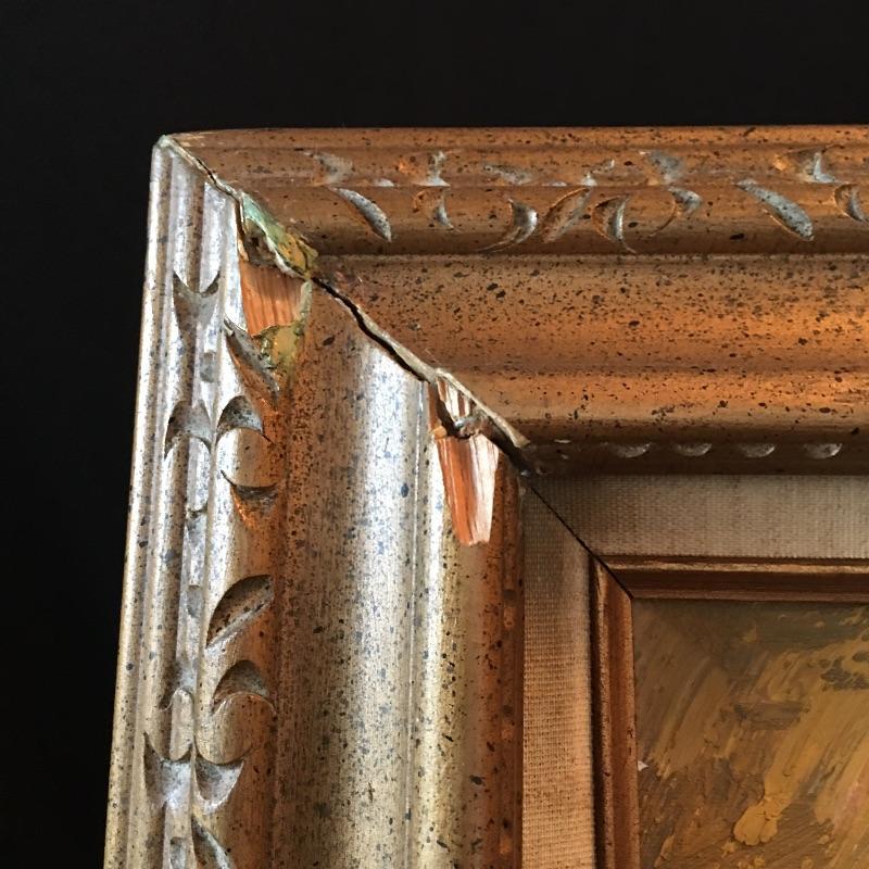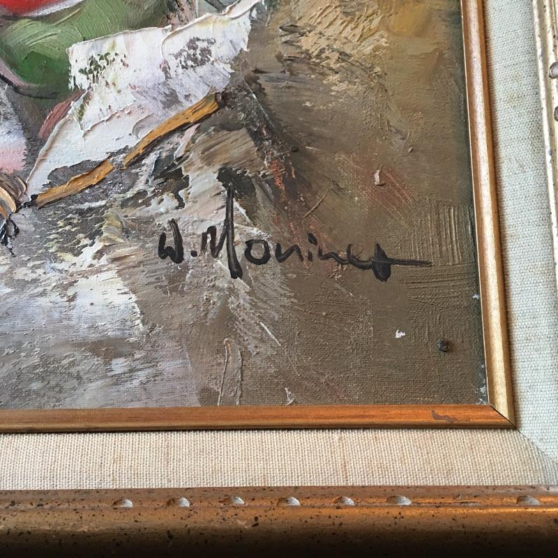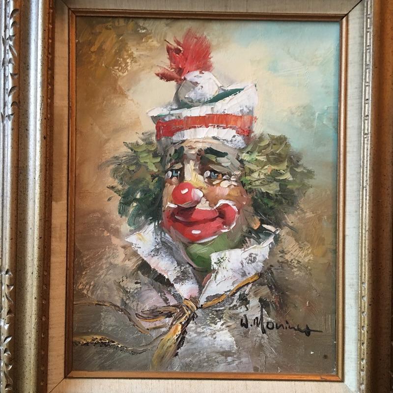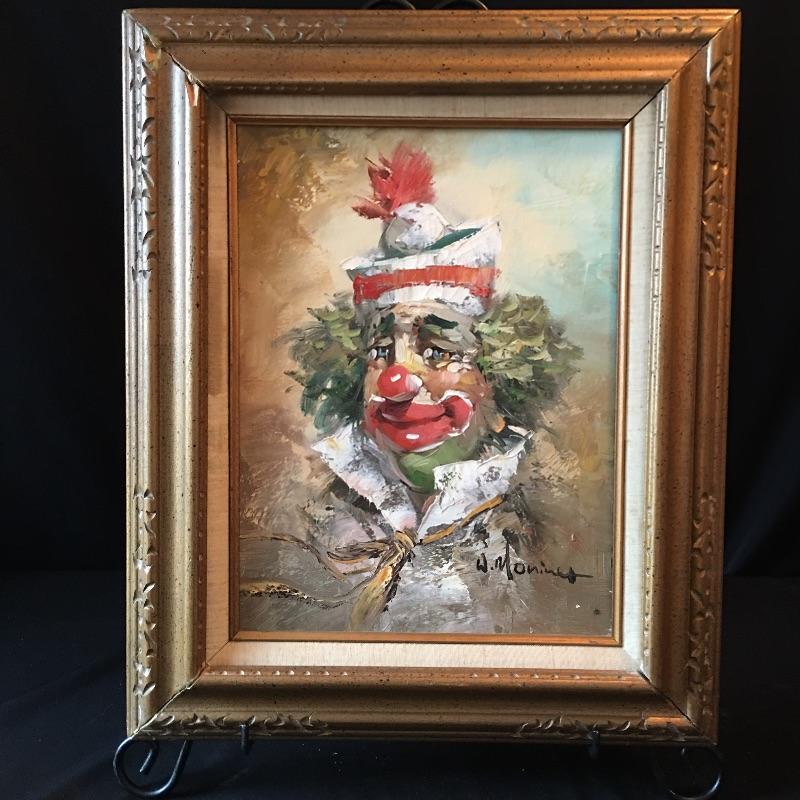 William Moninet framed oil painting. Painted on canvas and appears to be original. According to a quick Internet search on the artist, William Moninet was an American impressionist artist, (1937 - 1999) born in Louisiana. He's widely known for his oil paintings of clowns. Frame measures 19” x 23” and has a few chips, see pictures.