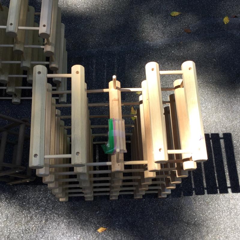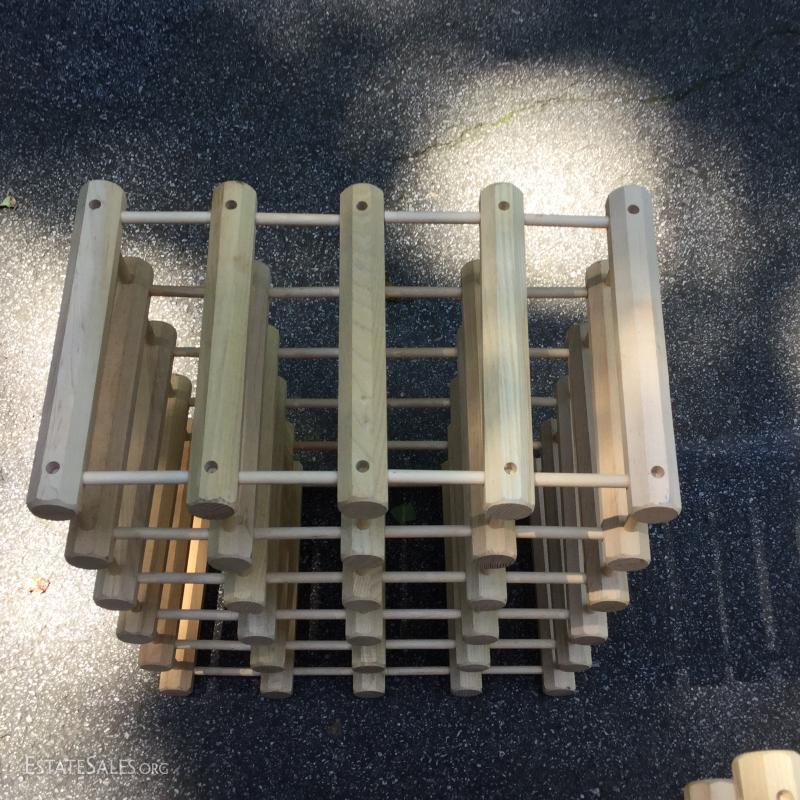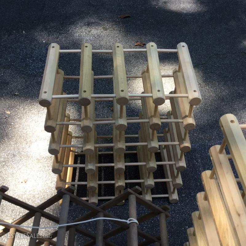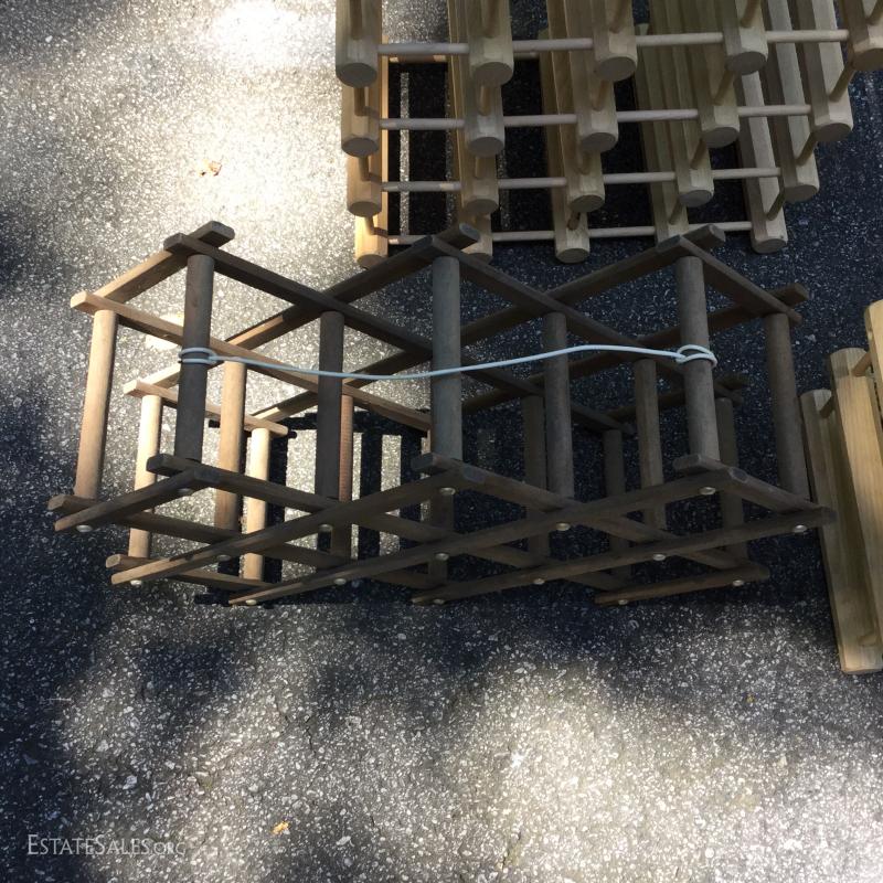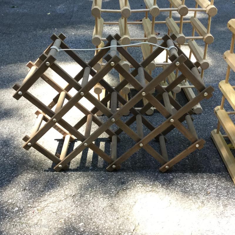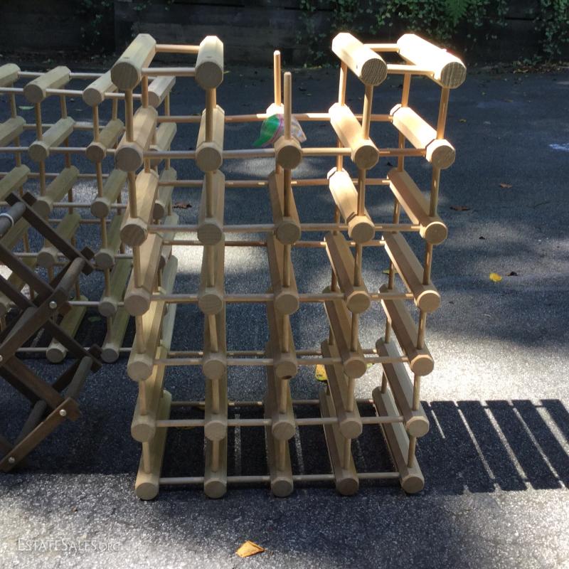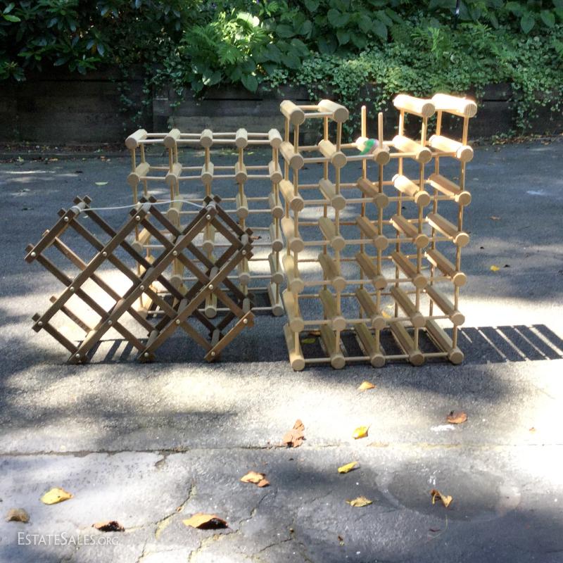 Wine racks to hold your treasured wine collection. Smallest is 22"l x 16"h when opened. Medium 22"l x 18"w, large 26"l x 17.5"w. Largest is missing one piece on edge. See pic.