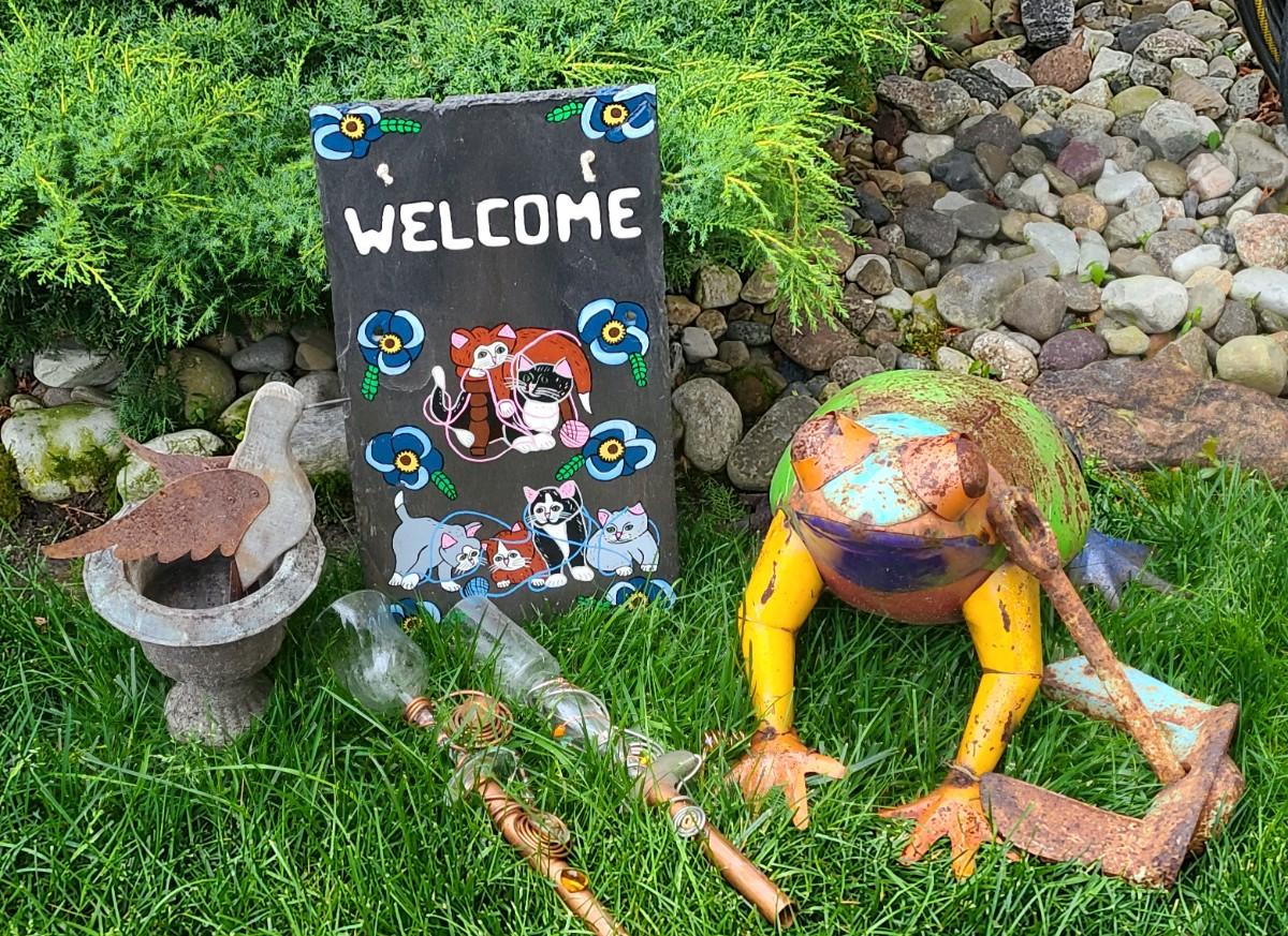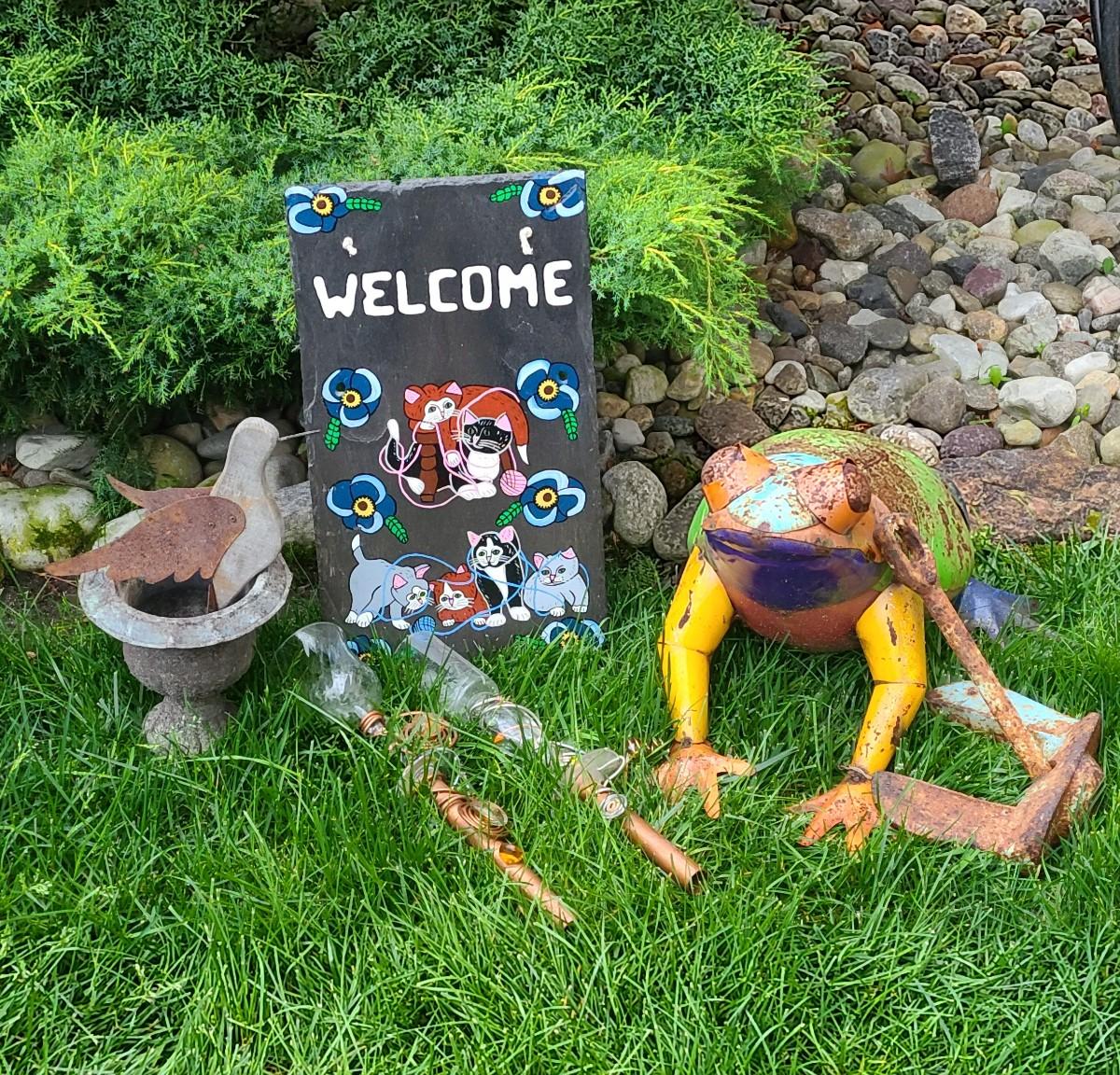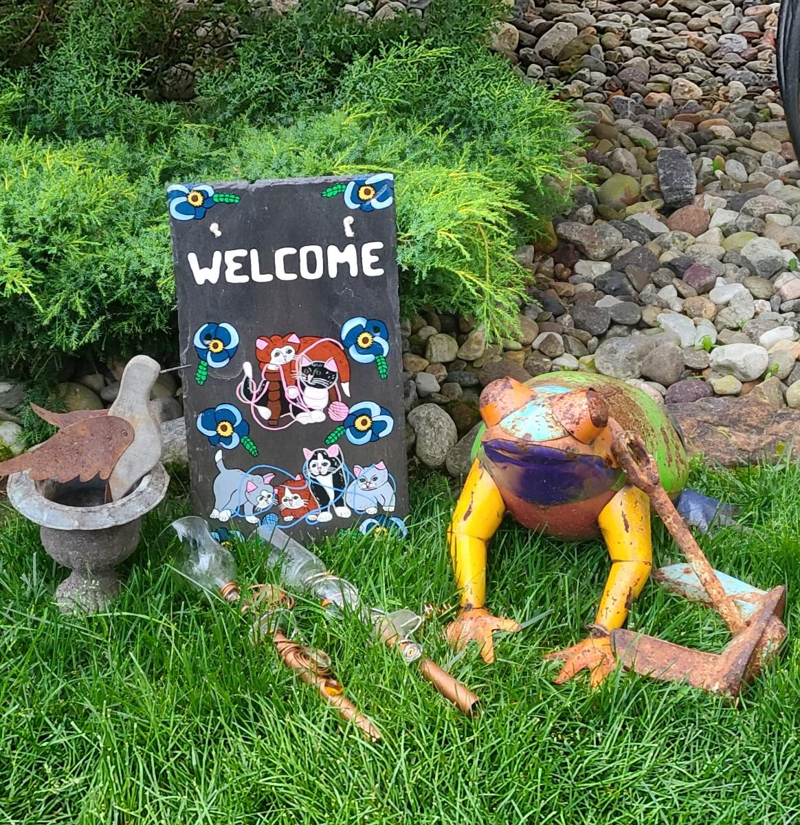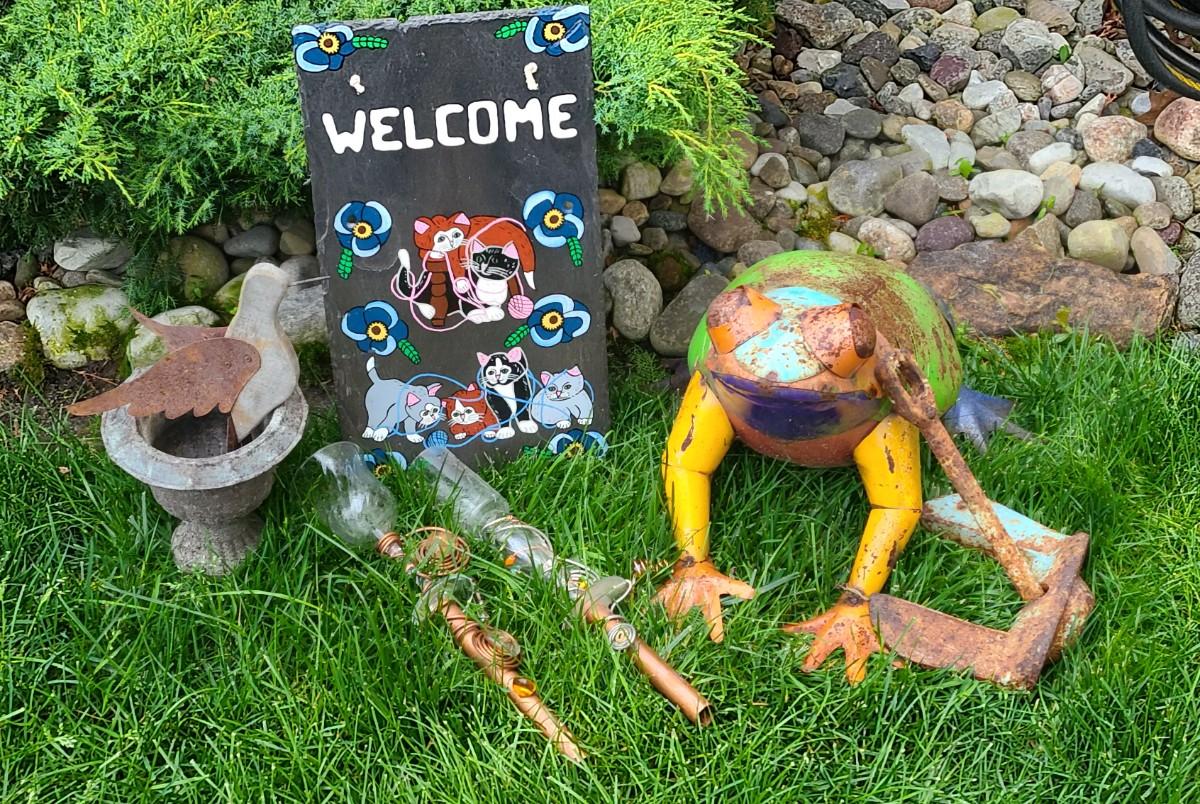 Yard decor: small metal planter, rusty colorful frog, copper upcycled wine glass yard sticks as bird feeders, and old anchor, and slate cat welcome sign. Please see all pictures for content of the lot, condition of the lot, and measurements if taken. Pictures are the best representation of the items listed and items are untested unless indicated in description. Thank you for looking and have fun bidding!