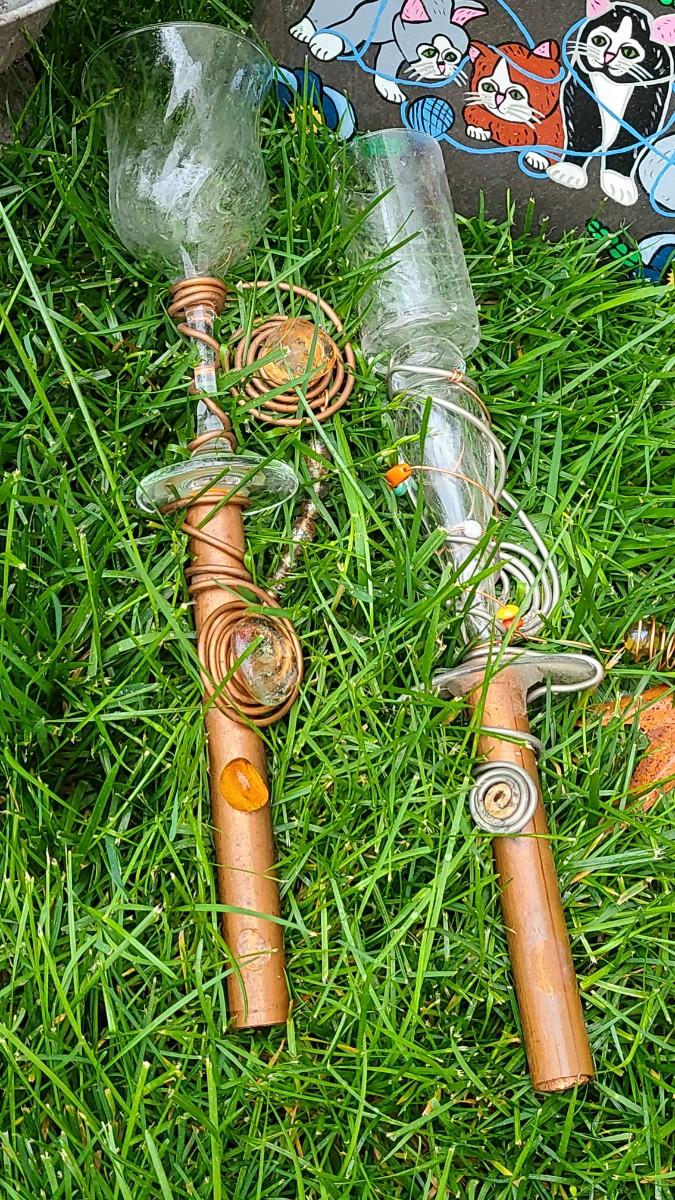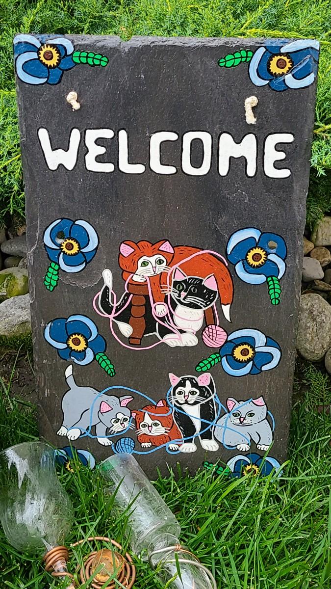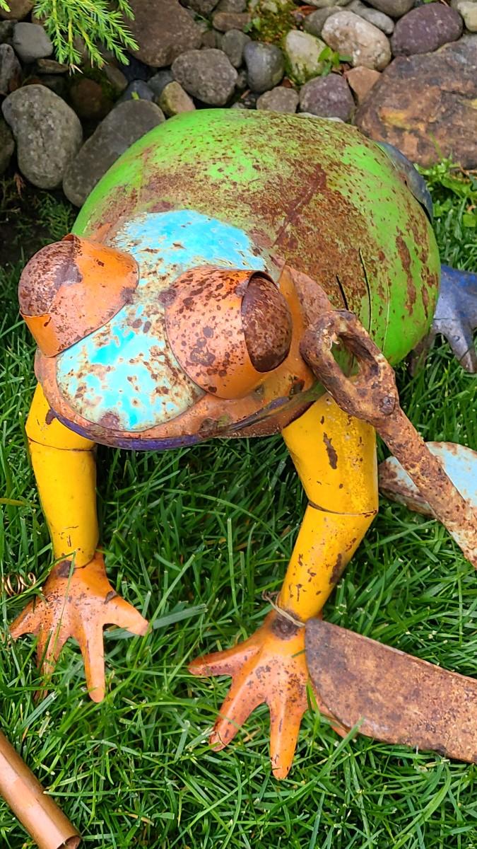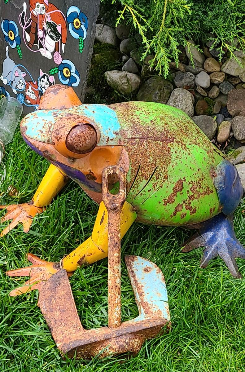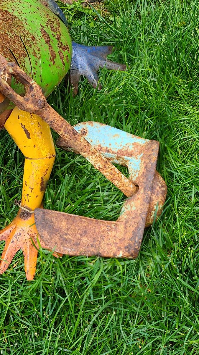 Yard decor: small metal planter, rusty colorful frog, copper upcycled wine glass yard sticks as bird feeders, and old anchor, and slate cat welcome sign. Please see all pictures for content of the lot, condition of the lot, and measurements if taken. Pictures are the best representation of the items listed and items are untested unless indicated in description. Thank you for looking and have fun bidding!